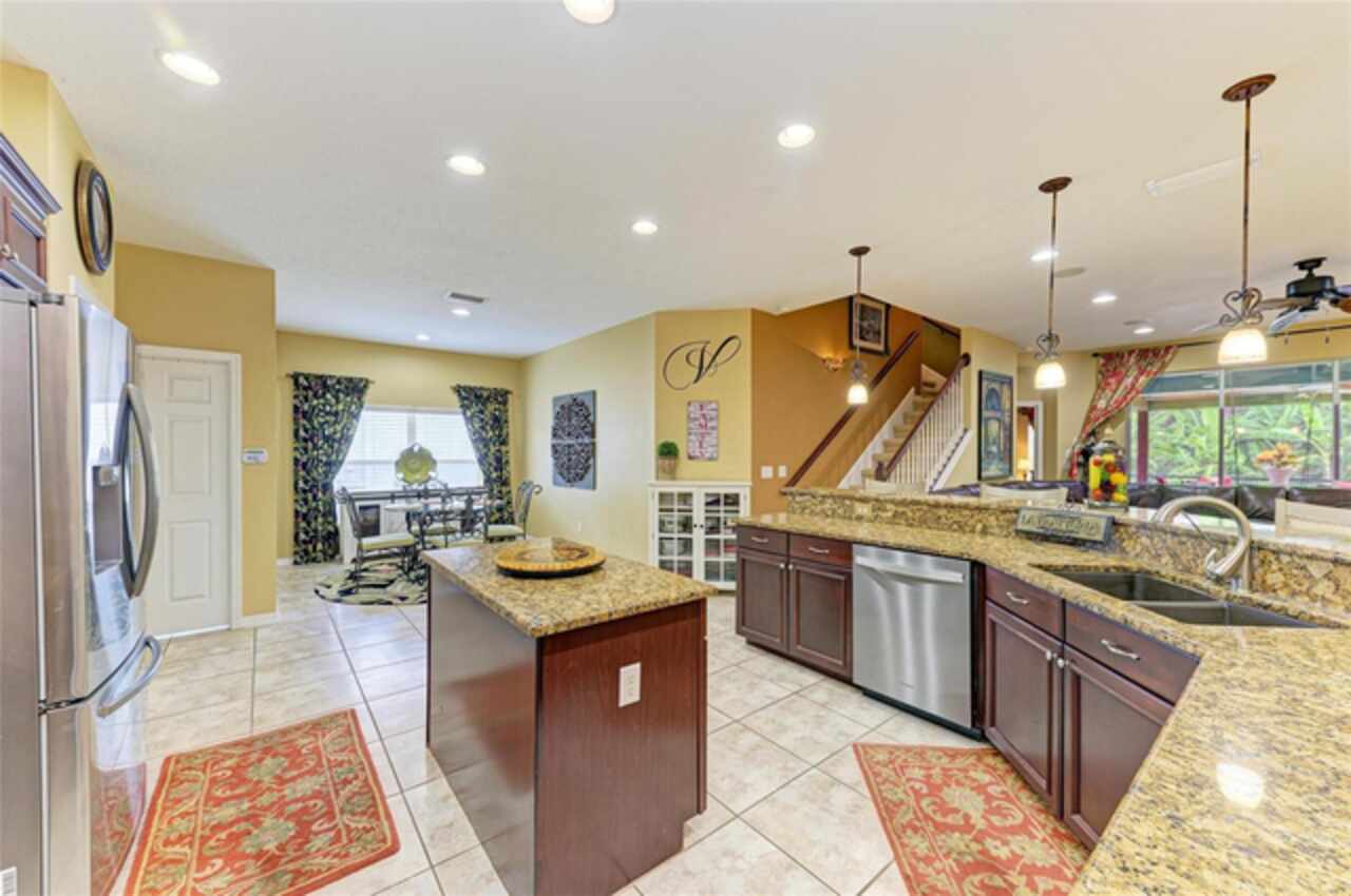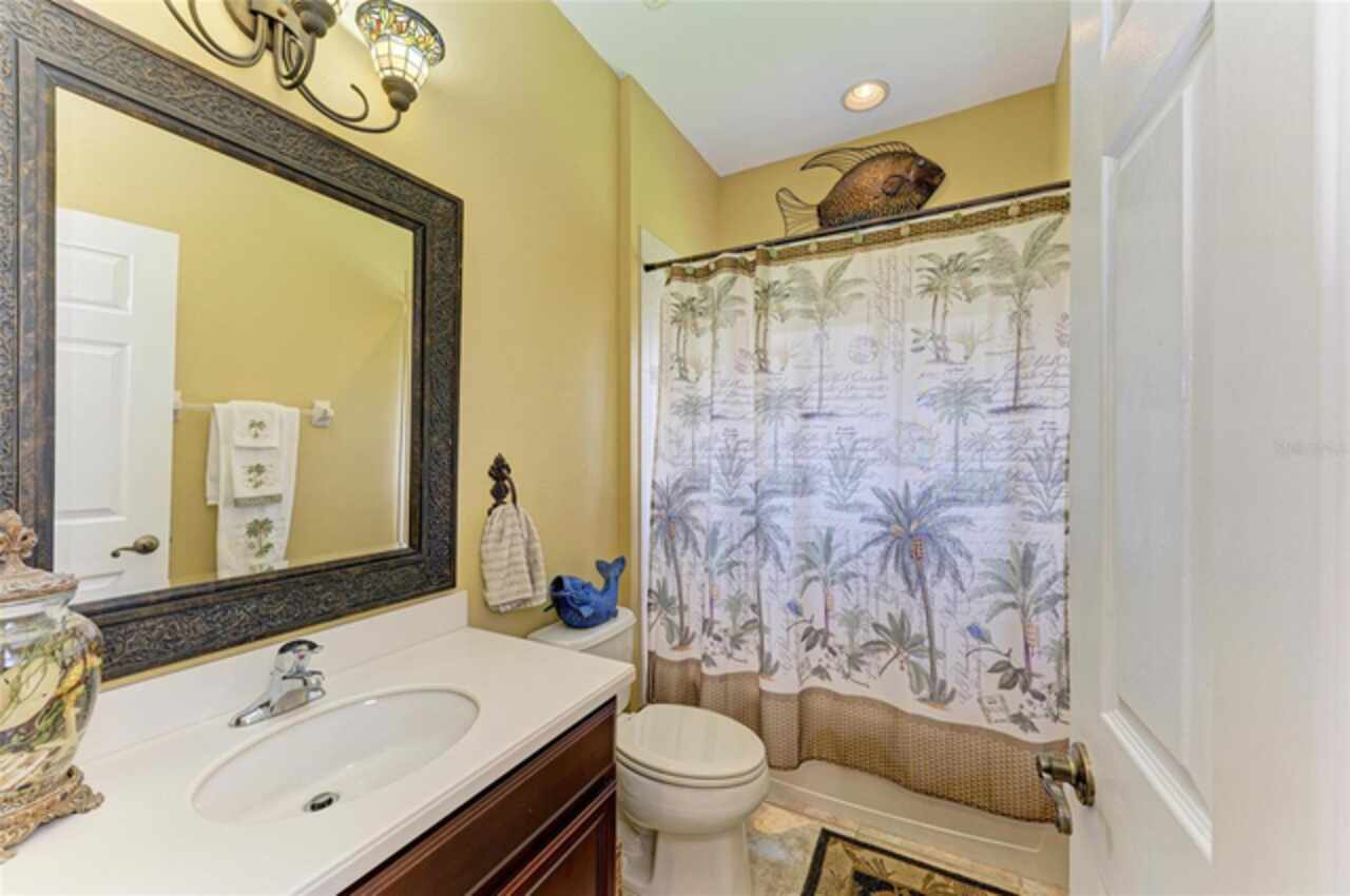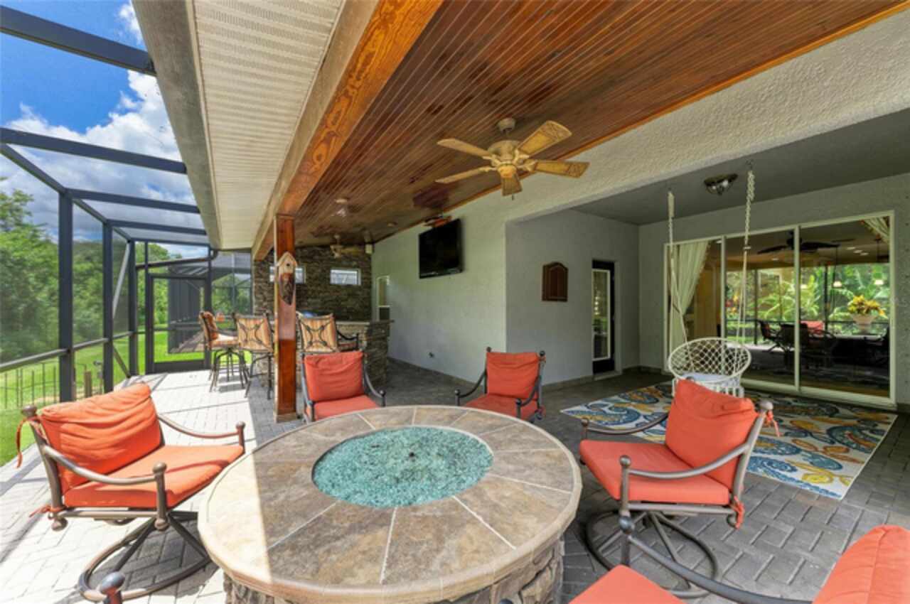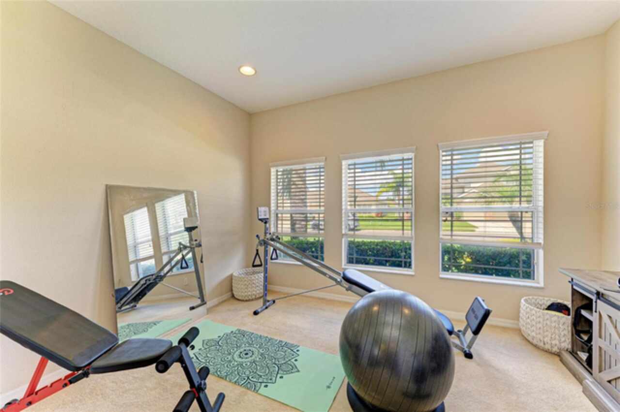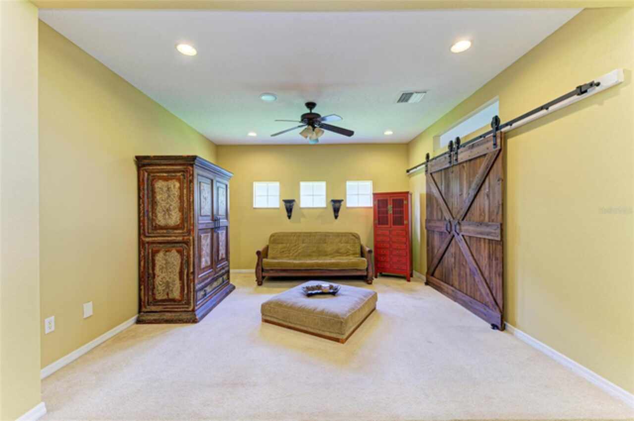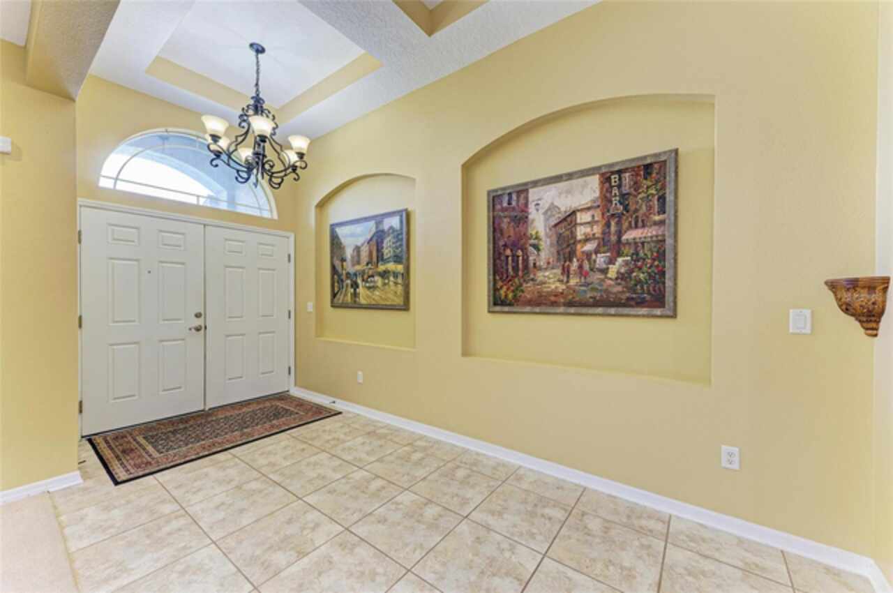 Welcome to this stunning 4-bedroom, 3-bathroom home, featuring a den with sliding barn doors and a spacious bonus room, all nestled on a private preserve lot. Enjoy outdoor living at its finest with an extended lanai that includes a portable hot tub, gas firepit table, and a fully equipped outdoor kitchen with grill, refrigerator, sink, and a large bar—perfect for entertaining. Inside, the gourmet kitchen boasts dark cabinetry with crown molding and valance, undercabinet lighting, granite countertops, center island, stainless steel appliances, and a reverse osmosis system. A large breakfast bar opens to the spacious great room, which features custom built-in shelving and TV unit and overlooks the lanai. The primary suite, located on the main floor, offers two closets and a luxurious bath with granite dual vanities, walk-in shower, and a jetted soaking tub. Bedrooms feature cozy carpeting, while tile flooring runs throughout the main living areas. Updates include new roof 2023, HVAC 2019, a buried 120-gallon propane tank connected to firepit 2019, water heater 2020, water purification system, exterior painting to include etched driveway. Community amenities include a clubhouse, pool, fitness center, playground, and sports court. HOA includes basic cable and internet. Situated in a highly desirable location with easy access to St. Pete, Tampa, Downtown Sarasota, and just minutes from Parrish Community Park, Ellenton Outlet Mall, UTC shopping, and the new Publix Plaza featuring Foxtail Coffee, restaurants, and services. Future developments in the area include a 200-bed trauma hospital, Home Depot, Chick-fil-A, Slim Chickens, and access to an exciting Lagoon community.