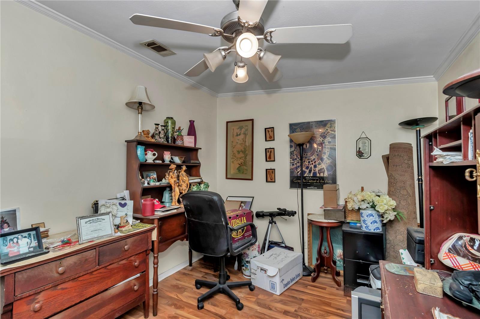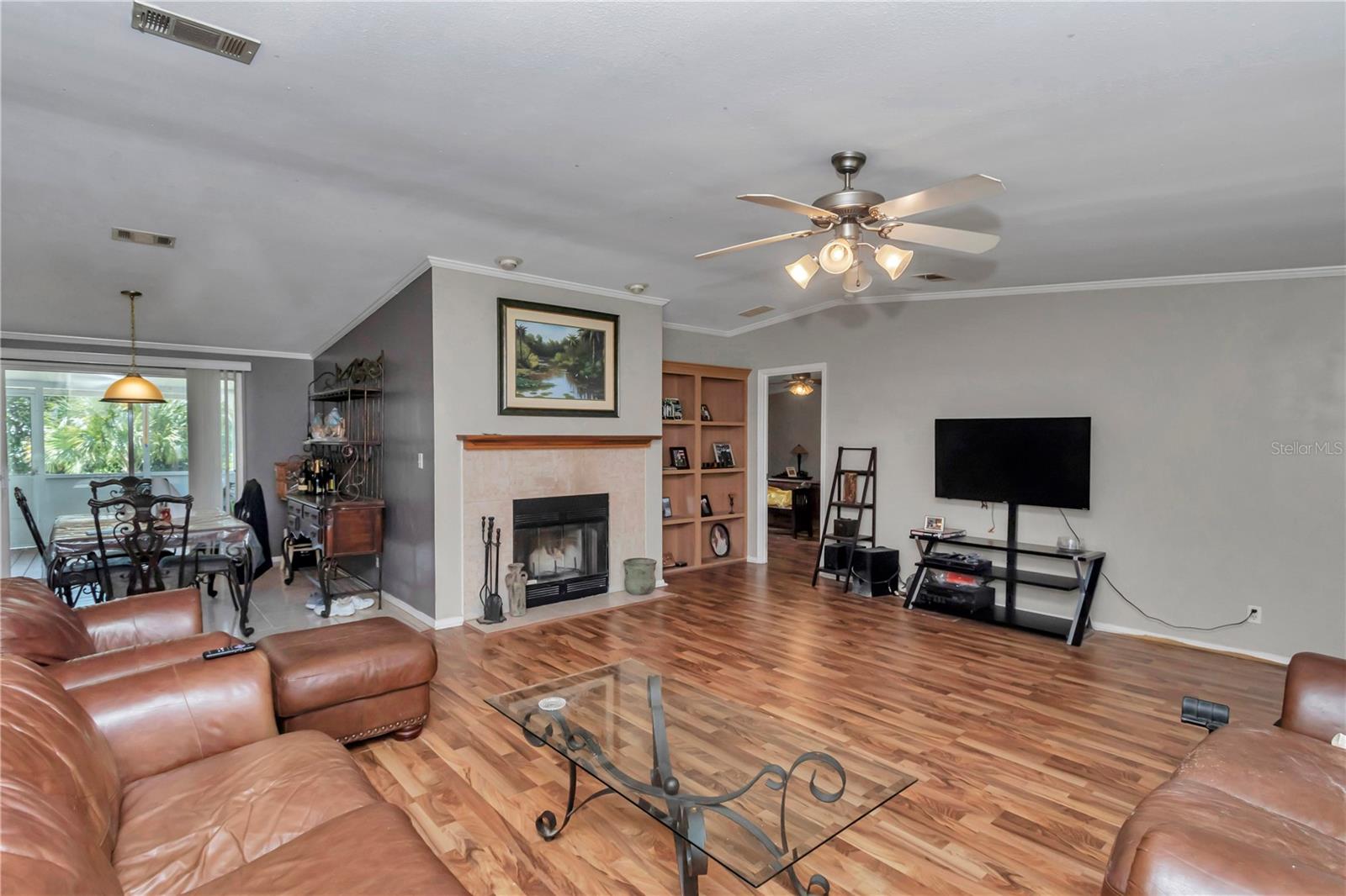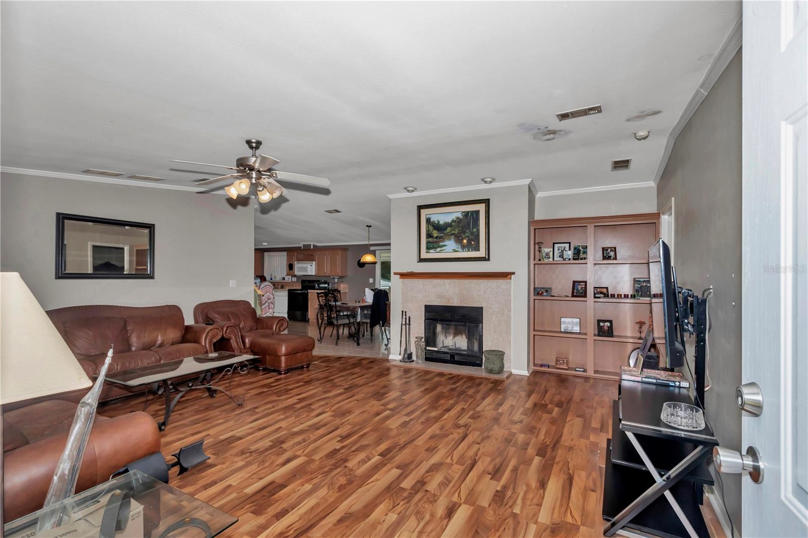 Built-in Features, Ceiling Fans(s), Crown Molding, Eat-in Kitchen, High Ceilings, Living Room/Dining Room Combo, Open Floorplan, Primary Bedroom Main Floor, Thermostat, Walk-In Closet(s)