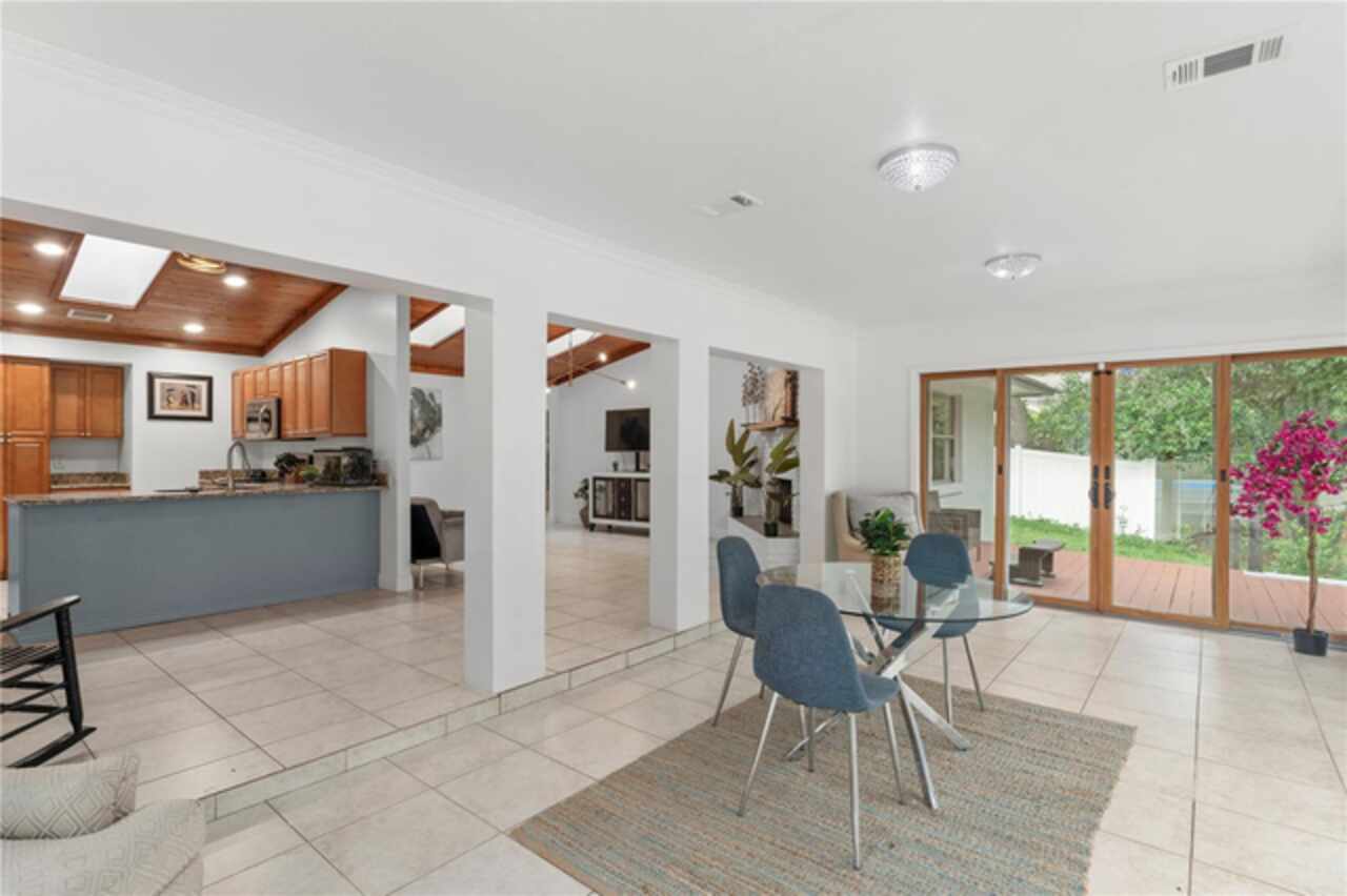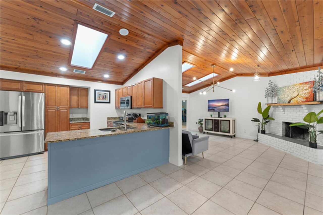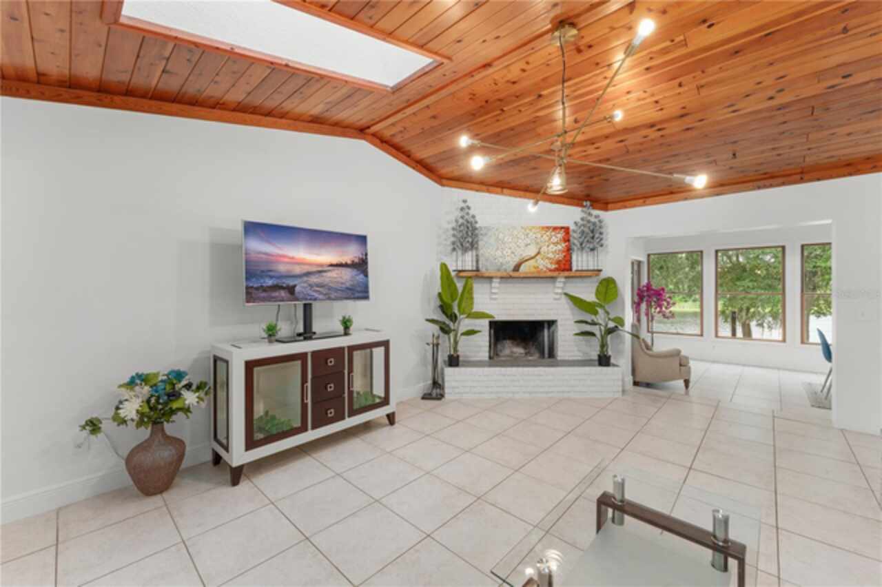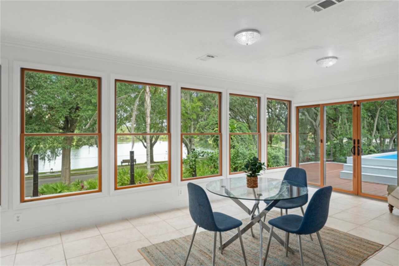 Water views abound from this chic, bright, and lovely Winderlakes home. The house sits perched above a picturesque, tranquil pond nestled in the highly sought-after Dr. Phillips area. Tucked away on a quiet cul-de-sac, the residence blends modern elegance with timeless charm, featuring natural wood slat accent walls, large windows, generous spaces, and an open floor plan. The living room and dining room offer a welcoming entrance and set the stage for hosting gatherings of any size. The modern kitchen has a perfect view of the lake, adding a touch of comfort in making any meal. The kitchen also features stainless steel appliances, granite countertops, custom cabinetry, and a breakfast bar. The family room is accented by dual skylights, a brick fireplace, a stylish gold chandelier - plus tile flooring flowing seamlessly into a sunroom that provides an abundance of sunshine-filled space. Bask in the outdoors from your newly refreshed, saltwater pool embedded into an oversized wrap-around deck. Practical upgrades include brand-new pool equipment, a one-year-old 5-ton AC unit, additional blown-in insulation, PEX plumbing, a tankless water heater, and high-end Square D circuit breakers with a 200-amp service panel. Located within close proximity to top-rated K-8 Windy Ridge STEM school. The perfect combination of an ideal location, sought-after community, and refined home – all wonderfully packaged to create a lifetime of memories.