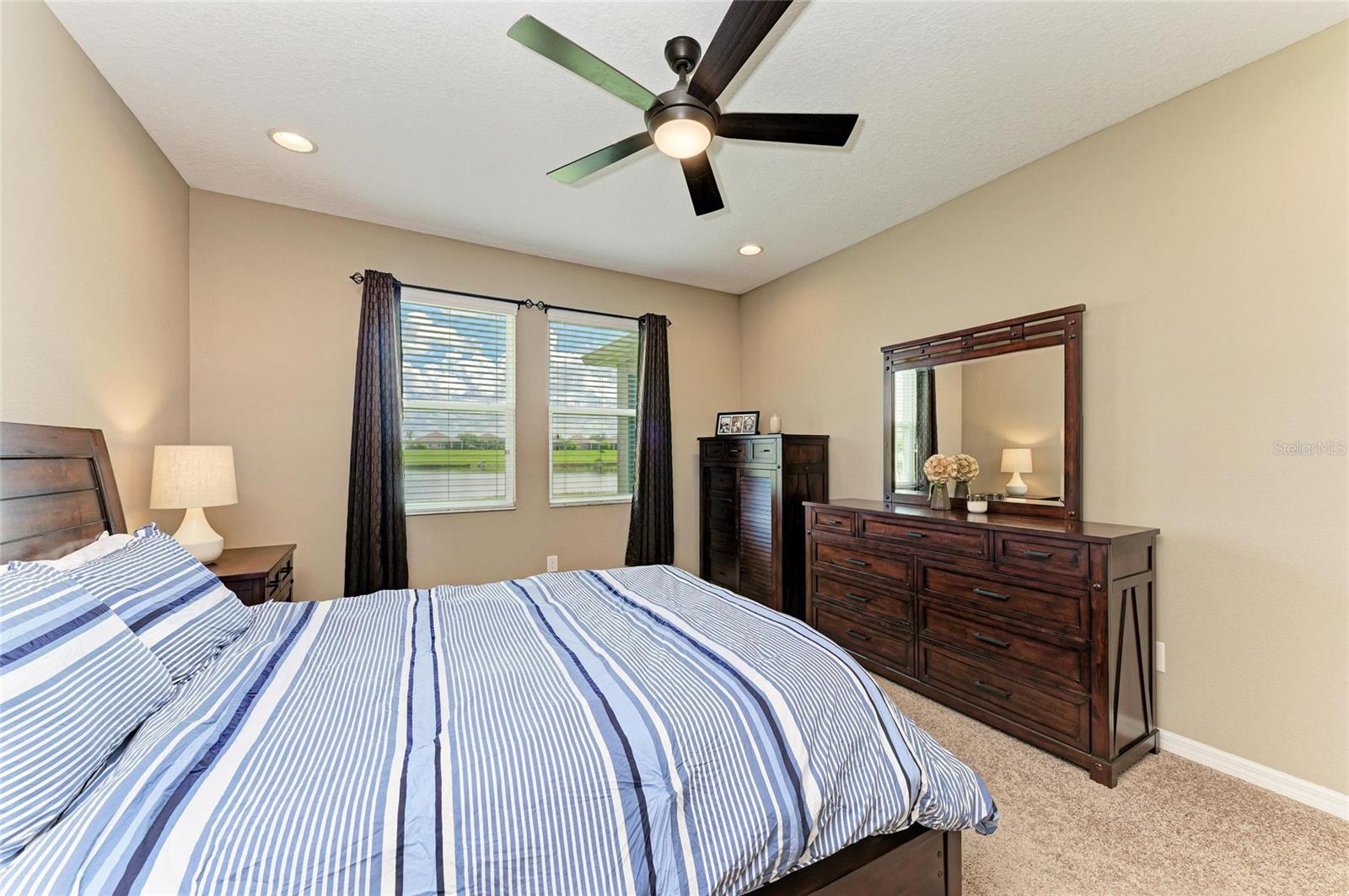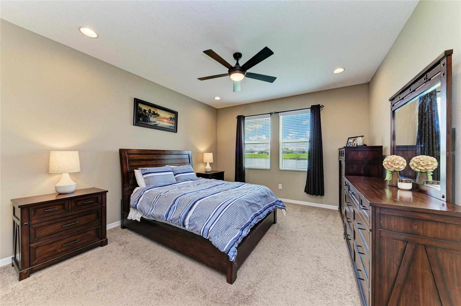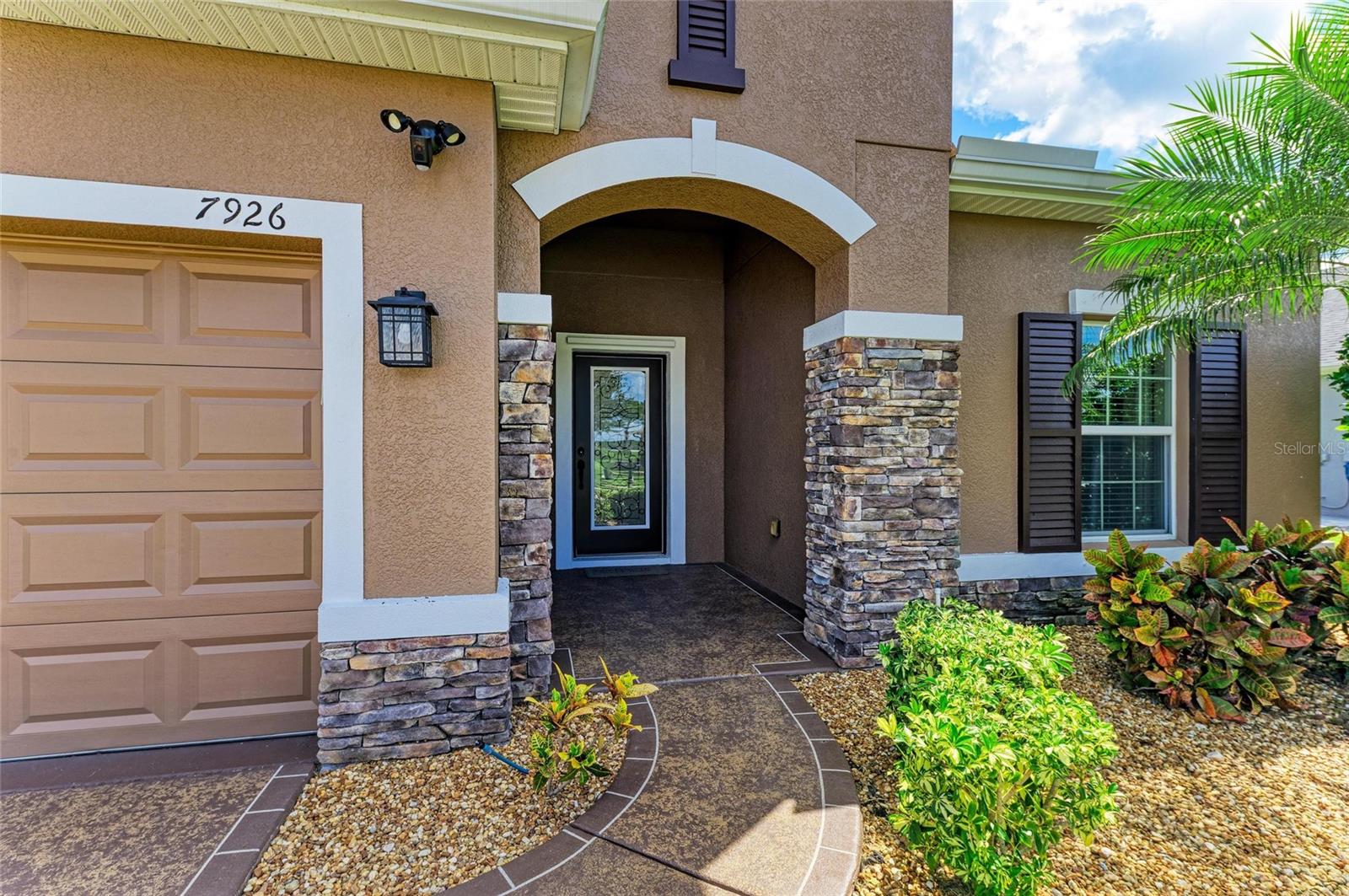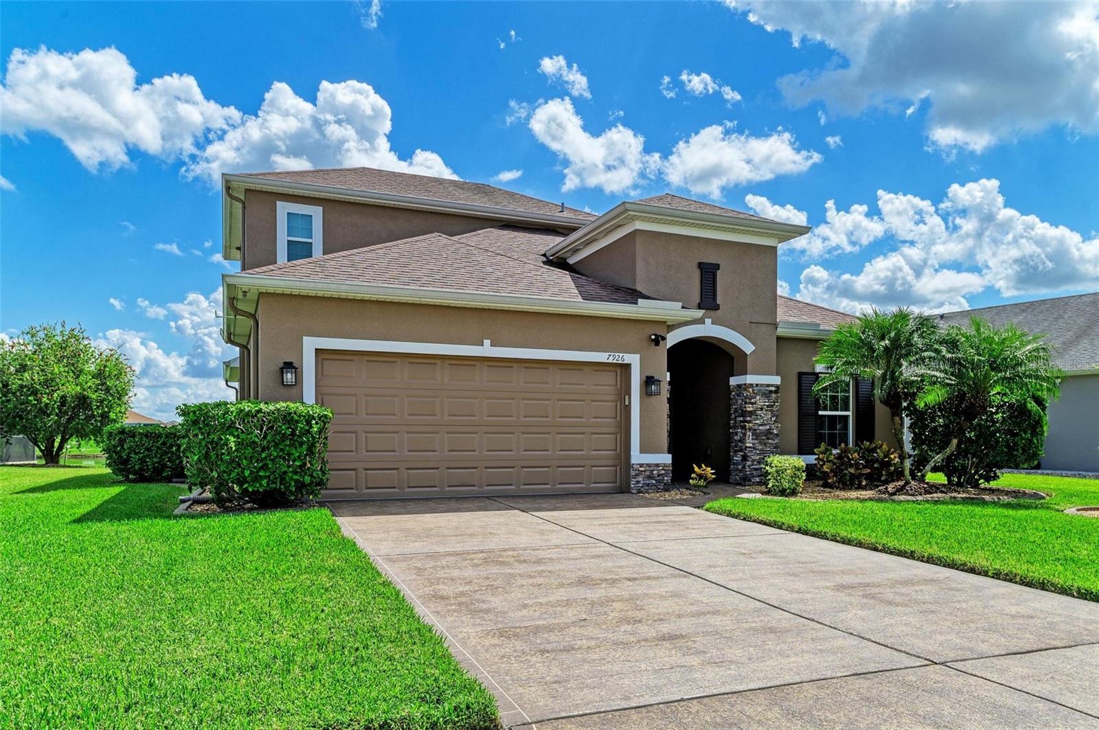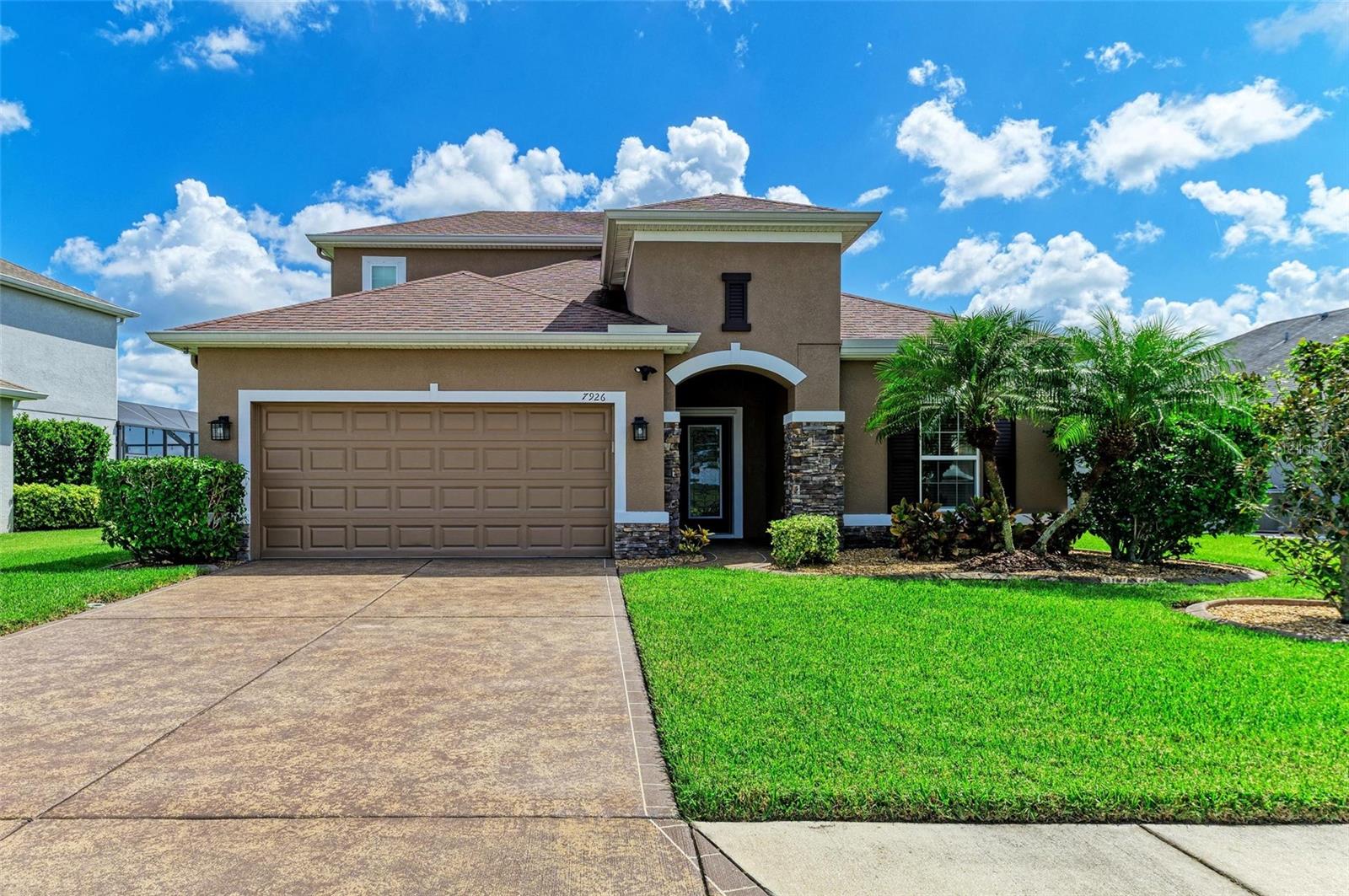 Welcome to this beautifully maintained 4-bedroom, 3-bathroom home with a 2-car garage and nearly 2, 400 sq ft of living space, located in the highly desirable gated community of Copperstone. From the moment you arrive, you’ll notice the professional landscape curbing, a decorative stained driveway, and a stunning glass front door. Inside, the home features a split floor plan with the master suite privately tucked away and offering peaceful water views, a spacious walk-in closet, and a spa-like bath with dual sinks, granite countertops, and a tiled walk-in shower. On the opposite end of the home, you’ll find three additional bedrooms along with a full bathroom featuring dual sinks, granite counters, and a tiled shower/tub combo. The main living areas are finished with tile flooring throughout for easy care and style. The gourmet kitchen overlooks the family room, making it perfect for entertaining. The kitchen is equipped with granite countertops, pendant lighting, a tiled backsplash, stainless steel appliances, and tall espresso cabinets with crown molding. Just off the kitchen, enjoy easy access to the screened lanai, where you can relax and take in sunrises over the water. The oversized backyard has plenty of room for a pool and can be fenced for additional privacy. Upstairs, a large bonus area with a full bathroom offers endless possibilities—ideal for a home theater, playroom, or guest suite. Additional features include gutters, hurricane shutters, and an irrigation system. The home is ideally situated on a quiet dead-end street with minimal traffic for added peace of mind. Copperstone residents enjoy a wealth of community amenities including two resort-style pools, a playground, sport courts, a clubhouse, and secure gated access and as an added bonus basic cable and internet are included in the HOA fees. Families will love being within walking distance to a new elementary school and high school. Perfectly located, Copperstone is just minutes from shopping, dining, Fort Hamer boat launch, and two new county parks. With quick access to I-75, you’ll be at the beaches, Tampa, St. Pete, Sarasota, or two major airports within 45 minutes or less. This home offers the perfect balance of space, style, and community living. Don’t miss your chance to call Copperstone home!