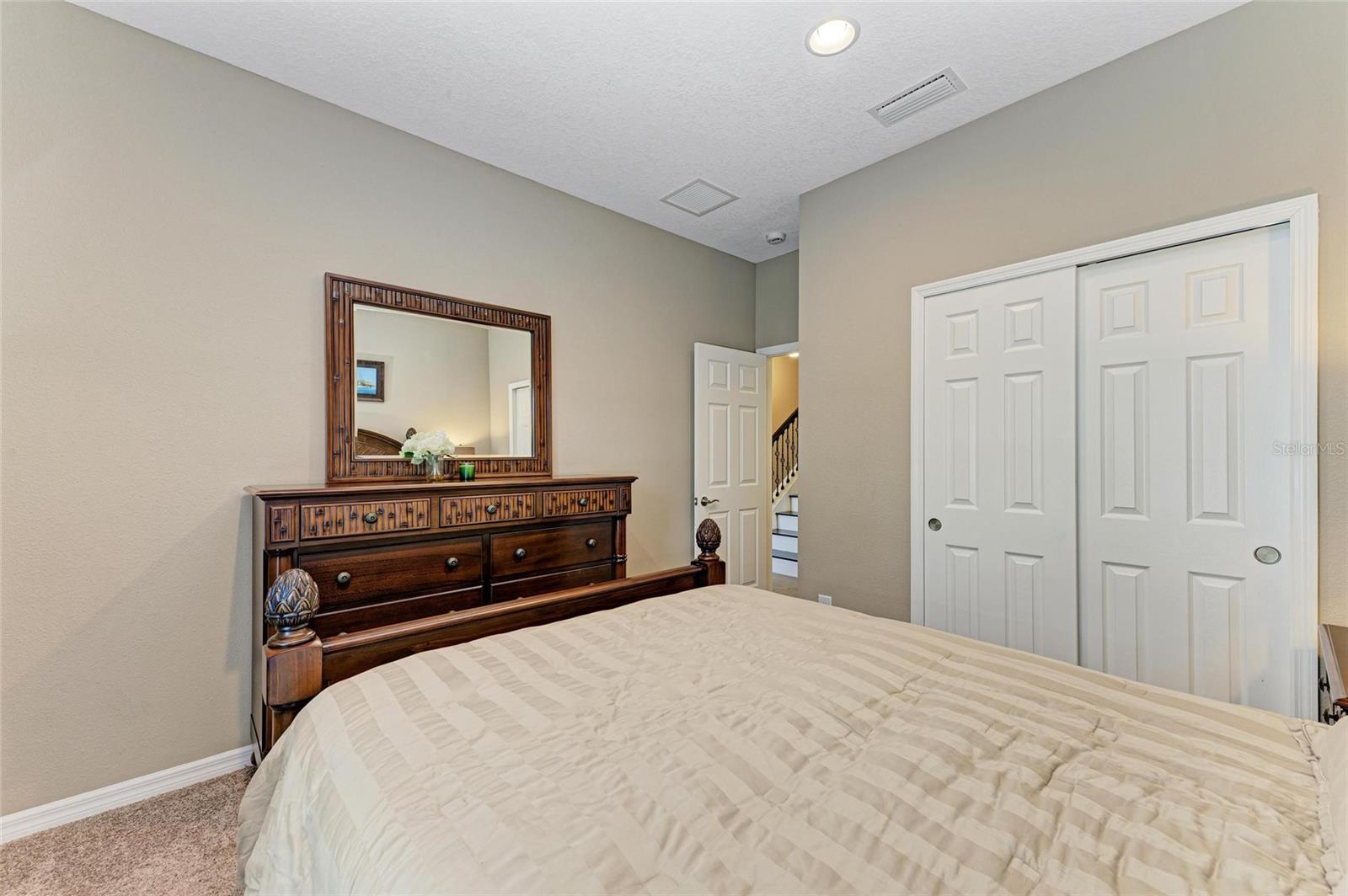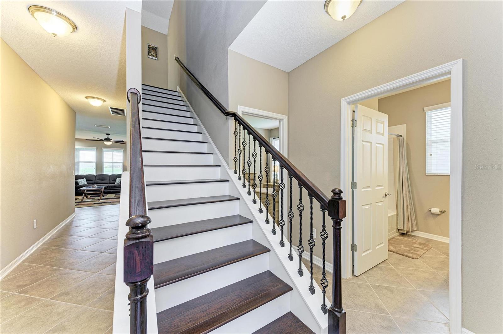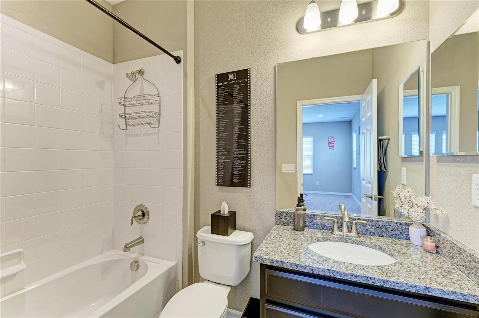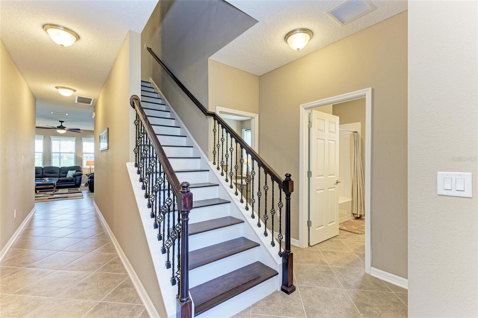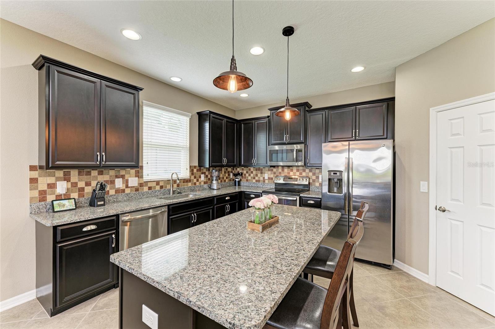 Welcome to this beautifully maintained 4-bedroom, 3-bathroom home with a 2-car garage and nearly 2, 400 sq ft of living space, located in the highly desirable gated community of Copperstone. From the moment you arrive, you’ll notice the professional landscape curbing, a decorative stained driveway, and a stunning glass front door. Inside, the home features a split floor plan with the master suite privately tucked away and offering peaceful water views, a spacious walk-in closet, and a spa-like bath with dual sinks, granite countertops, and a tiled walk-in shower. On the opposite end of the home, you’ll find three additional bedrooms along with a full bathroom featuring dual sinks, granite counters, and a tiled shower/tub combo. The main living areas are finished with tile flooring throughout for easy care and style. The gourmet kitchen overlooks the family room, making it perfect for entertaining. The kitchen is equipped with granite countertops, pendant lighting, a tiled backsplash, stainless steel appliances, and tall espresso cabinets with crown molding. Just off the kitchen, enjoy easy access to the screened lanai, where you can relax and take in sunrises over the water. The oversized backyard has plenty of room for a pool and can be fenced for additional privacy. Upstairs, a large bonus area with a full bathroom offers endless possibilities—ideal for a home theater, playroom, or guest suite. Additional features include gutters, hurricane shutters, and an irrigation system. The home is ideally situated on a quiet dead-end street with minimal traffic for added peace of mind. Copperstone residents enjoy a wealth of community amenities including two resort-style pools, a playground, sport courts, a clubhouse, and secure gated access and as an added bonus basic cable and internet are included in the HOA fees. Families will love being within walking distance to a new elementary school and high school. Perfectly located, Copperstone is just minutes from shopping, dining, Fort Hamer boat launch, and two new county parks. With quick access to I-75, you’ll be at the beaches, Tampa, St. Pete, Sarasota, or two major airports within 45 minutes or less. This home offers the perfect balance of space, style, and community living. Don’t miss your chance to call Copperstone home!