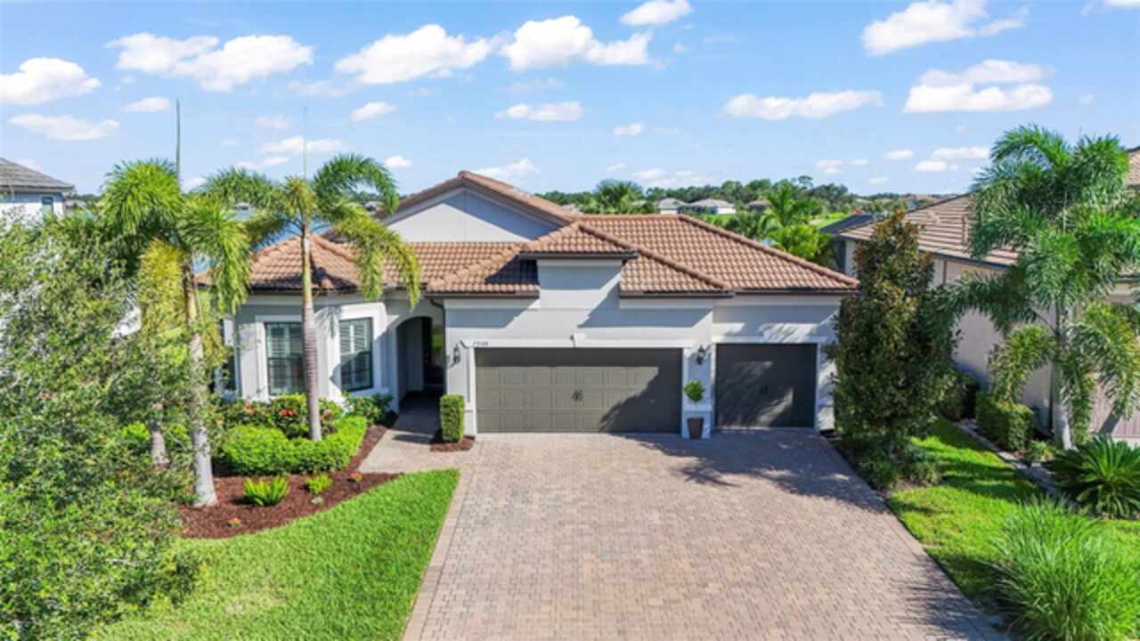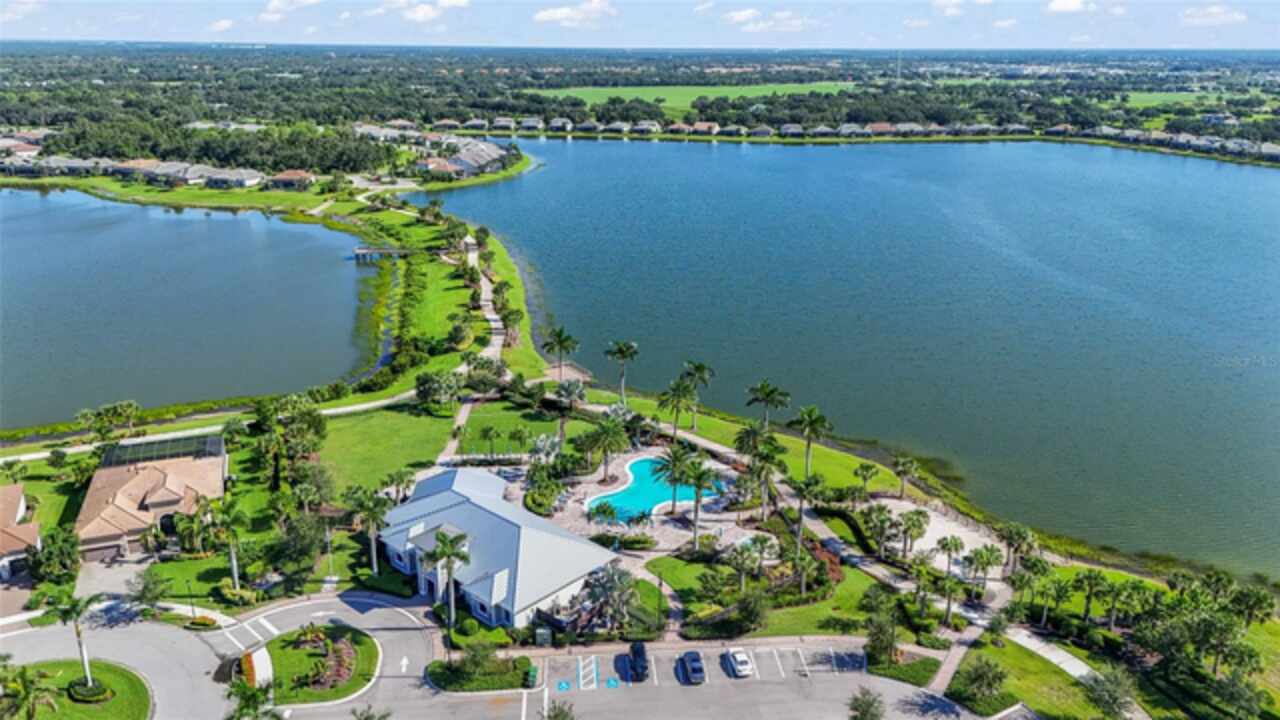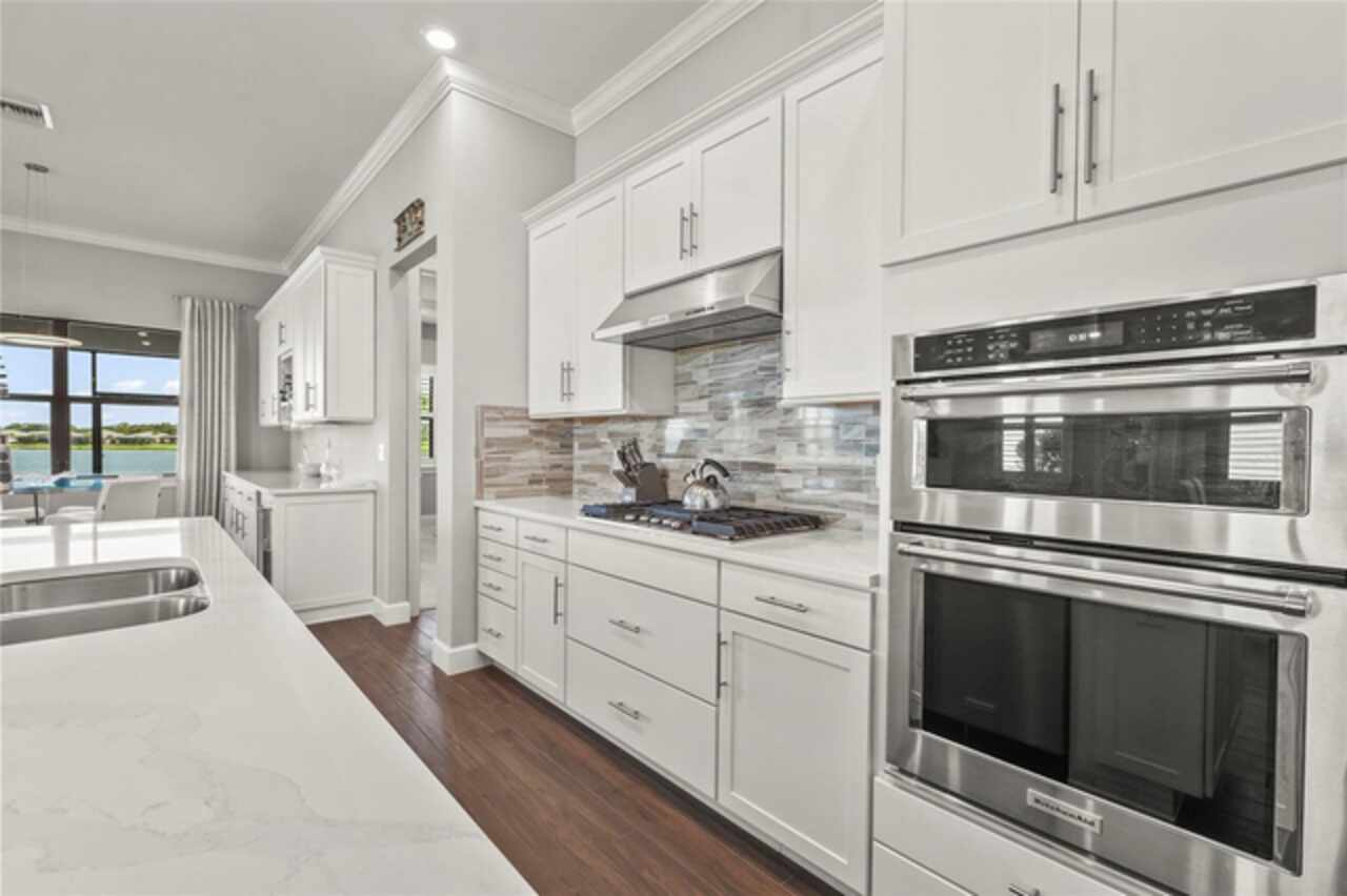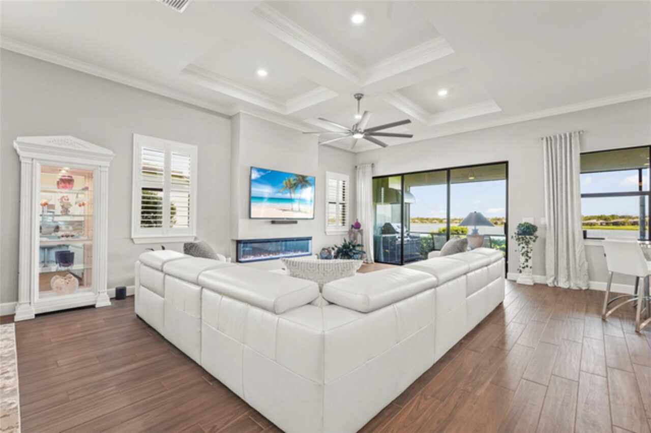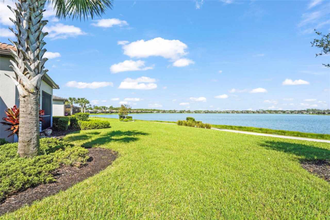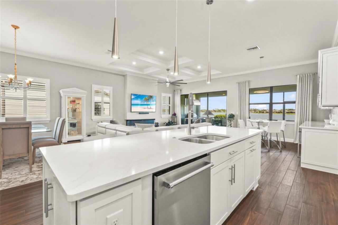 Welcome to luxury living in the sought-after Shoreview at Waterside community! This stunning 3-bedroom, 2-bathroom home offers an exceptional lifestyle with top-tier design elements and captivating water views. Situated on a low-traffic loop with green space across the street and serene water views behind, this residence blends elegance with privacy. Residents enjoy private access to community amenities just across the street in an exclusive enclave. Step inside to find wood-look tile flooring, plantation shutters, and coffered ceilings that add both style and warmth. The spacious primary suite features a custom walk-in closet and a spa-like en-suite bath with dual vanities. A private den/office provides the perfect work-from-home space. The chef’s kitchen impresses with quartz countertops, a KitchenAid stainless-steel appliance suite, gas range, and an arched entryway that opens to the family and dining areas. Enjoy a built-in dry bar and wine station with custom cabinetry, perfect for entertaining. The bump-out family room is anchored by a three-sided fireplace, adding ambiance to multiple spaces. Outdoor living shines with a fully equipped summer kitchen featuring a granite backsplash and stainless-steel countertops, a gas hookup, outdoor hood, and plenty of room to relax or entertain. The 3-car garage with an oversized bay and paver driveway offer both function and curb appeal. Additional highlights include laundry room built-ins, wiring and gas line installed for a future whole-house generator. Don’t miss your opportunity to own this beautifully appointed home in one of Lakewood Ranch’s premier communities.