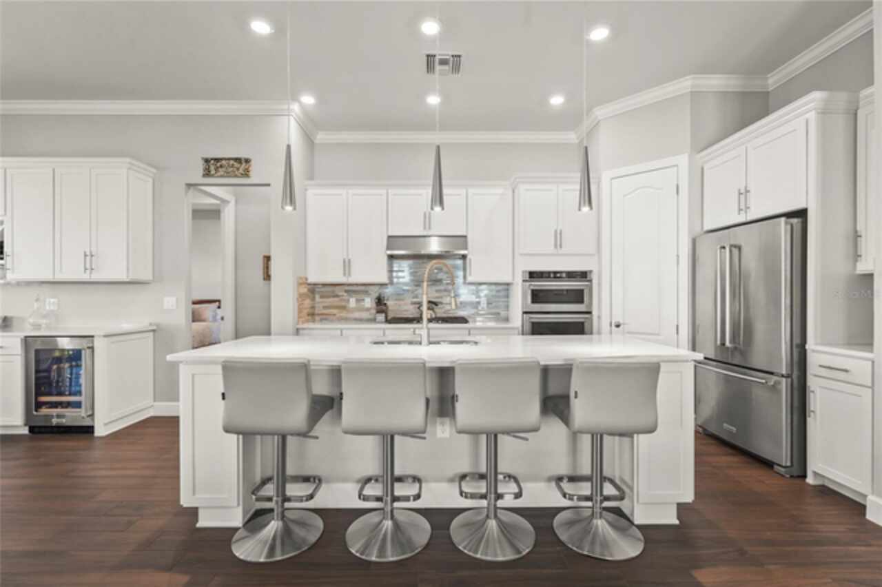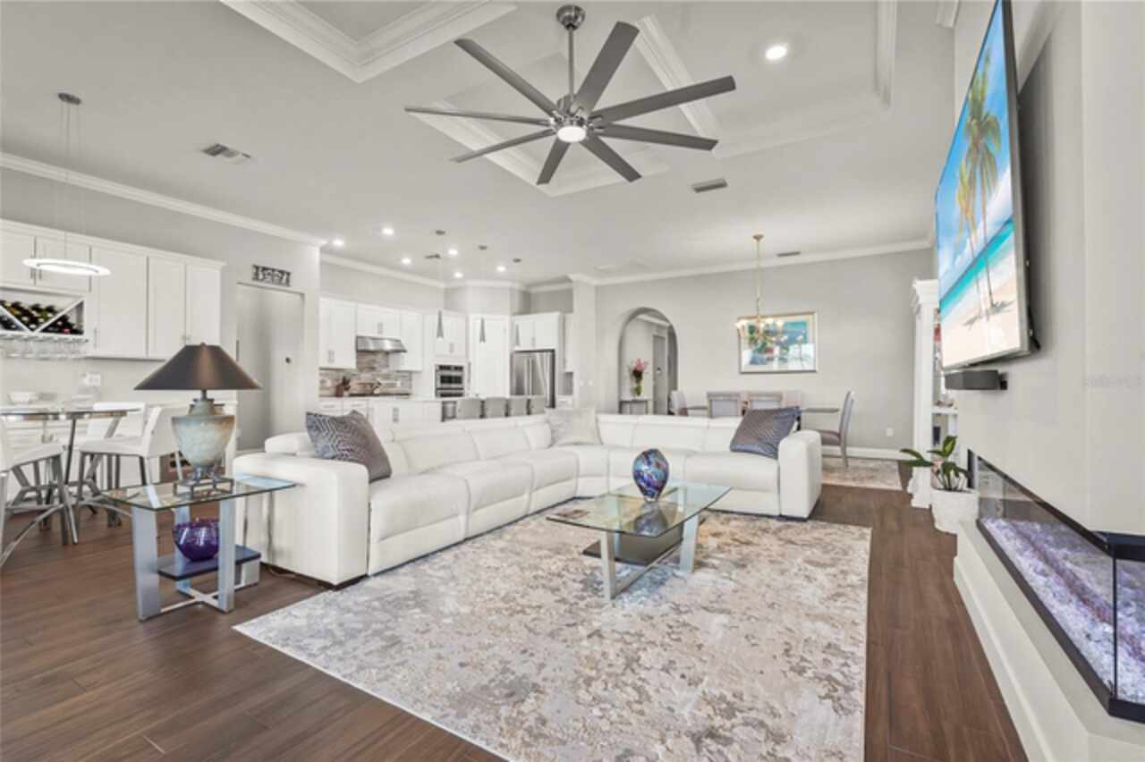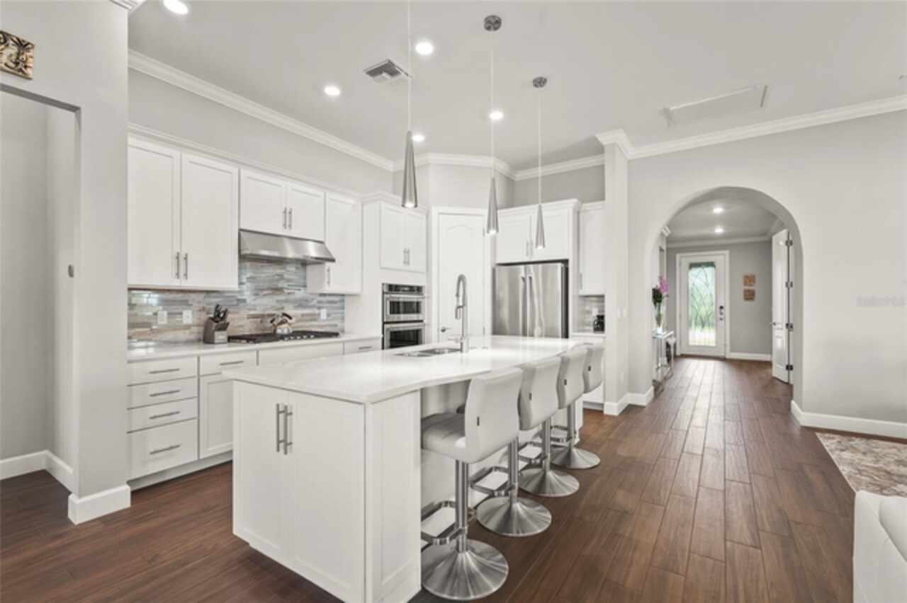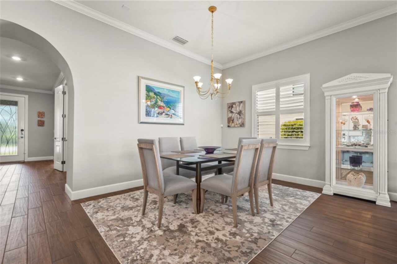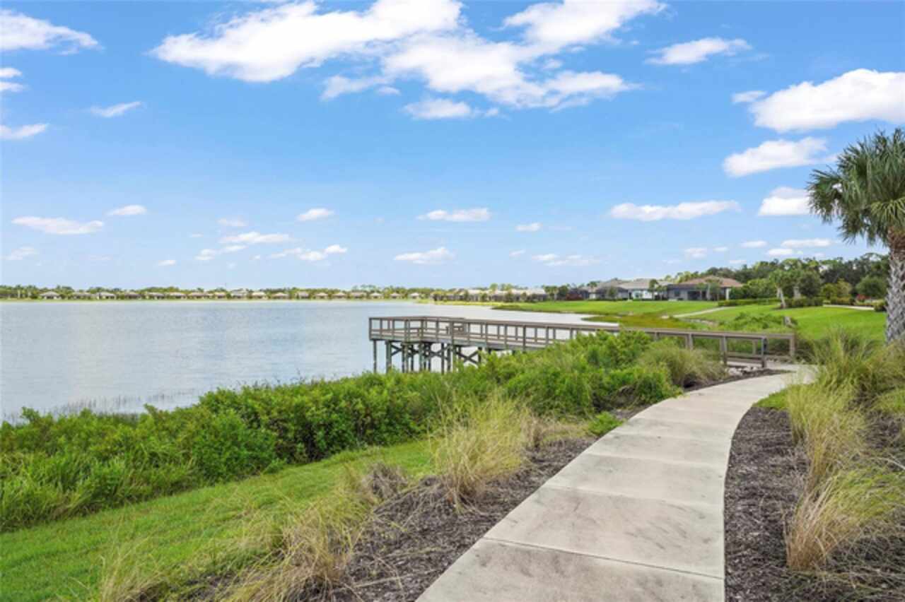 Welcome to luxury living in the sought-after Shoreview at Waterside community! This stunning 3-bedroom, 2-bathroom home offers an exceptional lifestyle with top-tier design elements and captivating water views. Situated on a low-traffic loop with green space across the street and serene water views behind, this residence blends elegance with privacy. Residents enjoy private access to community amenities just across the street in an exclusive enclave. Step inside to find wood-look tile flooring, plantation shutters, and coffered ceilings that add both style and warmth. The spacious primary suite features a custom walk-in closet and a spa-like en-suite bath with dual vanities. A private den/office provides the perfect work-from-home space. The chef’s kitchen impresses with quartz countertops, a KitchenAid stainless-steel appliance suite, gas range, and an arched entryway that opens to the family and dining areas. Enjoy a built-in dry bar and wine station with custom cabinetry, perfect for entertaining. The bump-out family room is anchored by a three-sided fireplace, adding ambiance to multiple spaces. Outdoor living shines with a fully equipped summer kitchen featuring a granite backsplash and stainless-steel countertops, a gas hookup, outdoor hood, and plenty of room to relax or entertain. The 3-car garage with an oversized bay and paver driveway offer both function and curb appeal. Additional highlights include laundry room built-ins, wiring and gas line installed for a future whole-house generator. Don’t miss your opportunity to own this beautifully appointed home in one of Lakewood Ranch’s premier communities.