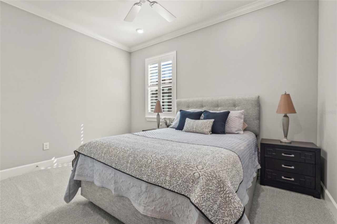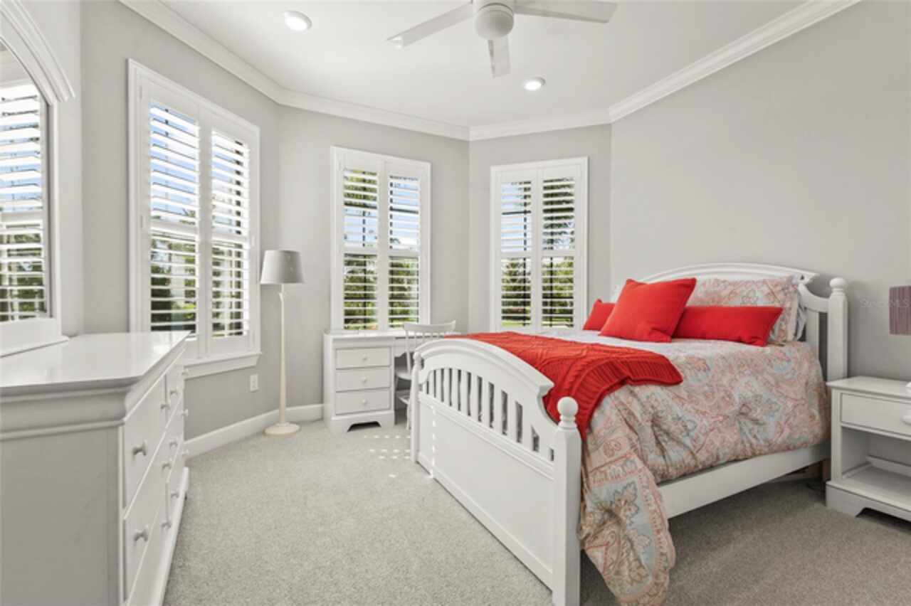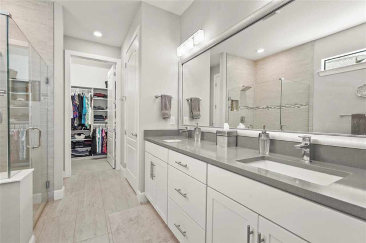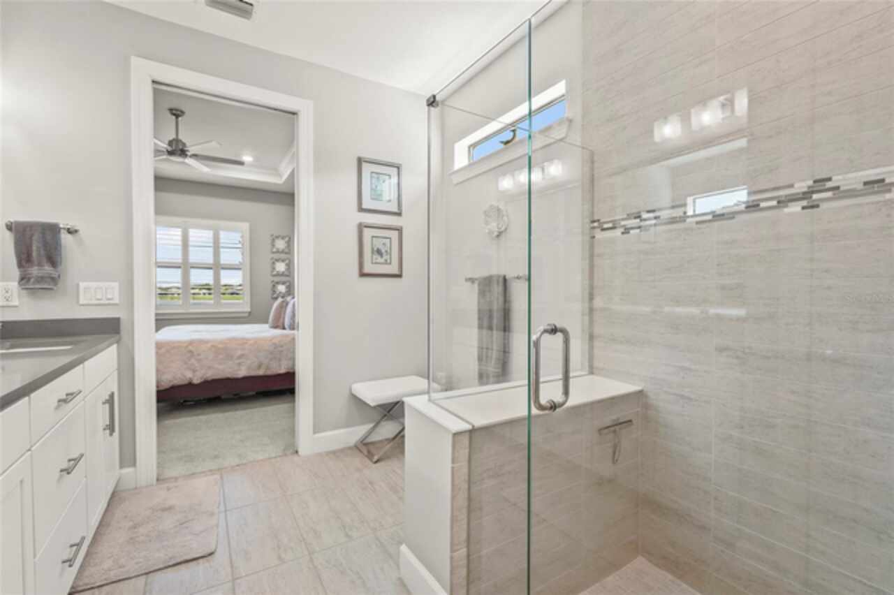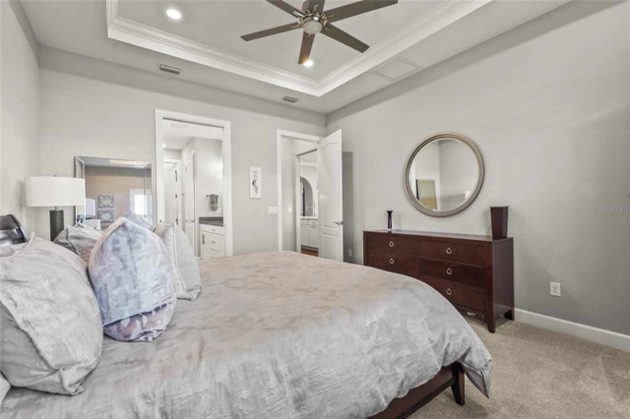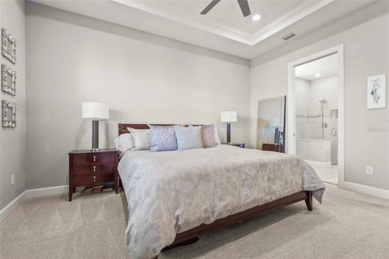 Welcome to luxury living in the sought-after Shoreview at Waterside community! This stunning 3-bedroom, 2-bathroom home offers an exceptional lifestyle with top-tier design elements and captivating water views. Situated on a low-traffic loop with green space across the street and serene water views behind, this residence blends elegance with privacy. Residents enjoy private access to community amenities just across the street in an exclusive enclave. Step inside to find wood-look tile flooring, plantation shutters, and coffered ceilings that add both style and warmth. The spacious primary suite features a custom walk-in closet and a spa-like en-suite bath with dual vanities. A private den/office provides the perfect work-from-home space. The chef’s kitchen impresses with quartz countertops, a KitchenAid stainless-steel appliance suite, gas range, and an arched entryway that opens to the family and dining areas. Enjoy a built-in dry bar and wine station with custom cabinetry, perfect for entertaining. The bump-out family room is anchored by a three-sided fireplace, adding ambiance to multiple spaces. Outdoor living shines with a fully equipped summer kitchen featuring a granite backsplash and stainless-steel countertops, a gas hookup, outdoor hood, and plenty of room to relax or entertain. The 3-car garage with an oversized bay and paver driveway offer both function and curb appeal. Additional highlights include laundry room built-ins, wiring and gas line installed for a future whole-house generator. Don’t miss your opportunity to own this beautifully appointed home in one of Lakewood Ranch’s premier communities.