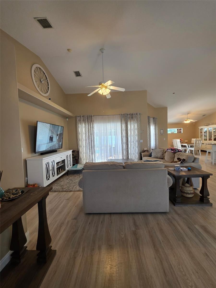Ceiling Fans(s), Kitchen/Family Room Combo, Open Floorplan, Primary Bedroom Main Floor, Solid Surface Counters, Solid Wood Cabinets, Split Bedroom, Tray Ceiling(s), Vaulted Ceiling(s), Walk-In Closet(s), Window Treatments