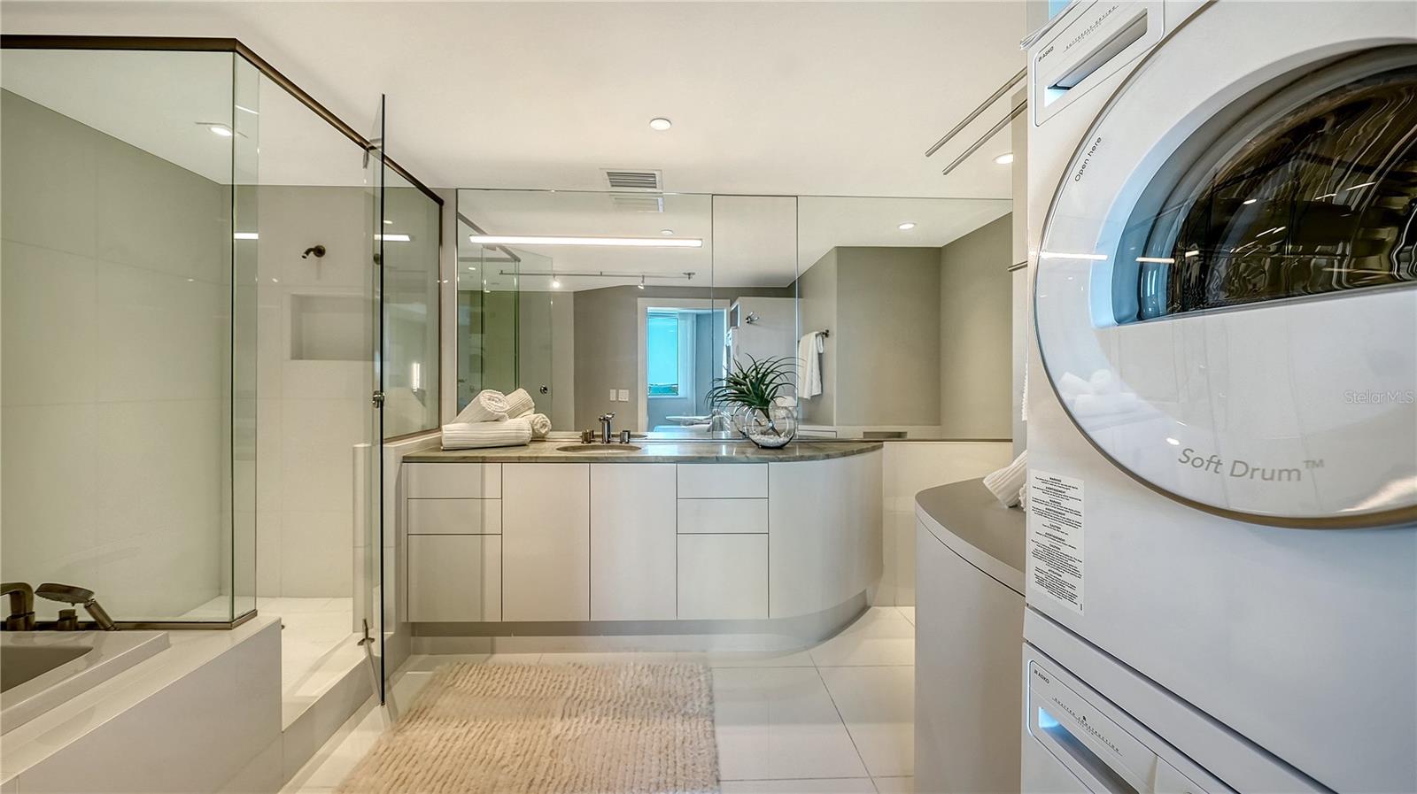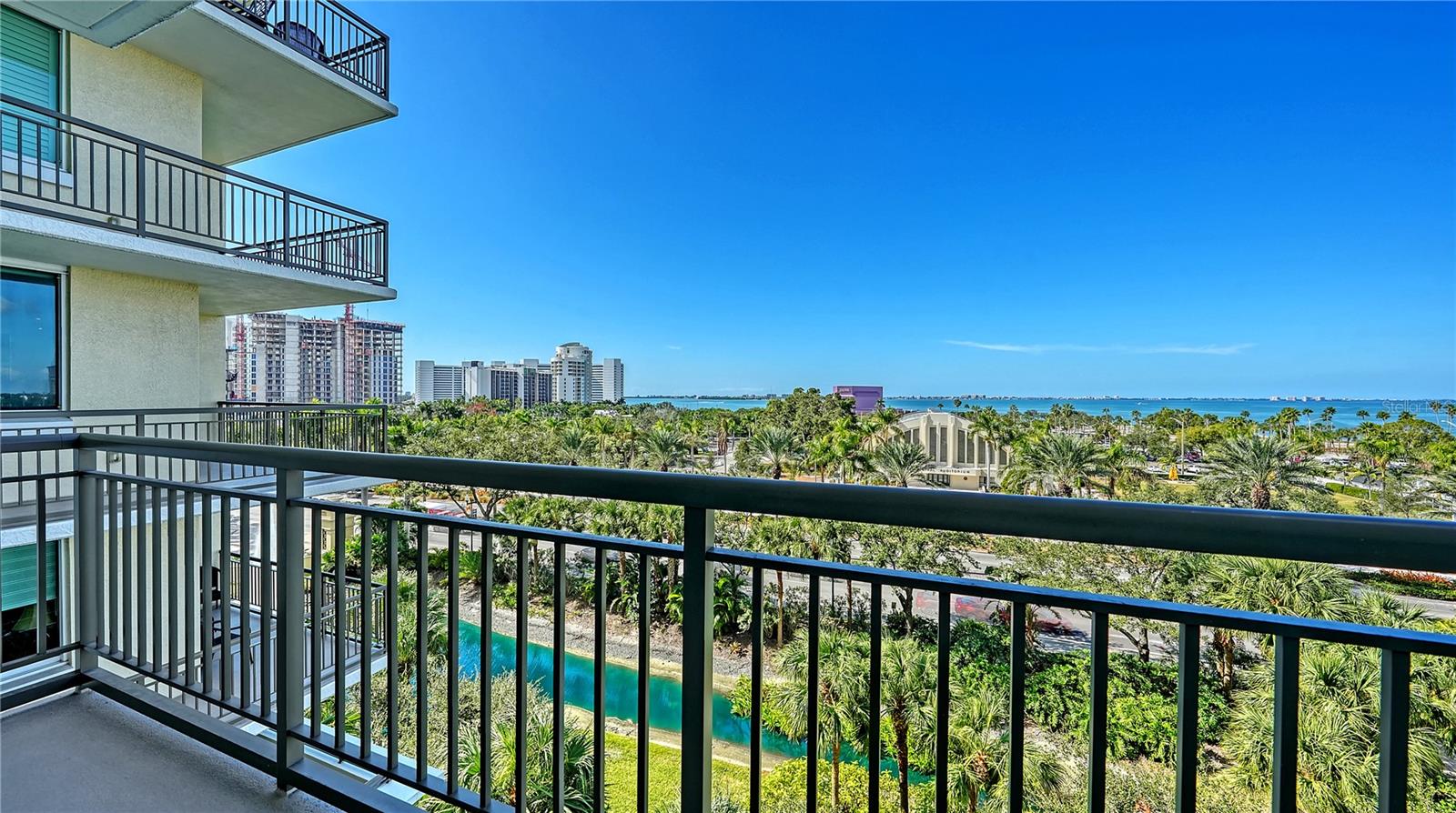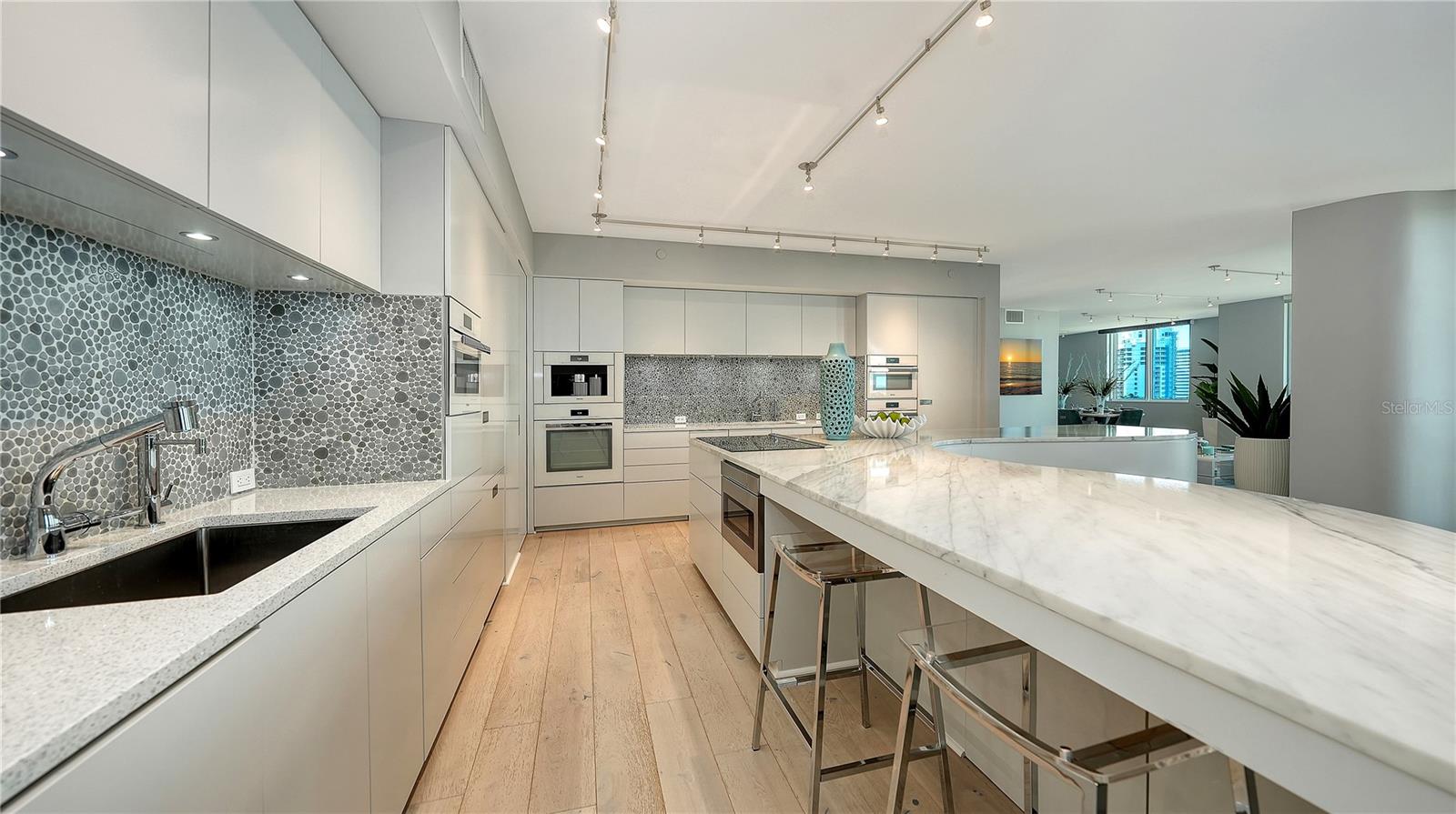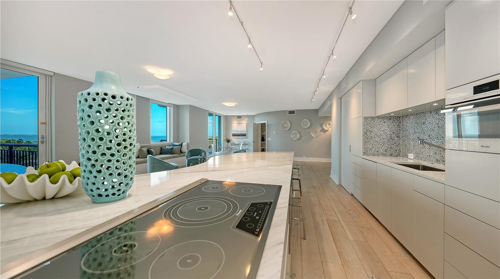 Experience panoramic Sarasota Bay and skyline views from this one-of-a-kind fifth-floor, double residence at Alinari, located in the heart of the vibrant Rosemary District. Thoughtfully combined and completely re-imagined during a major 2014 renovation, this expansive three-bedroom layout offers nearly 3, 000 square feet of refined living space with multiple terraces capturing sunrise, sunset, and twinkling city lights. A private foyer opens to a light-filled interior featuring gorgeous hardwood flooring, modern architectural detailing, and oversized impact-rated windows and sliders that frame sweeping vistas from almost every room. The open living and dining areas flow effortlessly into a second family/dining room, creating an ideal environment for entertaining or quiet relaxation. At the center of the design is a modern chef’s kitchen appointed with premium Miele appliances—including a built-in coffee system—Thermador cooktop, multiple built-in ovens and microwaves, sleek cabinetry, and a curved Carrara marble island with breakfast bar seating. The kitchen’s placement ensures connectivity to both gathering areas and the expansive views beyond. The secluded primary suite offers sunny exposures, a large walk-in closet, and a spa-inspired bath with stone counters, custom built-ins, and its own dedicated laundry. Two additional guest suites are thoughtfully positioned for privacy, each featuring en-suite baths, separate laundry facilities, and an adjacent den that can serve as an office, fitness room, or media space. Additional highlights include multiple terrace spaces, three coveted under-building parking spaces, plus two climate-controlled storage units. Residents of Alinari enjoy a long list of amenities, including on-site management, a stylish club room, tearoom, business center, conference rooms, library, wine room with optional owner wine lockers, theater, and a comprehensive fitness center with sauna, aerobics room, and men’s/women’s locker rooms. Outdoor amenities include a grilling area, resort-style swimming pool with sundeck and cabanas, and a heated spa. Guest suites are available to owners on a first-come basis for visiting friends and family. Set within Sarasota’s coveted Rosemary District, Alinari places you moments from the Van Wezel Performing Arts Hall, The Bay Park, downtown restaurants, boutique shopping, the Farmers Market, the emerging waterfront redevelopment, and the cultural energy that defines Sarasota. Lido Beach, St. Armands Circle, and Marina Jack are just a short drive away, offering world-class recreation and dining. This exceptional residence combines scale, location, and unobstructed views—an extraordinary downtown offering with the space and livability of a single-family home in one of Sarasota’s most dynamic neighborhoods.