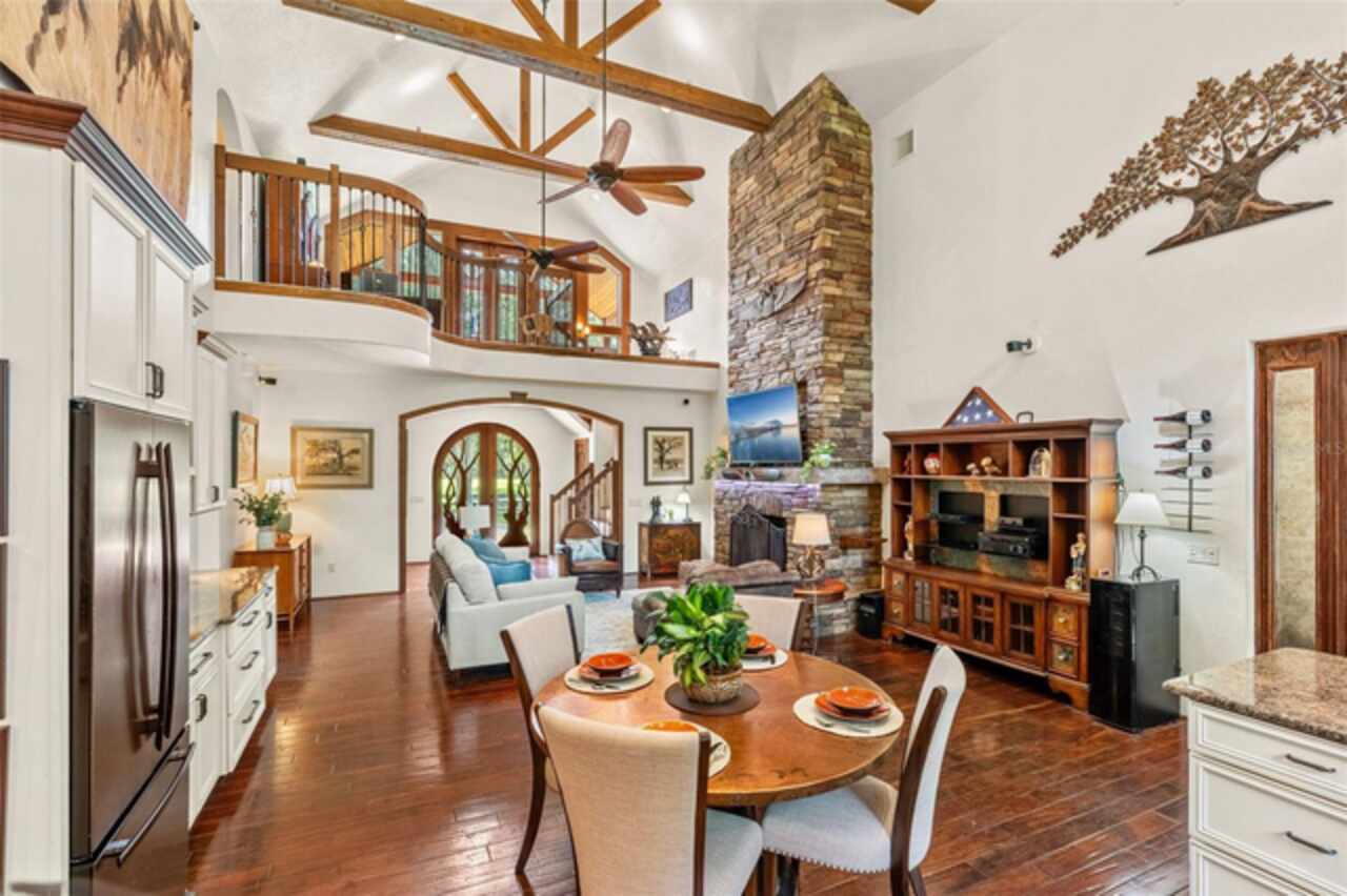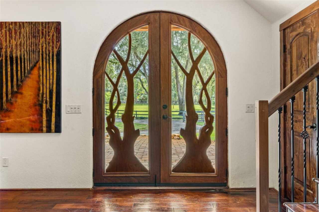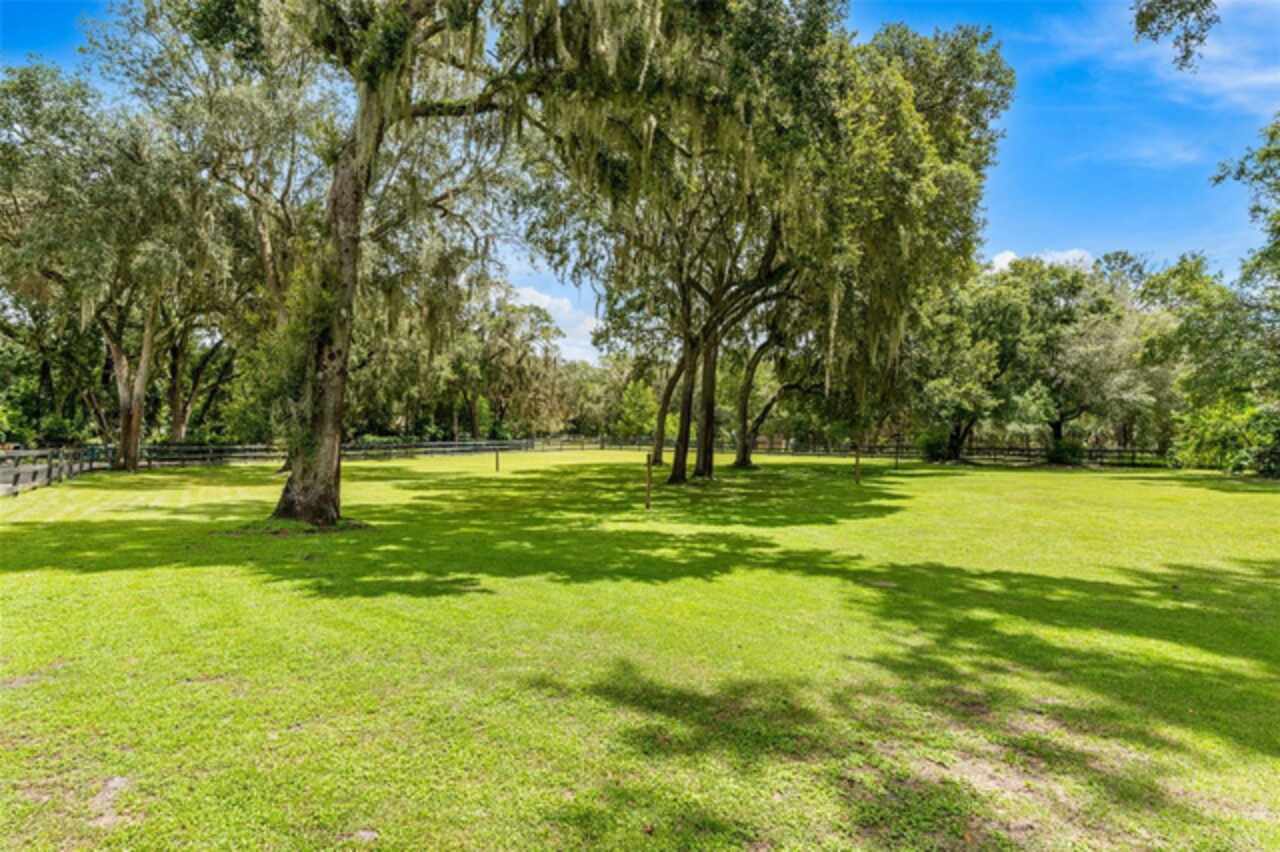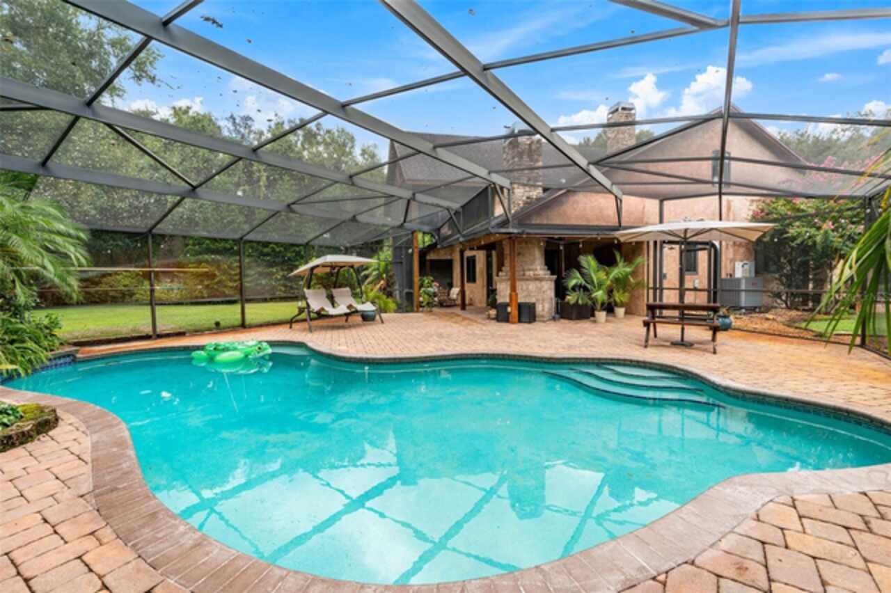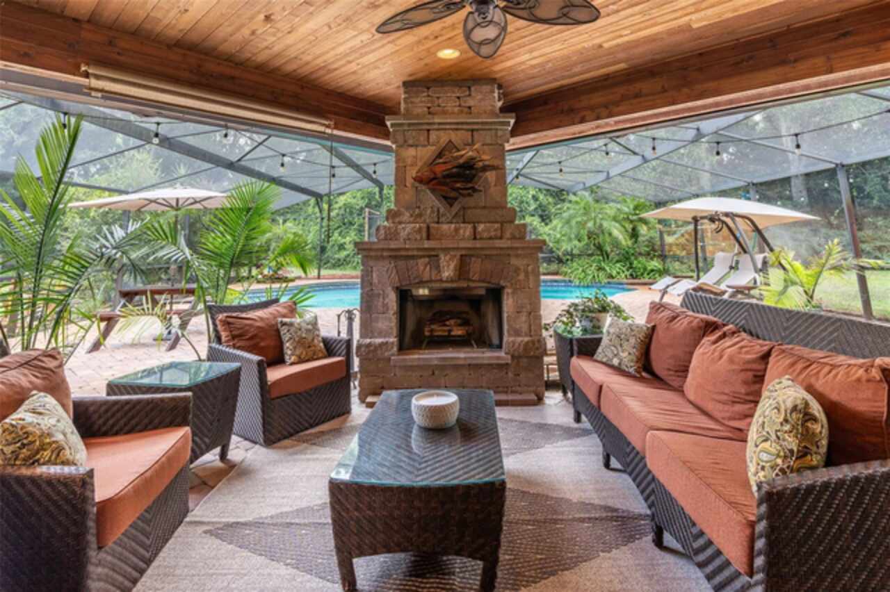 Under contract-accepting backup offers. Welcome to a refined country living where luxury meets farm and charm. This custom 3, 114 sq ft home sits on 2.75 acres of high-and-dry and offers 3 bedrooms, 3.5 baths, and the perfect layout design for multi-generational living. Soaring 27-foot ceilings with exposed wood beams, acacia wood flooring, specialty lighting, and handcrafted double front doors create the warm sense of elevated rustic elegance. The gourmet kitchen features a gas Wolfe cooktop with a vented hood, oil-rubbed bronze Jenn-Air appliances including a fridge, microwave/oven stack, and Zline dishwasher (2025). Off-white soft-close cabinetry, under-cabinet lighting, granite countertops, a weathered copper backsplash, and a full butler’s pantry with extra storage complete the space. Each of the three-bedroom suites feature their own living space and include walk-in closets as well as ADA-accessible bathrooms. The main ‘primary’ suite offers built-ins, a large walk-in closet, and direct pool access as well as access to its own porch. The other downstairs primary can function as a private apartment with its own living room, kitchenette, entrance, and parking pad. The upstairs suite includes a lounge, bar fridge, full bath, and walk-in closet. A loft/office space on the second floor overlooks the living room and opens to the upstairs patio. A half bath is also available downstairs for guests. The laundry room with utility sink and custom cabinetry is also located on the first floor. Outdoor living includes a 27-foot tall screened lanai with dining area, a full outdoor living room with wood burning fireplace, an 18, 000-gallon lap pool, and an outdoor shower. For equestrian lovers, the fully equipped barn includes two-stalls (12x12 and 10x12) with stall mats and overhead blowers, an exterior wash rack, grooming stall, feed room, and best of all, climate-controlled tack room! A secondary circular drive wraps around the barn and leads to a covered awning for truck and trailer parking, making loading and unloading easy. There is also a washer/dryer hookup in the barn. Two fenced pastures provide plenty of room for horses, and a golf practice net adds even more versatility to the land. The attached two-car garage includes custom storage and a built-in workbench. Additional home features include three fireplaces (two gas, one wood-burning), plenty of built-in storage opportunities, custom wrap-around stair railing, a whole-home Generac generator, a whole-home water softener, double-paned windows. Recent upgrades include two HVAC systems replaced in 2024 and 2025, one of two tankless water heaters replaced in 2024. New roof installed September 2025!