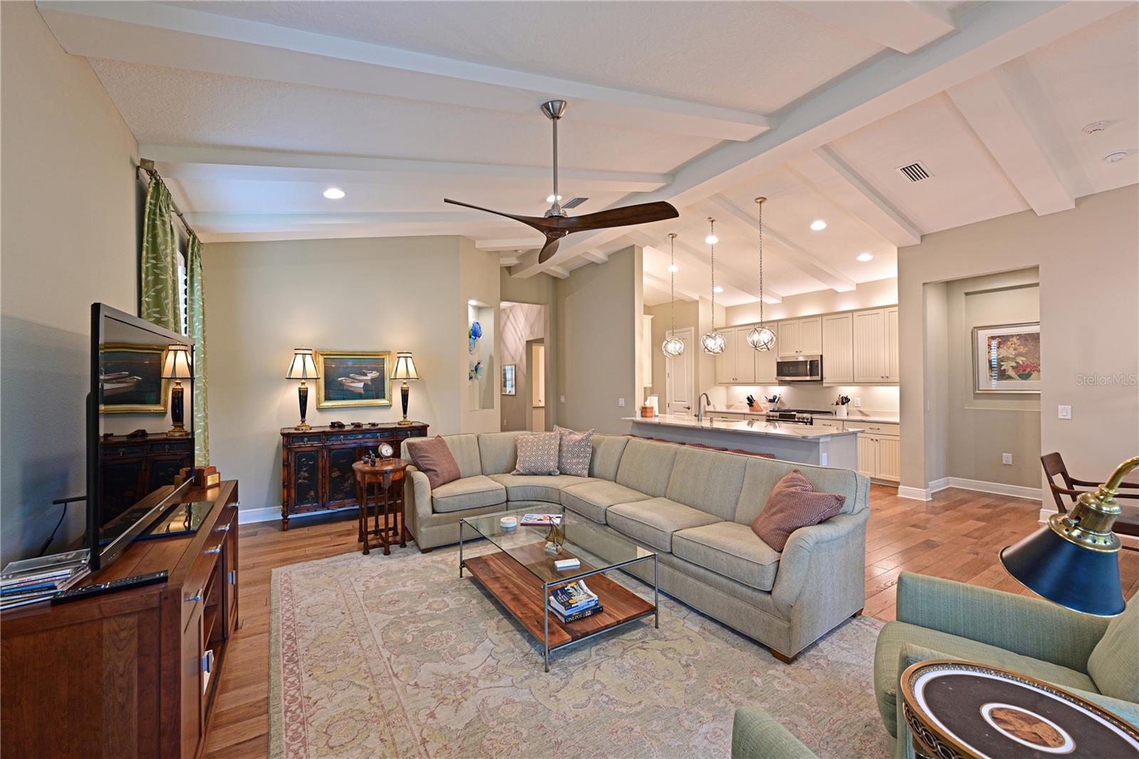 Under contract-accepting backup offers. Major Price Reduction! Welcome to Lakehouse Cove at Waterside, where luxury living meets vibrant community. This coveted Cay plan, enhanced with an upgraded craftsman elevation and inviting front porch, offers the perfect blend of style and comfort. Step inside to a dramatic foyer with 11-foot tray ceilings and custom trim details that echo throughout the home. A versatile den provides the ideal space for a home office or flex room, while the expansive great room impresses with soaring 14-foot vaulted ceilings, custom beam detail and seamless flow to the covered lanai. The gourmet kitchen is a true centerpiece, featuring Cambria quartz countertops, designer cabinetry, a large pantry, and open sightlines to the main living area - perfect for both everyday living and entertaining. The primary suite is a serene retreat with an oversized window framing garden views, a tray ceiling with custom detailing, an ensuite bath with dual vanities, a walk-in shower and a spacious custom built closet. A comfortable secondary bedroom and bath provide privacy for guests. Thoughtful details continue throughout: hardwood flooring, plantation shutters, a mudroom with custom cabinetry, a laundry room with indoor storage room and an oversized two-car garage with dedicated golf cart space. Outdoors, the covered lanai beckons with a custom outdoor kitchen and tranquil views of the landscaped yard, serene pond and fully fenced lawn. Additional highlights include impact windows for peace of mind and numerous designer upgrades. Life at Lakehouse Cove means more than just a beautiful home - it's a lifestyle. Enjoy 6 pickleball courts, a resort-style pool and spa overlooking Lake Kingfisher, a state-of-the-art fitness center, boathouse with kayak launch, 2 dog parks, community club house and fire pits where neighbors gather for breathtaking sunsets. Just a short stroll brings you to Waterside Place, brimming with shopping, dining, a weekly farmer's market and year-round events. This impeccable home combines designer touches with resort-style living - an extraordinary opportunity in one of Sarasota's most desirable communities.