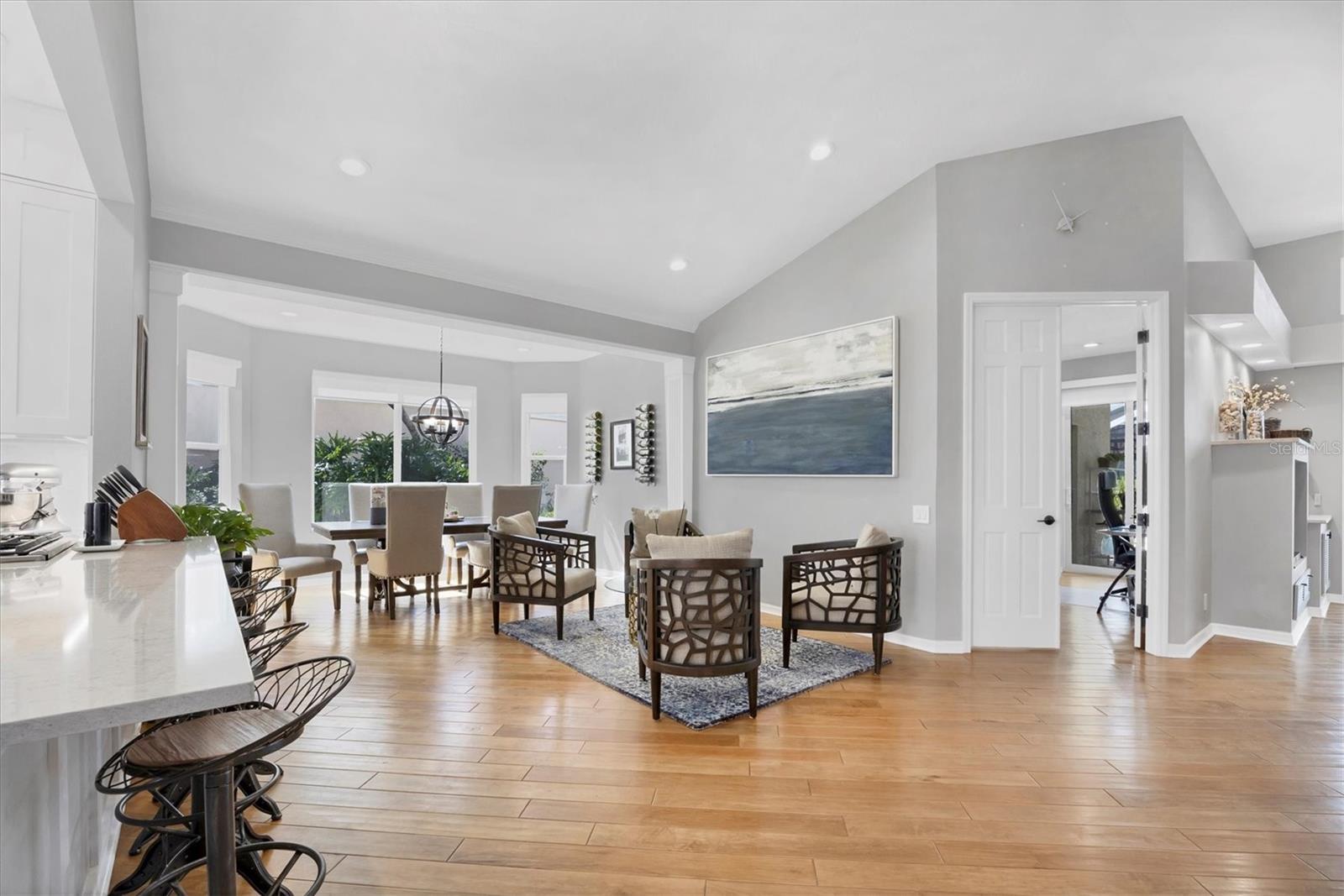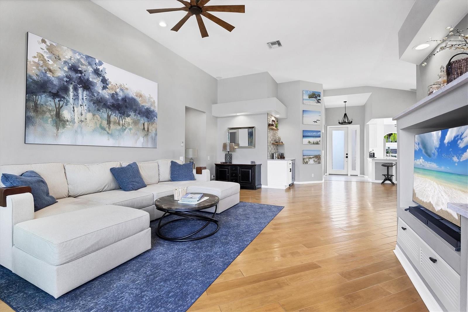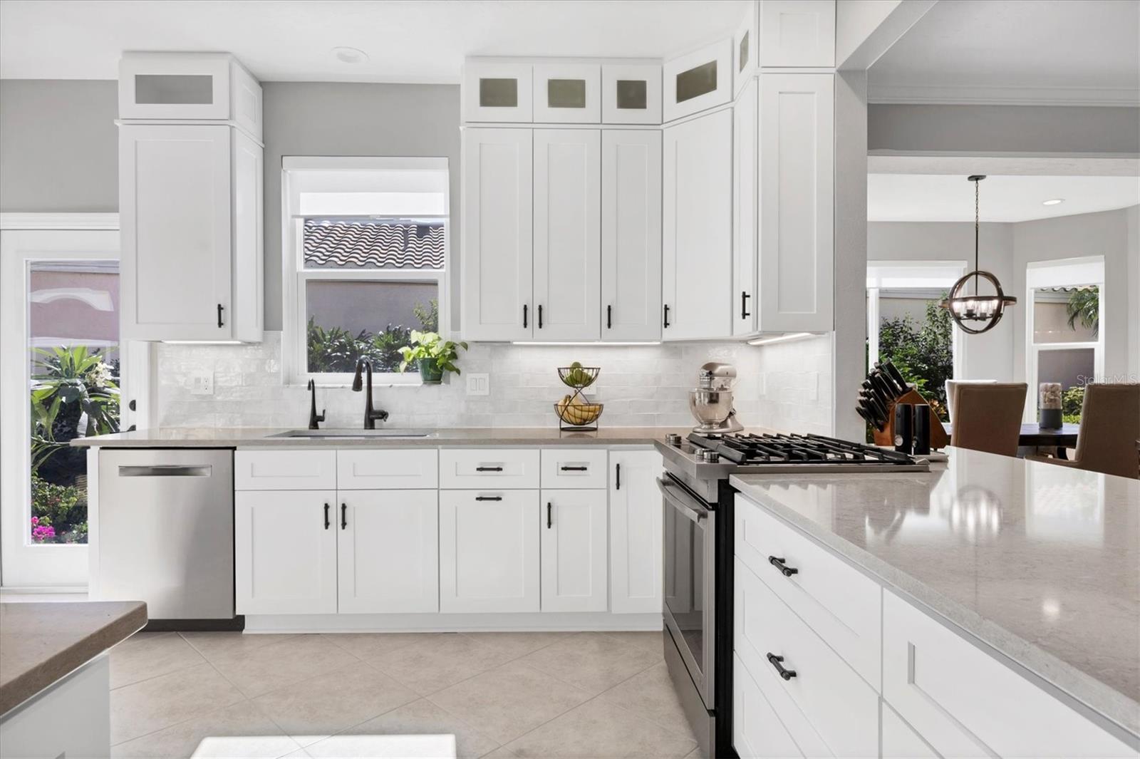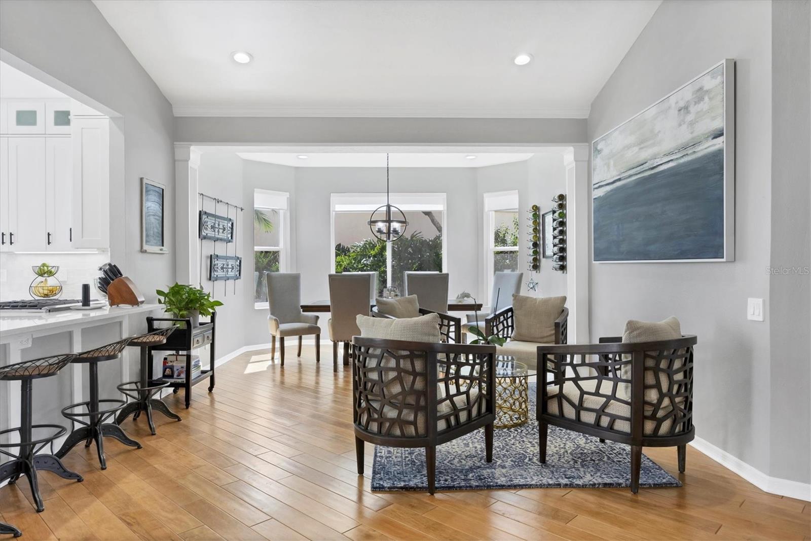 Elegant Updated Home in Prestancia – Sarasota’s Premier Gated Golf Community. Nestled within Prestancia, one of Sarasota’s most sought-after gated golf communities, this beautifully updated residence blends timeless architecture with sophisticated modern design. Featuring 3 bedrooms and 3.5 baths, the home is perfectly situated on a beautifully landscaped homesite that offers both privacy and curb appeal. A covered front entry, framed by lush tropical landscaping, welcomes you inside. The open-concept floor plan unfolds through an airy foyer with tall ceilings, a modern chandelier, and rich wood flooring that flows seamlessly throughout the main living areas. Clear sightlines extend through the kitchen, dining, and living spaces to the lanai and pool beyond. Remodeled in 2020, the kitchen is a showpiece with custom white Shaker cabinetry, quartz countertops, a custom tile backsplash, and dark oil-rubbed bronze hardware. A large peninsula with seating, recessed lighting, and a window for natural light complements stainless steel appliances, a bar area with floating shelves, and a wine refrigerator. The adjacent dining area features a bay of windows, an orb-style chandelier, and serene garden views. The great room impresses with expansive sliding glass doors and transom windows that fill the space with natural light. A built-in entertainment wall, neutral tones, and wood floors create a relaxed yet elegant ambiance. An additional family room, centrally located between the kitchen, dining, and lanai, offers versatile space for lounging, media, or gatherings. The primary suite is a private retreat featuring high ceilings, a modern ceiling fan, and soft garden tones. A bay of arched and picture windows frames tranquil views of the pool and lush landscaping. The primary bath, fully remodeled in 2021, showcases dual vanities with quartz countertops, contrasting cabinetry, framed mirrors, a frameless walk-in shower with rain and handheld heads, a deep soaking tub, and a private water closet. Two guest suites are thoughtfully positioned for privacy, each with its own en-suite bath. The first guest suite offers a spacious closet and an updated bath (2022) featuring a dark gray vanity, quartz countertop, and brushed-nickel hardware. The second guest suite, currently used as a Den/Multipurpose Room, includes wood floors and sliding glass doors opening directly to the lanai. Its bath (remodeled in 2019) features updated tile, vanity, and lighting—and conveniently doubles as a pool bath. A stylish half bath, refreshed in 2020, serves guests from the main living area. Designed for effortless outdoor living, the screened lanai—rescreened and repainted in 2023—surrounds a heated pool (new heater 2019) with a spacious deck and multiple lounging areas, all bordered by lush landscaping for privacy. Additional updates include: 2020 electrical panel upgrade, 2023 landscaping refresh, 2024 impact-rated windows and doors, 2025 new garage door. Residents of Prestancia enjoy 24-hour gated security, tree-lined streets, and pet-friendly surroundings with sidewalks ideal for walking and biking. HOA fees cover landscape maintenance, irrigation and pest control, while optional membership at TPC Prestancia offers access to championship golf, a clubhouse, and a vibrant social scene—all just minutes from Siesta Key beaches, the Legacy Trail, dining, and shopping.