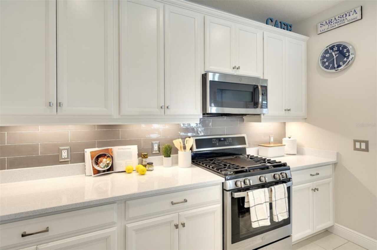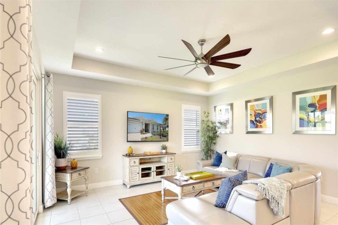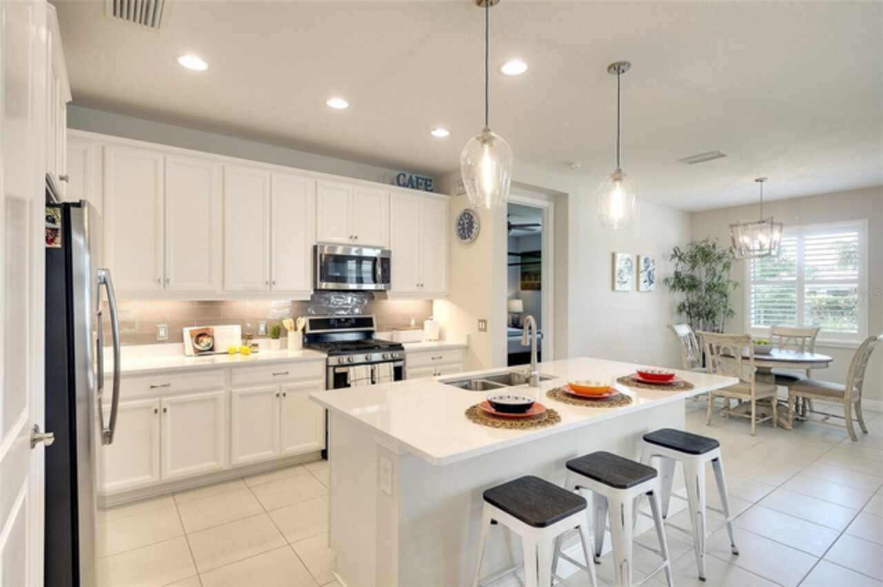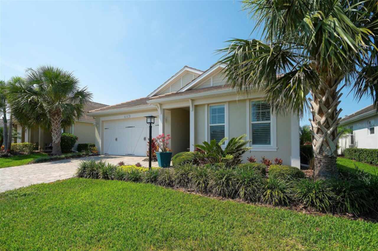 Welcome to this pristine home in coveted Lakehouse Cove at Waterside! Light and bright this 2 Bedroom + Den residence with 1, 625 square feet of thoughtfully designed living space offers a tranquil retreat just steps away from the lively amenity center at Lakehouse Cove. An almost new home built in 2020 by Homes By Towne, this Dover floorplan with a West Indies elevation and a Southern lanai exposure allows for maximum enjoyment of your Florida lifestyle! The quality of the finishes include 8’ DOORS THROUGHOUT, tray ceilings, plenty of recessed lighting and CUSTOM PLANTATION SHUTTERS THROUGHOUT. The inviting foyer, kitchen and dining area are highlighted with added DESIGNER LIGHTING. In the kitchen, you’ll find upgraded 42” white custom cabinets, with extensive pull out shelves, contemporary stainless steel appliances, featuring a 5 burner GAS STOVE, and sleek quartz countertops. The stylish SUBWAY TILE BACKSPLASH & under cabinet lighting ties the space together. The great room is a cozy yet spacious area, with a tray ceiling and views of the expansive private backyard with PLENTY OF ROOM FOR A POOL and ability for fencing within HOA guidelines. the owner’s suite which features custom plantation shutters has an en-suite bath features a walk-in shower, dual sinks, upgraded plumbing fixtures and a quartz countertop that complete the bath’s refined look. The 2nd bedroom thoughtfully positioned for privacy with a full adjacent bath continues the home’s design with a shower and tub combo, vanity with white cabinetry and quartz countertops. The spacious flex room with plenty of natural light makes it an ideal space for work or relaxation. More features include, a well-appointed laundry room with a large soaking sink, a tankless gas hot water heater, in wall pest control, a two-car garage featuring PROFESSIONALLY HUNG STORAGE RACKS and epoxy floor. Plus, you'll have access to a 7-acre amenity center with a full calendar of events an onsite event coordinator, 24-hour fitness center, resort-style pool and spa, pickle ball, dog parks, boathouse, clubhouse with meeting rooms and full kitchen, fire pit and more. Don't miss your chance to live in this vibrant community in this exciting Waterside village!