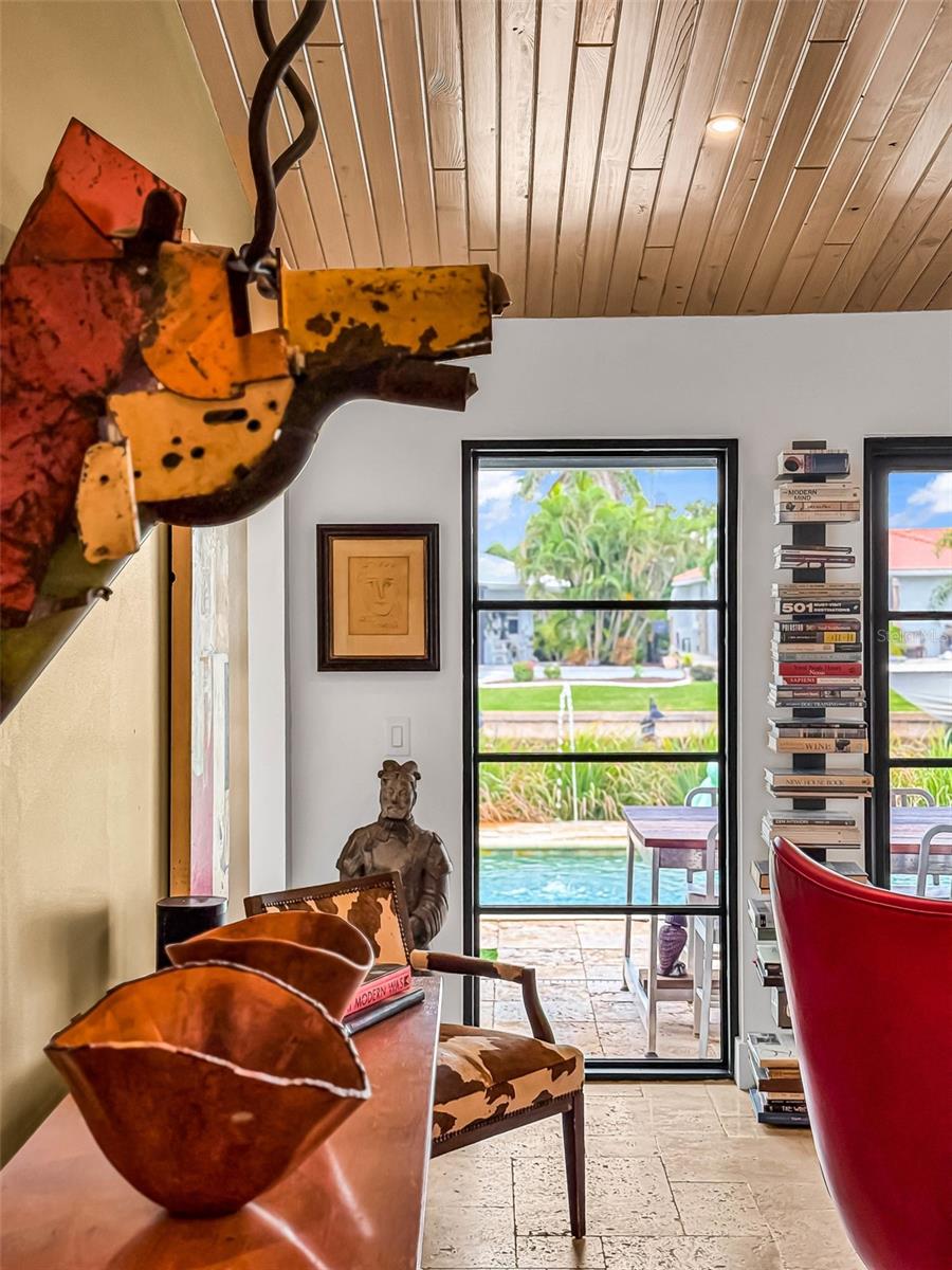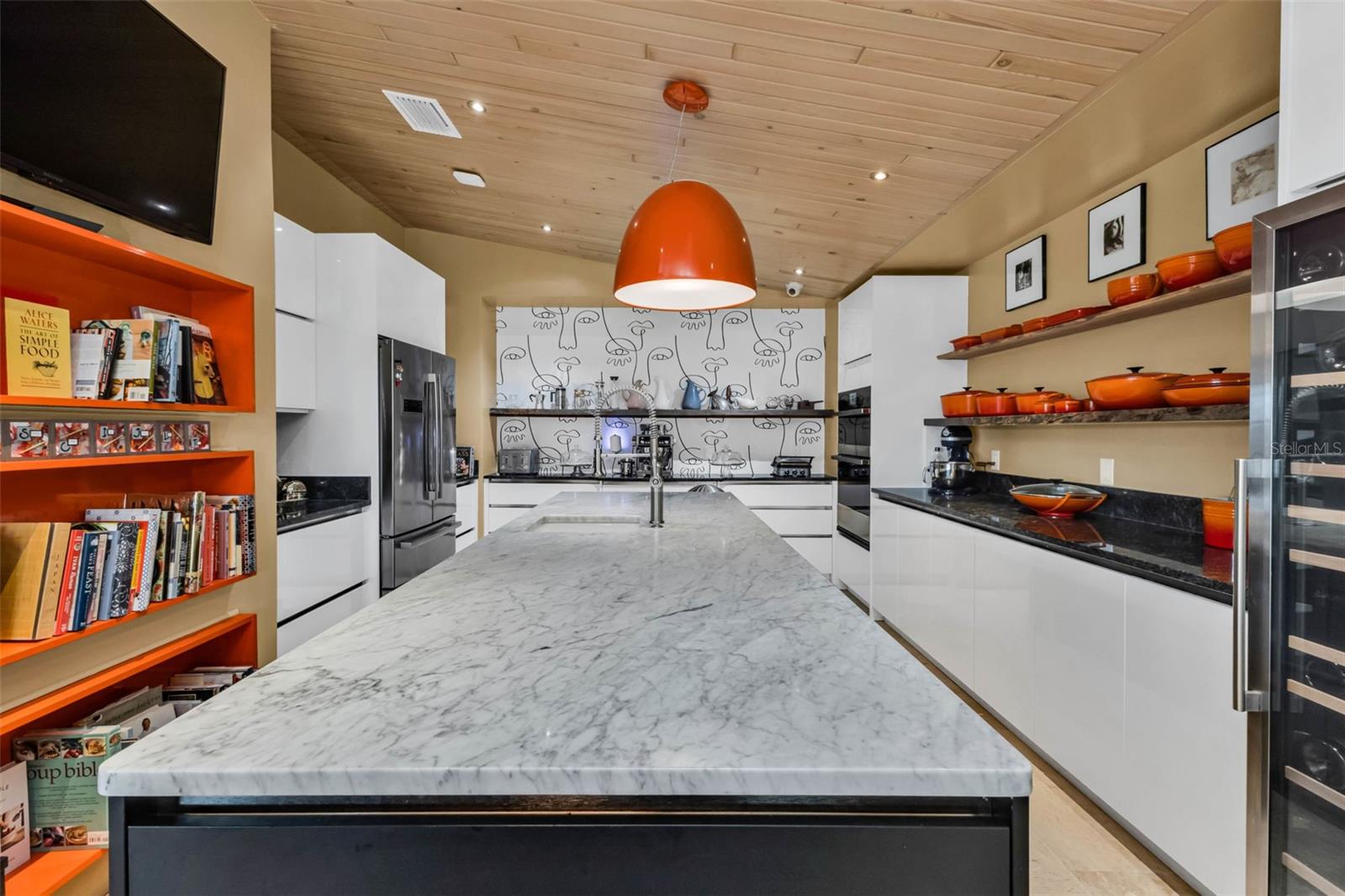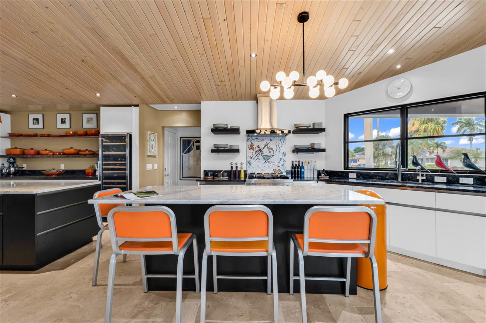 Mid Century Modern style meets 21st Century practicality. Modern Coastal Elegance with Unmatched Structural Integrity Completely reimagined from the slab up in 2023/2024, this 3-bedroom, 2-bath home offers 2, 675 square feet of luxury living with a focus on strength, sophistication, and seamless indoor-outdoor living. Walk up the cream travertine front steps, to the spacious front porch. Step through one of the two custom steel HURRICANE IMPACT PIVOT DOORS into a stunning interior featuring vaulted cypress ceilings and French-pattern cream travertine MARBLE flooring throughout. Entertain effortlessly in the CHEF'S KITCHEN with JennAir, Bosch, and Fisher Paykel appliances featuring 2 dishwashers, gas range, double electric wall ovens, warming drawer, wine fridge, TWO EXPANSIVE ISLANDS topped with Carrera marble and Brazilian granite, a striking Picasso-inspired tile backsplash, WALNUT LIVE-EDGE SHELVING, and Picasso inspired wall paper above THE COFFEE BAR adds a bespoke touch. A hidden pantry with a second Bosch refrigerator, and custom cabinetry is tucked behind the kitchen, through a restaurant-inspired swinging door. Custom lighting fixtures abound throughout the home, many are vintage, from Herman Miller. The MCM open-concept design extends to an 1800 sq. ft., SPECTACULAR LANAI, tan travertine marble pavers, gas hookup ready for a future outdoor kitchen and plenty of shady and sunny seating areas. Overlooking the lanai is a 50 ’ saltwater lap pool with decorative jets, new pump (2024), and electric heater with new control panel (2024) Built atop a 4-course stem wall at 9.6' elevation, this residence boasts unparalleled structural integrity with a standing seam metal roof (2024) tied to the foundation via threaded steel rods every 18 inches. Built for resilience and comfort, the home includes: Whole-house 24KW GENERAC GENERATOR (auto switchover) powered by an in-ground 250- gallon LP tank, Hardie Board cement siding and hurricane-impact windows and doors, Two AC units (2023 & 2024), and TWO on-demand hot water heaters (electric 2023, LP gas 2024), HALO whole-house water filtration system which will function carefree until 2033, Advanced security system with cameras, audio, and DVD backup Retreat to the luxurious primary suite with a Kohler rain shower, Kohler handheld shower, custom tile work, an infrared sauna (NEGOTIABLE) and expansive custom cabinetry with his and hers walk-in closets. Guest bedrooms and bathroom feature equally high-end finishes and CUSTOM Built-in storage. Guest bath has edgeless glass door, Kohler rain shower, a private water closet, and a large CUSTOM linen closet. Outdoors, enjoy the professionally landscaped backyard (fully fenced) maintained by Beautiful Boundaries. Boaters will appreciate the 30 ’ dock with 30, 000 lb boat lift and all-new 2024 electrical. The 32x22 garage includes epoxy flooring, waterproofed walls, overhead storage, a workshop bay, separate man-door, and a hurricane-rated, custom Clopay door. Truly move-in ready, this meticulously designed home delivers peace of mind, exceptional taste, and every modern convenience. Schedule your private showing today.