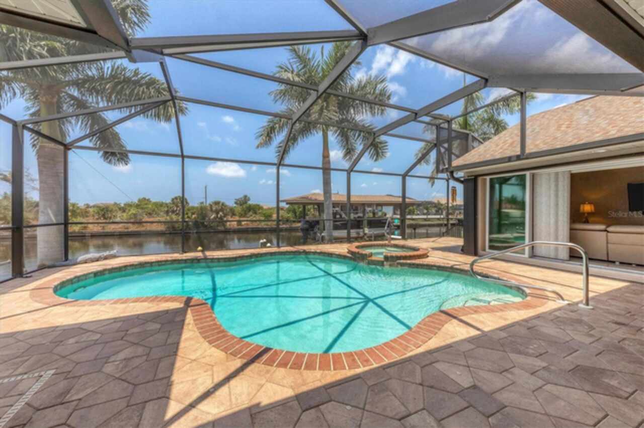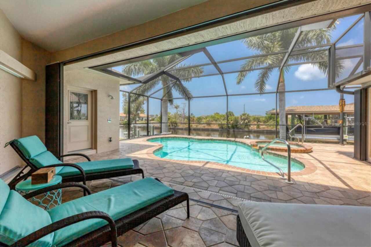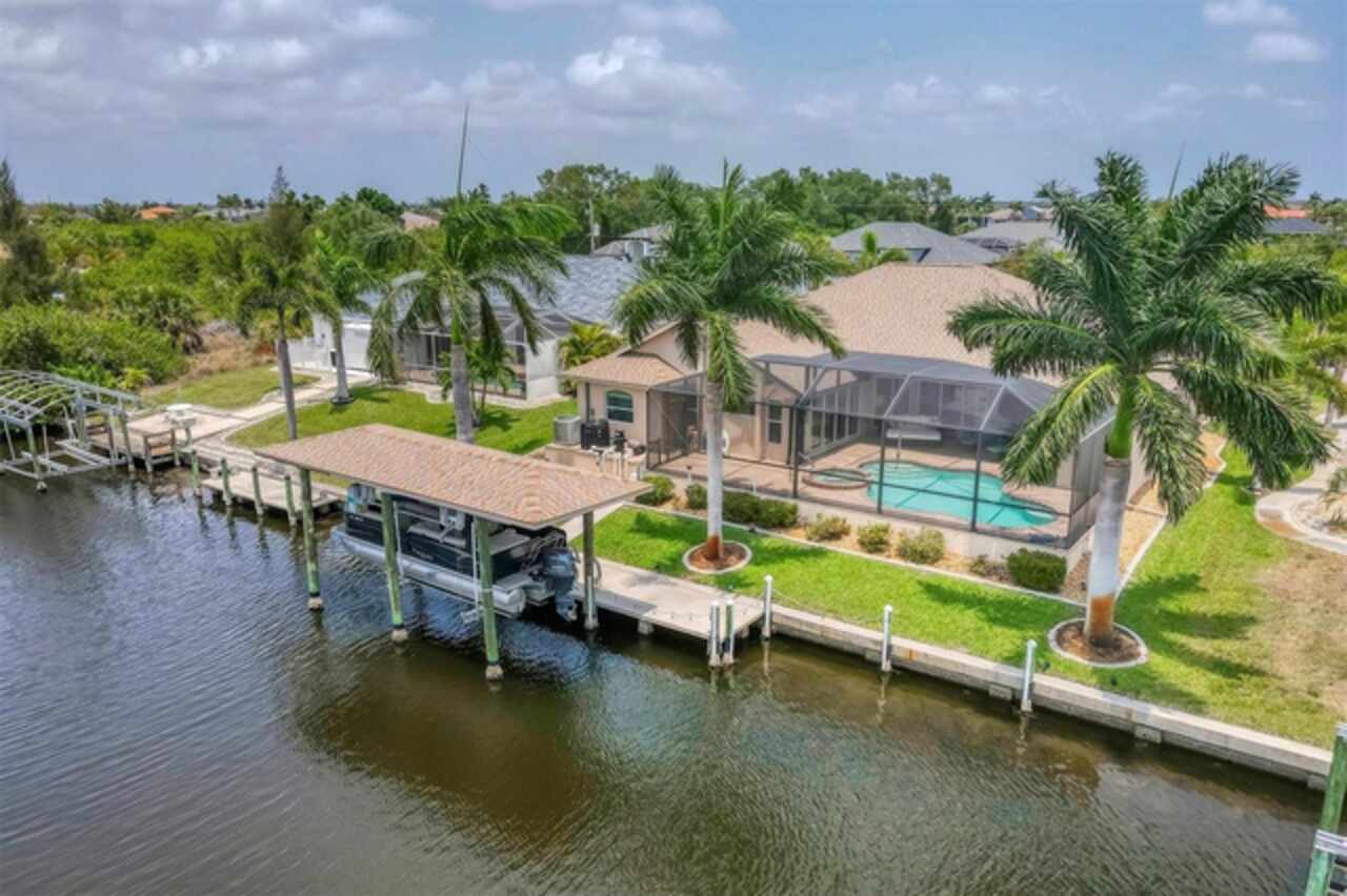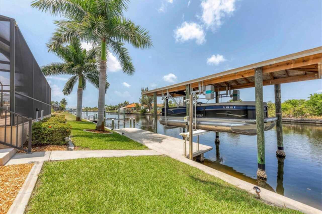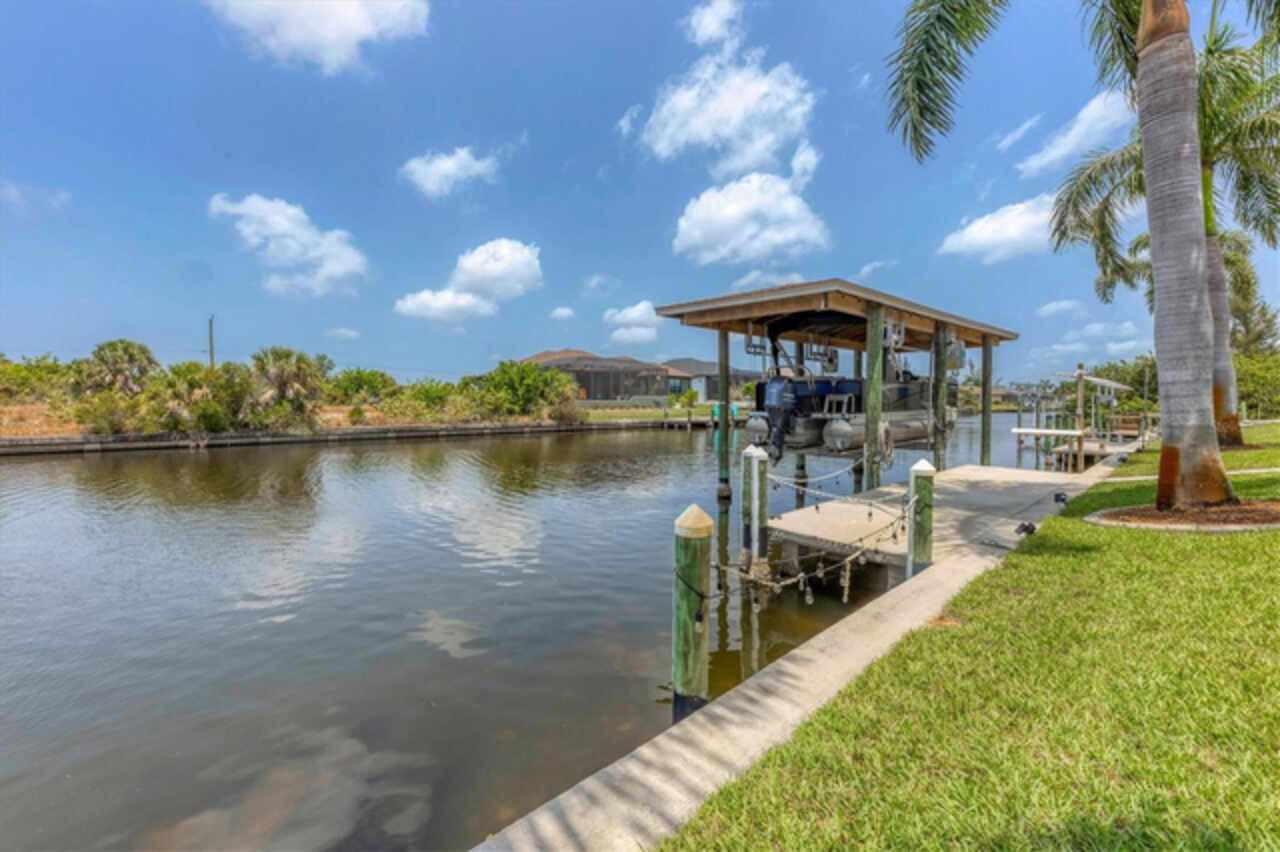 Welcome to your own slice of paradise in the serene and highly sought-after community of South Gulf Cove. This stunning custom-built home offers the ultimate in waterfront living with a full seawall, a concrete dock complete with water, electric, and a fish cleaning station, and a 15, 000 lb. covered boat lift — all topped with a custom-matched roof installed in 2022 to seamlessly blend with the home. As you arrive, you'll be immediately impressed by the beautifully manicured landscaping, stamped concrete driveway and walkway, and the elegant curb appeal. Step through the double entry doors and be greeted by an abundance of natural light that pours into the open-concept living space, highlighting the gleaming polished tile floors and sophisticated architectural details throughout. Designed for entertaining, this home features two inviting living areas, a formal dining room, and a charming breakfast nook — all showcasing spectacular waterfront views. The chef’s kitchen is a true showstopper, offering granite countertops, solid wood cabinetry, under-cabinet lighting, a built-in wine rack and wine fridge, double ovens, Bosch cooktop with downdraft on a central island, matching Bosch appliances, and a central vacuum system. The popular Florida split floor plan provides maximum privacy, with the oversized primary suite tucked away from the guest bedrooms. The primary bedroom boasts a tray ceiling, a walk-in and reach-in closet, and sliding doors to the lanai. The en-suite bath features dual granite vanities, a private water closet, a glass-enclosed walk-in shower, and a luxurious soaking tub — perfect for unwinding after a day on the water. The guest bedrooms offer comfortable accommodations with reach-in closets and share a beautifully updated bathroom with a granite-topped vanity and a spacious tiled walk-in shower. The versatile laundry room connects conveniently to both the kitchen and garage and includes custom cabinetry, granite counters, and a sink — ideal for cleanup after outdoor projects. The oversized two-car garage is an enthusiast’s dream, with epoxy flooring, cobalt metal cabinetry, a built-in workbench, and extra space for storing gear or toys. Step outside to your private resort-style lanai, featuring a saltwater heated pool and attached hot tub with upgraded Wi-Fi controls for ultimate comfort. Lounge under the covered area and catch your favorite show, or rinse off in the outdoor shower after a day in the sun. A separate pool bath and storage room complete this exceptional outdoor living space. Located minutes from the pristine beaches of Boca Grande, top-rated golf courses, and world-class fishing in Charlotte Harbor and the Gulf of Mexico, this home offers the Florida lifestyle you've been dreaming of.
