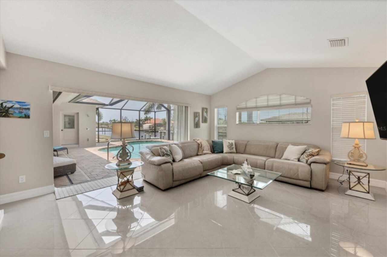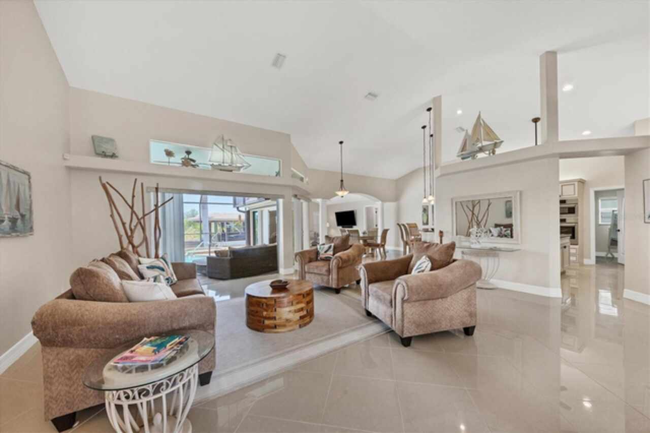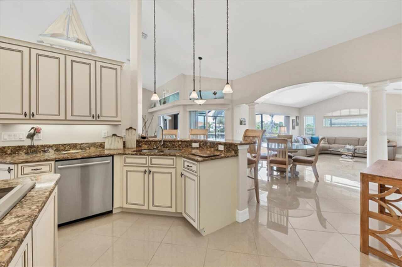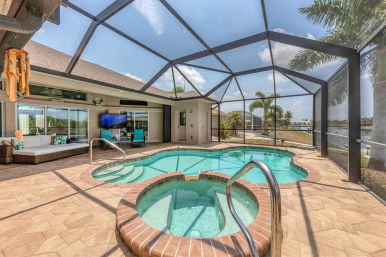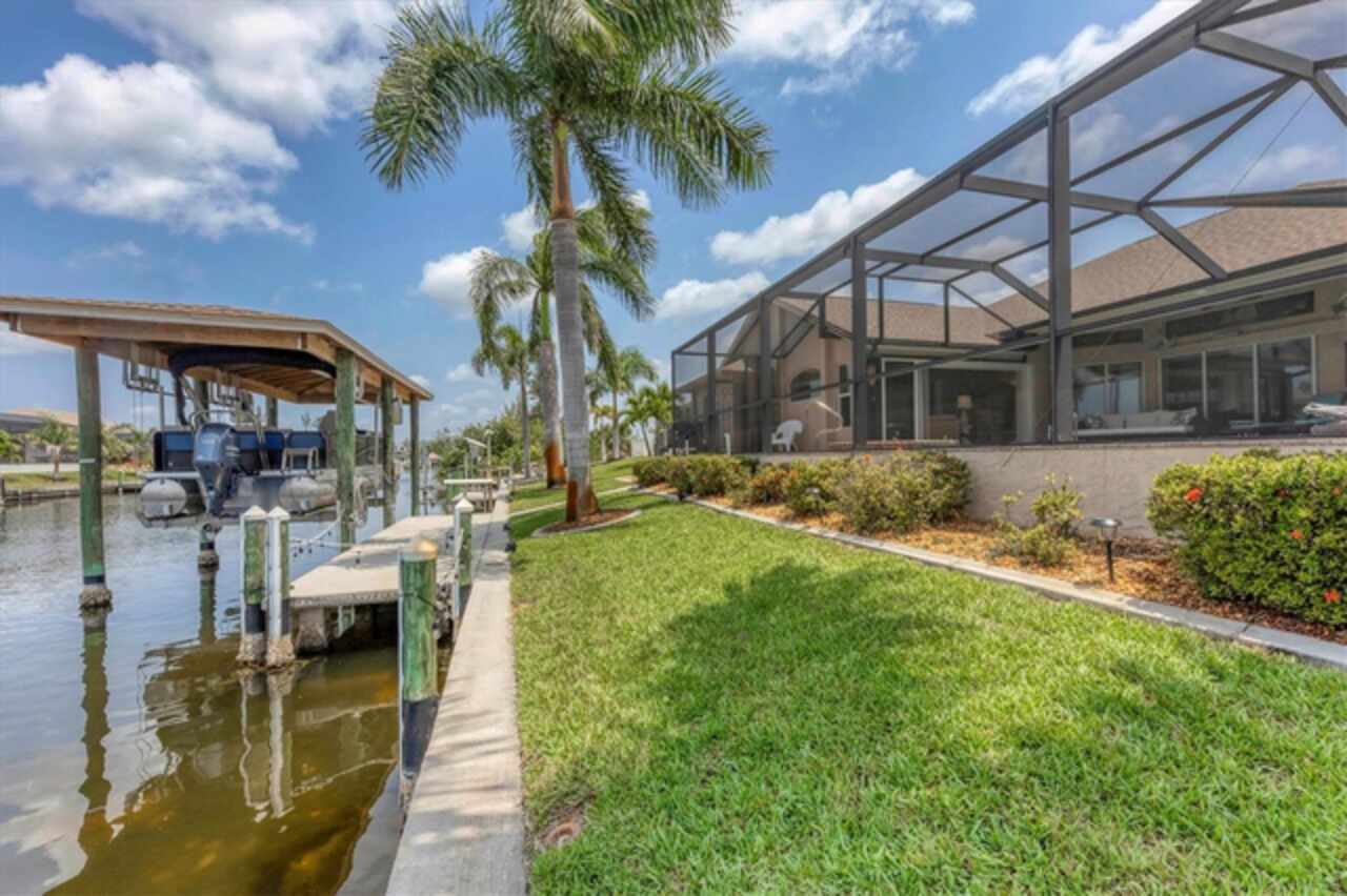 Welcome to your own slice of paradise in the serene and highly sought-after community of South Gulf Cove. This stunning custom-built home offers the ultimate in waterfront living with a full seawall, a concrete dock complete with water, electric, and a fish cleaning station, and a 15, 000 lb. covered boat lift — all topped with a custom-matched roof installed in 2022 to seamlessly blend with the home. As you arrive, you'll be immediately impressed by the beautifully manicured landscaping, stamped concrete driveway and walkway, and the elegant curb appeal. Step through the double entry doors and be greeted by an abundance of natural light that pours into the open-concept living space, highlighting the gleaming polished tile floors and sophisticated architectural details throughout. Designed for entertaining, this home features two inviting living areas, a formal dining room, and a charming breakfast nook — all showcasing spectacular waterfront views. The chef’s kitchen is a true showstopper, offering granite countertops, solid wood cabinetry, under-cabinet lighting, a built-in wine rack and wine fridge, double ovens, Bosch cooktop with downdraft on a central island, matching Bosch appliances, and a central vacuum system. The popular Florida split floor plan provides maximum privacy, with the oversized primary suite tucked away from the guest bedrooms. The primary bedroom boasts a tray ceiling, a walk-in and reach-in closet, and sliding doors to the lanai. The en-suite bath features dual granite vanities, a private water closet, a glass-enclosed walk-in shower, and a luxurious soaking tub — perfect for unwinding after a day on the water. The guest bedrooms offer comfortable accommodations with reach-in closets and share a beautifully updated bathroom with a granite-topped vanity and a spacious tiled walk-in shower. The versatile laundry room connects conveniently to both the kitchen and garage and includes custom cabinetry, granite counters, and a sink — ideal for cleanup after outdoor projects. The oversized two-car garage is an enthusiast’s dream, with epoxy flooring, cobalt metal cabinetry, a built-in workbench, and extra space for storing gear or toys. Step outside to your private resort-style lanai, featuring a saltwater heated pool and attached hot tub with upgraded Wi-Fi controls for ultimate comfort. Lounge under the covered area and catch your favorite show, or rinse off in the outdoor shower after a day in the sun. A separate pool bath and storage room complete this exceptional outdoor living space. Located minutes from the pristine beaches of Boca Grande, top-rated golf courses, and world-class fishing in Charlotte Harbor and the Gulf of Mexico, this home offers the Florida lifestyle you've been dreaming of.