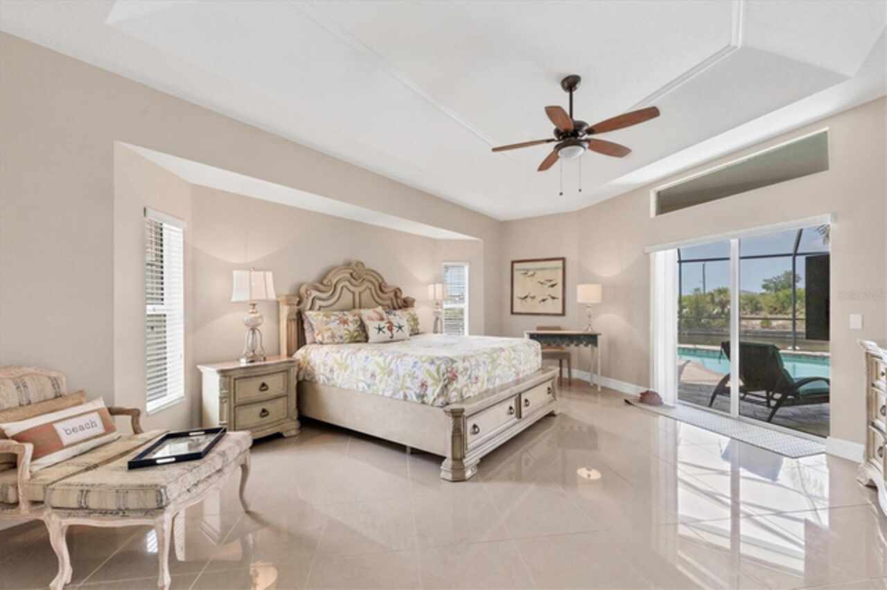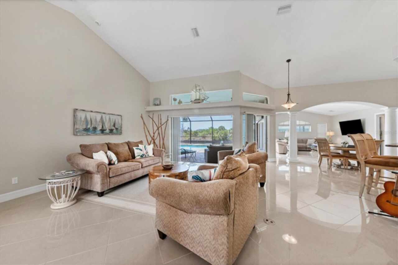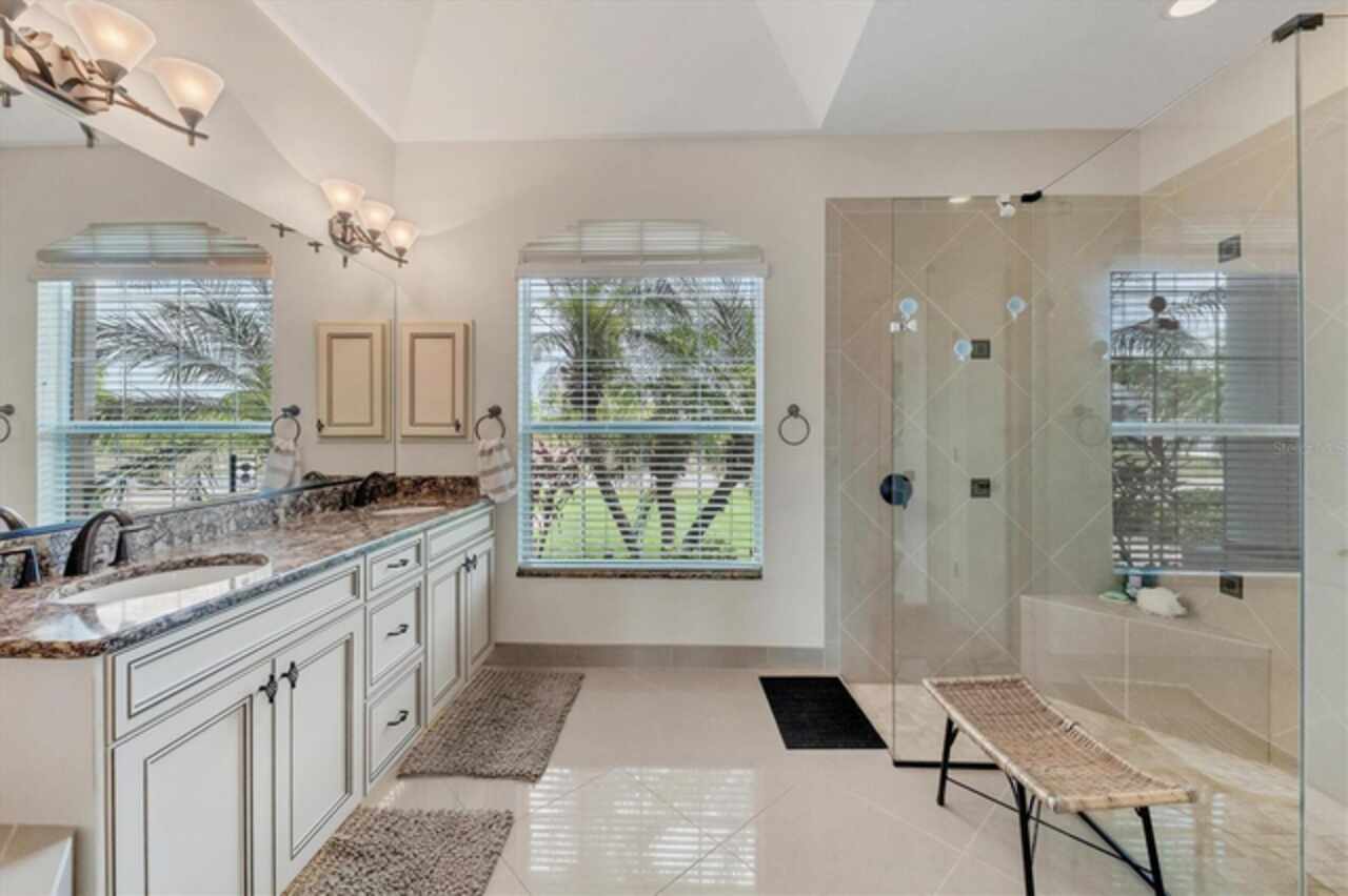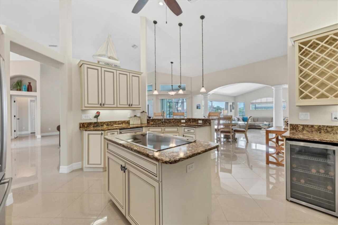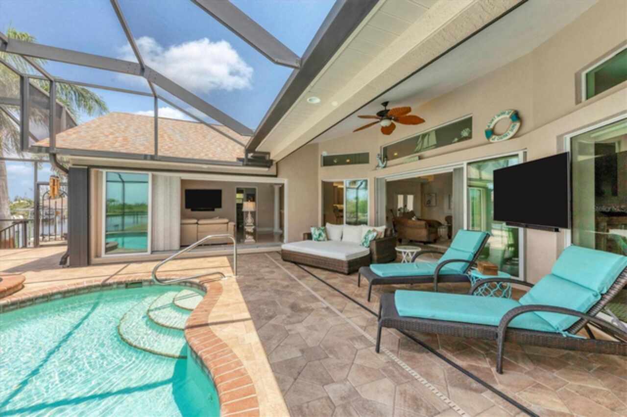 Welcome to your own slice of paradise in the serene and highly sought-after community of South Gulf Cove. This stunning custom-built home offers the ultimate in waterfront living with a full seawall, a concrete dock complete with water, electric, and a fish cleaning station, and a 15, 000 lb. covered boat lift — all topped with a custom-matched roof installed in 2022 to seamlessly blend with the home. As you arrive, you'll be immediately impressed by the beautifully manicured landscaping, stamped concrete driveway and walkway, and the elegant curb appeal. Step through the double entry doors and be greeted by an abundance of natural light that pours into the open-concept living space, highlighting the gleaming polished tile floors and sophisticated architectural details throughout. Designed for entertaining, this home features two inviting living areas, a formal dining room, and a charming breakfast nook — all showcasing spectacular waterfront views. The chef’s kitchen is a true showstopper, offering granite countertops, solid wood cabinetry, under-cabinet lighting, a built-in wine rack and wine fridge, double ovens, Bosch cooktop with downdraft on a central island, matching Bosch appliances, and a central vacuum system. The popular Florida split floor plan provides maximum privacy, with the oversized primary suite tucked away from the guest bedrooms. The primary bedroom boasts a tray ceiling, a walk-in and reach-in closet, and sliding doors to the lanai. The en-suite bath features dual granite vanities, a private water closet, a glass-enclosed walk-in shower, and a luxurious soaking tub — perfect for unwinding after a day on the water. The guest bedrooms offer comfortable accommodations with reach-in closets and share a beautifully updated bathroom with a granite-topped vanity and a spacious tiled walk-in shower. The versatile laundry room connects conveniently to both the kitchen and garage and includes custom cabinetry, granite counters, and a sink — ideal for cleanup after outdoor projects. The oversized two-car garage is an enthusiast’s dream, with epoxy flooring, cobalt metal cabinetry, a built-in workbench, and extra space for storing gear or toys. Step outside to your private resort-style lanai, featuring a saltwater heated pool and attached hot tub with upgraded Wi-Fi controls for ultimate comfort. Lounge under the covered area and catch your favorite show, or rinse off in the outdoor shower after a day in the sun. A separate pool bath and storage room complete this exceptional outdoor living space. Located minutes from the pristine beaches of Boca Grande, top-rated golf courses, and world-class fishing in Charlotte Harbor and the Gulf of Mexico, this home offers the Florida lifestyle you've been dreaming of.