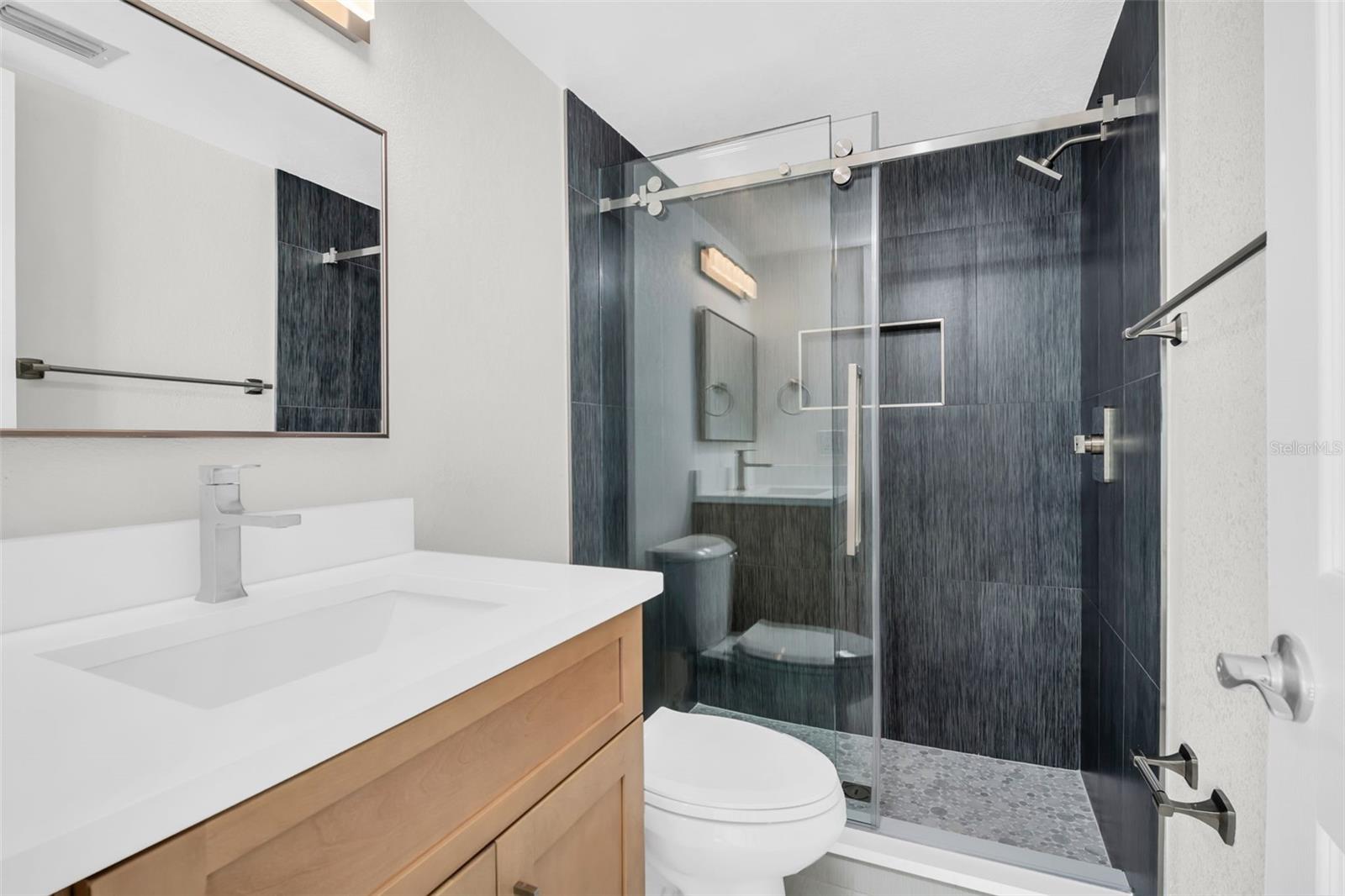 Under contract-accepting backup offers. One or more photo(s) was virtually staged. Ground-Floor Waterfront Condo with direct access to residents only white sandy beach in Clearwater Point’s Admiral House (55+) has been meticulously remodeled and is move-in ready. Beautiful Southern views of the Intracoastal Waterway, Sand Key Bridge, and the Gulf of Mexico through floor-to-ceiling windows & sliding doors. Walk out onto the oceanfront patio that connects the main living areas directly to the shoreline. The interior offers 2 bedrooms, 2 full bathrooms, an open kitchen/dining/great room, and a separate Florida room, all oriented toward the water. The new kitchen includes new cabinetry, island with seating and storage, quartz countertops, tiled backsplash, and stainless-steel appliances. Both bathrooms are fully updated with tiled walk-in showers and new vanities. All flooring, doors, lighting, and fixtures have been replaced, and a dedicated laundry room with a new stackable Samsung washer and dryer is located inside the unit. The primary suite features open-water views and direct access to the patio and beach. High-impact hurricane-rated windows and sliders provide peace of mind. Assigned parking space #20 is included with the condo. Residents have use of a large beachfront patio area, 3 heated pools and a spa, waterfront grill stations with dining tables & firepit, and the Clearwater Point beach. The community also offers tennis courts, pickleball, shuffleboard, and security in an active 55+ setting. Located in South Clearwater Beach, the property is close to local restaurants, shops, and entertainment, and is steps from Clearwater Yacht Club and Sand Key Bridge for convenient access on and off the beach. Admiral House has completed both the Milestone Inspection and the Reserve Study, and the association is currently fully funded with no special assessments planned, offering added financial stability for current and future owners. Recent HOA funded improvements include a new tile roof in 2020, flat roof in 2023, and redone car ports.