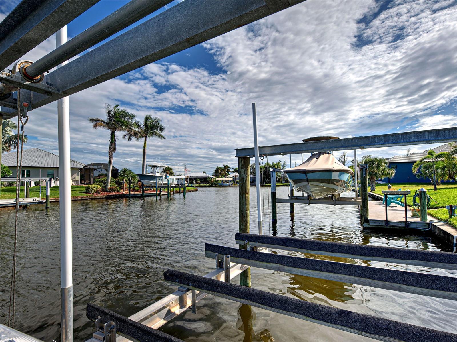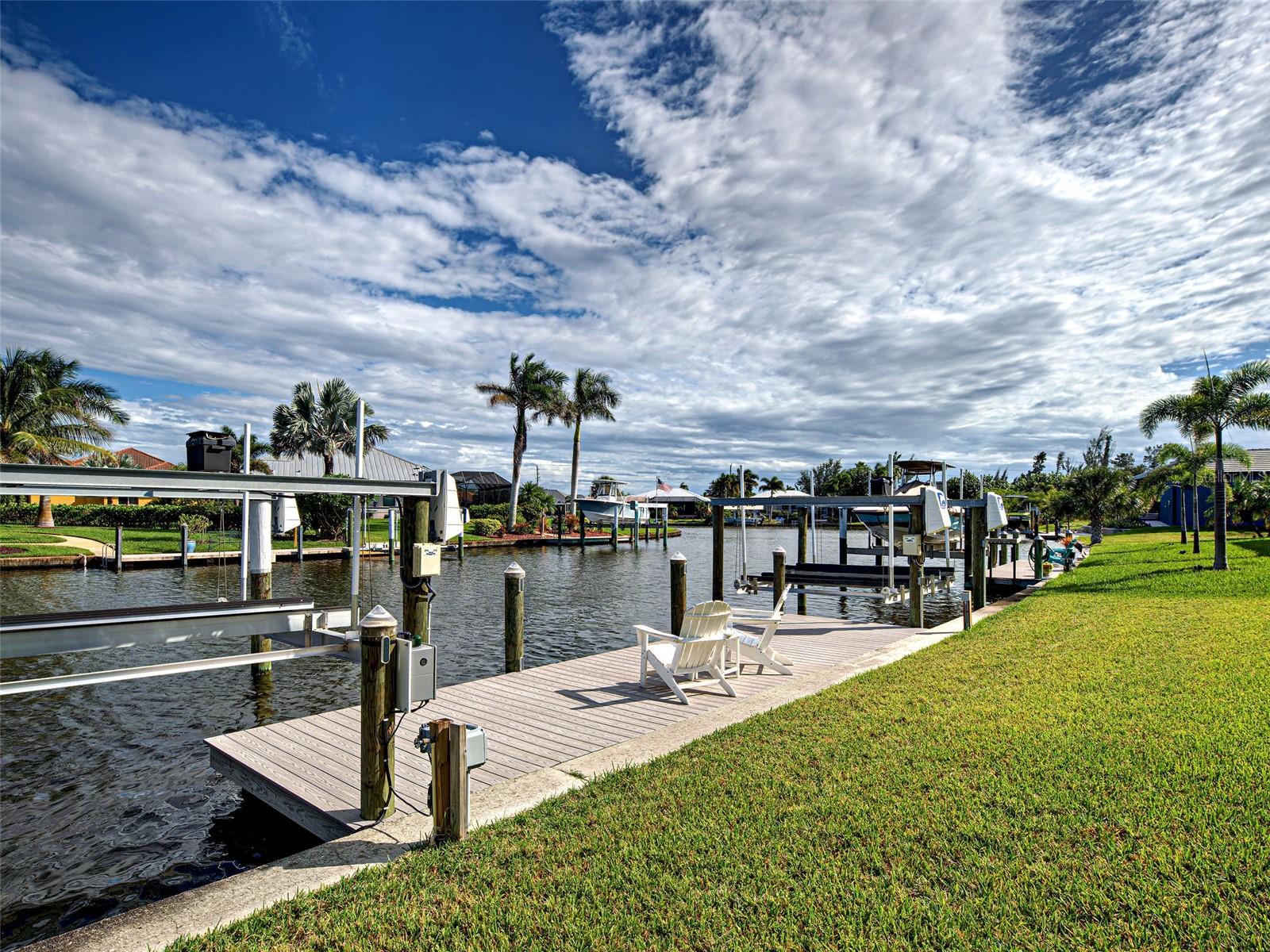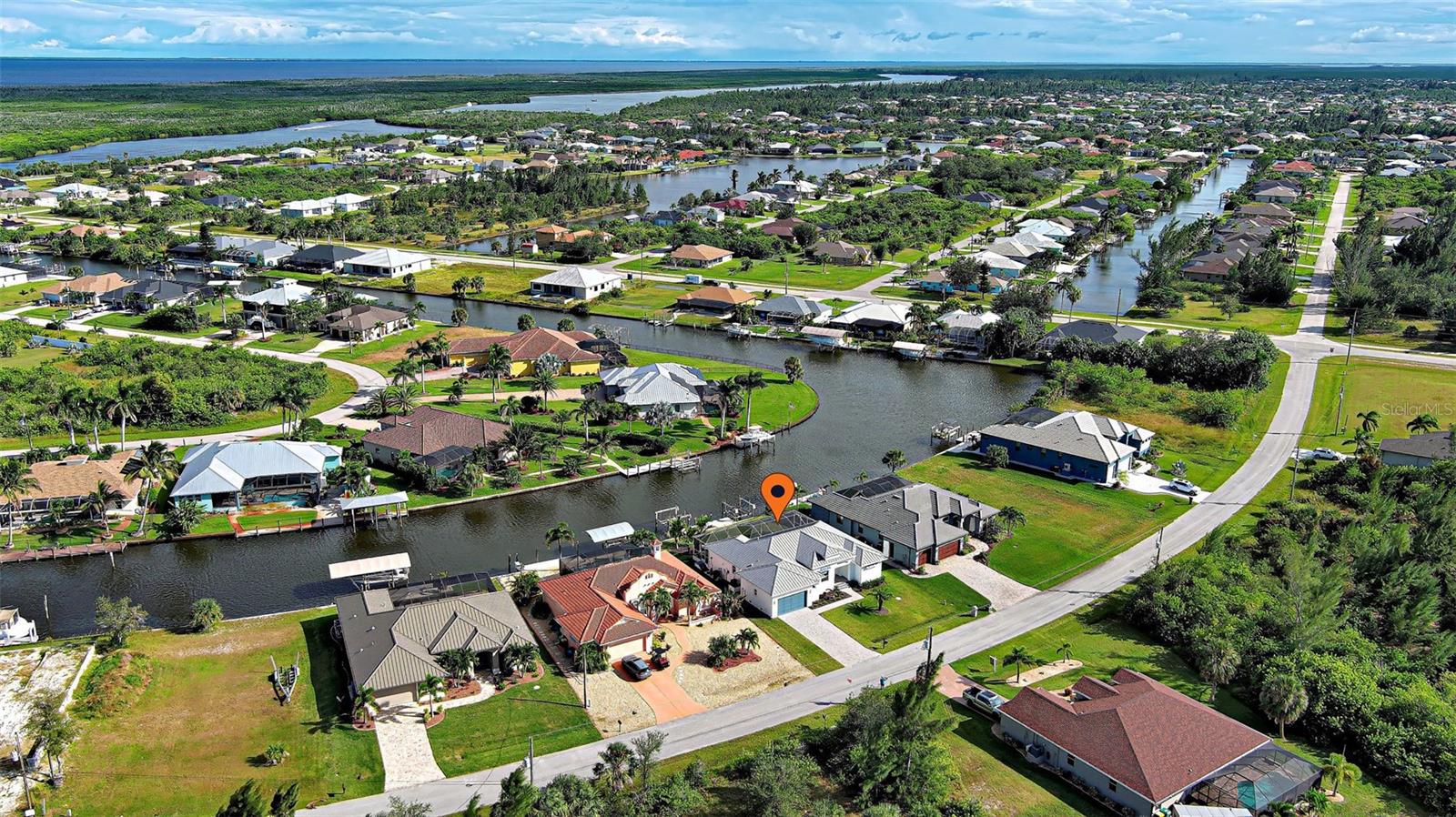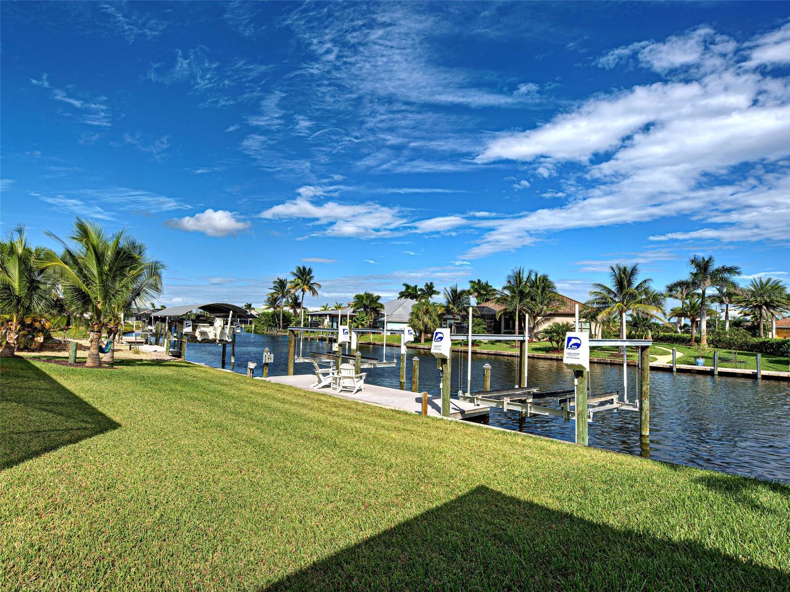 Under contract-accepting backup offers. Why deal with all the hassles of New Construction when this home checks all the Boxes? New High-end furniture, Smart TVs in all rooms await in this next level modern Luxury NEW WATERFRONT HOME located in the heart of South Gulf Cove in Section 93, with a SEAWALL, BOATDOCK, BOAT and WAVERUNNERLIFTS, equipped with HURRICANE IMPACT WINDOWS and METAL ROOF built to the new FLOOD ELEVATION requirements. PRIME location w/direct access to the open water & beyond! Brand new Home with 4 bedrooms (2 mastersuites) / 3 baths / pool / jacuzzi / pool heater / boat dock / boatlifts. Exquisite Florida SAILBOAT waterfront retreat, sitting on a concrete seawalled lot offering a world of modern luxury including a thoughtfully designed split open floor plan boasting a main bedroom, a junior suite/in-law suite and 2 guest bedrooms with a total of three bathrooms, one of them also serving as pool bath. This brand new coastal haven with stylish decorative Bahama Shutters offers a bright and airy floor plan that seamlessly blends indoor and outdoor living thanks to 3 stacking 8 FT Hurricane Impact resistant sliders on one side and a 90 degree slider on the other so you can bring the outside in. The Great Room comes with a 12 FT coffered ceiling with LED mood lights, Dramatic Kitchen with 3cm Bali Quartz, with waterfall left & right of island, new Stainless steel appliances, Farm House sink, lots of counter space, integrated microwave, a wine refrigerator, light grey Subway Tile backsplash, pantry with wood shelving, light grey soft close cabinets in kitchen and all 3 baths. The well-appointed kitchen is a chef's delight, equipped with GE appliances, ample cabinetry, and a convenient breakfast bar. It's the perfect space to prepare delicious meals while enjoying panoramic views of the waterway. The Master suite is separated from main living by a modern Barndoor, sliders to pool deck, 2 walk-in-closets and dramatic bath with his and hers separate Bali Quartz vanities and a walk-around-shower including a rain shower are yours as well. The Junior Suite with double doors offers a large Walk-in-Closet an en-suite bathroom with shower, neon light mirror cabinet and single sink. The two Guest bedrooms share a bathroom with walk in shower, neon light mirror cabinet and single Sink. This Bathroom offers direct access to the pool deck. Outside, your private oasis awaits, complete with a custom-designed rectangular pool with Sunshelf and Hot Tub, both with upgrade Pebbletec finish and Italian glass tiles and a new electric pool heater framed by a picturesque cage with 3 large Panorama screens, whereas all pool function can be controlled on your cellphone by a Jandy System. Situated on a lot with concrete seawall and lush landscaping, this residence epitomizes serenity and tranquility, offering the perfect opportunity for serious boaters with a 8x30 FT private Trexwood dock, with upgraded to Solar-powered Dolphin 10, 000# hybrid boat lift and a Dolphin 7, 000# hybrid boat lift set up for 2 jet ski, inviting you to embark on endless adventures. Dock is prewired for electric and water! Laundry room with sink, front loading washer/dryer and same light grey upper cabinets. All flooring is wood look Luxury Vinyl and light grey ceramic tiles in all bathrooms. 2 Car Garage with EV ready plug and Epoxy floor. Metal roof with spray foam insulation will keep your energy bills low. Irrigation, St. Augustine grass. All furniture included / Decoration and Comforters not included.