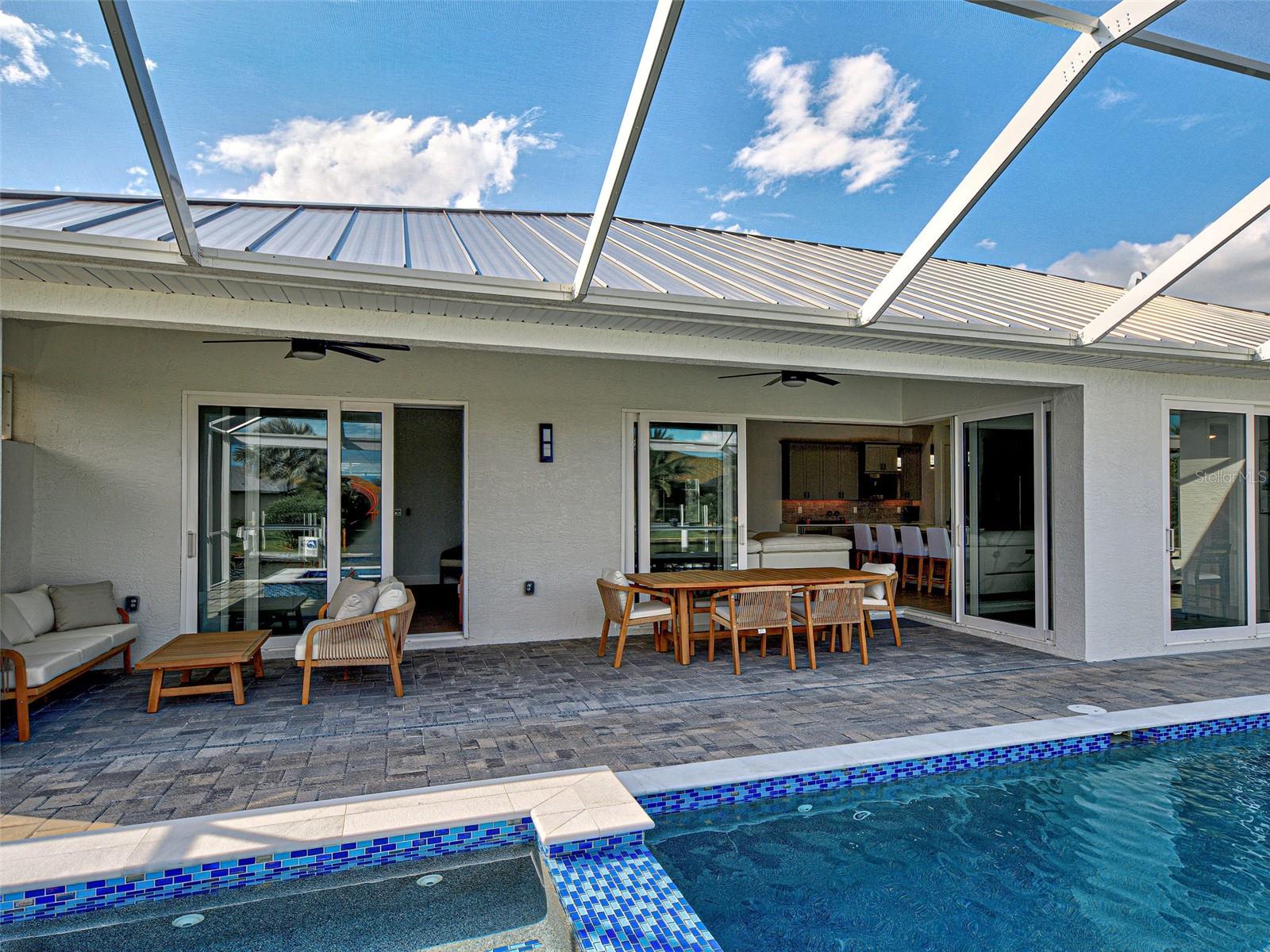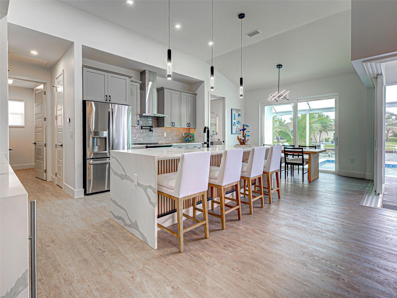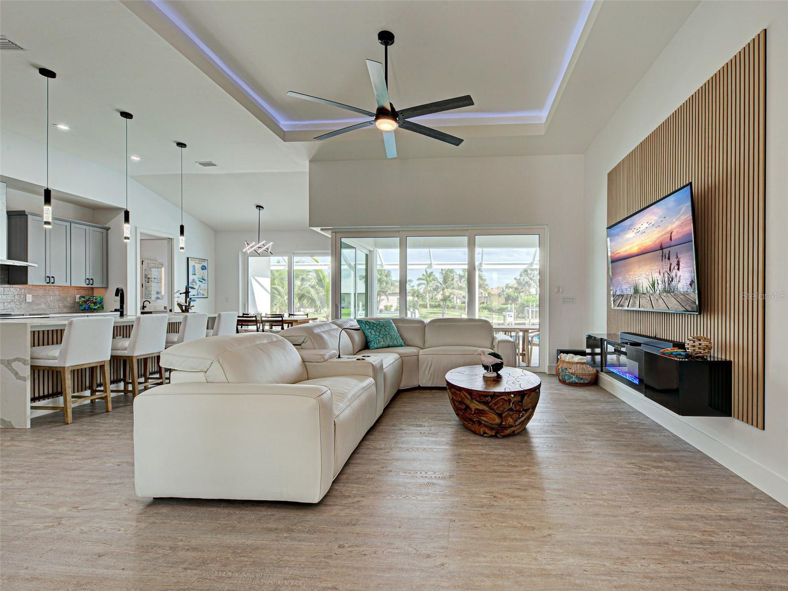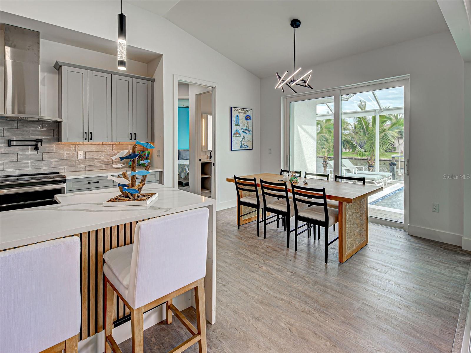 Under contract-accepting backup offers. Why deal with all the hassles of New Construction when this home checks all the Boxes? New High-end furniture, Smart TVs in all rooms await in this next level modern Luxury NEW WATERFRONT HOME located in the heart of South Gulf Cove in Section 93, with a SEAWALL, BOATDOCK, BOAT and WAVERUNNERLIFTS, equipped with HURRICANE IMPACT WINDOWS and METAL ROOF built to the new FLOOD ELEVATION requirements. PRIME location w/direct access to the open water & beyond! Brand new Home with 4 bedrooms (2 mastersuites) / 3 baths / pool / jacuzzi / pool heater / boat dock / boatlifts. Exquisite Florida SAILBOAT waterfront retreat, sitting on a concrete seawalled lot offering a world of modern luxury including a thoughtfully designed split open floor plan boasting a main bedroom, a junior suite/in-law suite and 2 guest bedrooms with a total of three bathrooms, one of them also serving as pool bath. This brand new coastal haven with stylish decorative Bahama Shutters offers a bright and airy floor plan that seamlessly blends indoor and outdoor living thanks to 3 stacking 8 FT Hurricane Impact resistant sliders on one side and a 90 degree slider on the other so you can bring the outside in. The Great Room comes with a 12 FT coffered ceiling with LED mood lights, Dramatic Kitchen with 3cm Bali Quartz, with waterfall left & right of island, new Stainless steel appliances, Farm House sink, lots of counter space, integrated microwave, a wine refrigerator, light grey Subway Tile backsplash, pantry with wood shelving, light grey soft close cabinets in kitchen and all 3 baths. The well-appointed kitchen is a chef's delight, equipped with GE appliances, ample cabinetry, and a convenient breakfast bar. It's the perfect space to prepare delicious meals while enjoying panoramic views of the waterway. The Master suite is separated from main living by a modern Barndoor, sliders to pool deck, 2 walk-in-closets and dramatic bath with his and hers separate Bali Quartz vanities and a walk-around-shower including a rain shower are yours as well. The Junior Suite with double doors offers a large Walk-in-Closet an en-suite bathroom with shower, neon light mirror cabinet and single sink. The two Guest bedrooms share a bathroom with walk in shower, neon light mirror cabinet and single Sink. This Bathroom offers direct access to the pool deck. Outside, your private oasis awaits, complete with a custom-designed rectangular pool with Sunshelf and Hot Tub, both with upgrade Pebbletec finish and Italian glass tiles and a new electric pool heater framed by a picturesque cage with 3 large Panorama screens, whereas all pool function can be controlled on your cellphone by a Jandy System. Situated on a lot with concrete seawall and lush landscaping, this residence epitomizes serenity and tranquility, offering the perfect opportunity for serious boaters with a 8x30 FT private Trexwood dock, with upgraded to Solar-powered Dolphin 10, 000# hybrid boat lift and a Dolphin 7, 000# hybrid boat lift set up for 2 jet ski, inviting you to embark on endless adventures. Dock is prewired for electric and water! Laundry room with sink, front loading washer/dryer and same light grey upper cabinets. All flooring is wood look Luxury Vinyl and light grey ceramic tiles in all bathrooms. 2 Car Garage with EV ready plug and Epoxy floor. Metal roof with spray foam insulation will keep your energy bills low. Irrigation, St. Augustine grass. All furniture included / Decoration and Comforters not included.