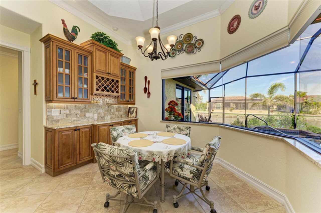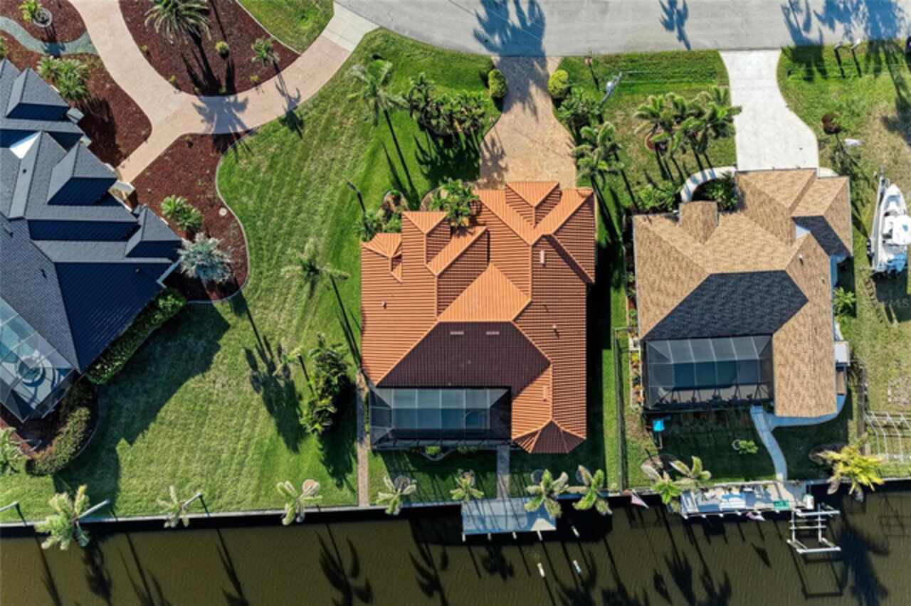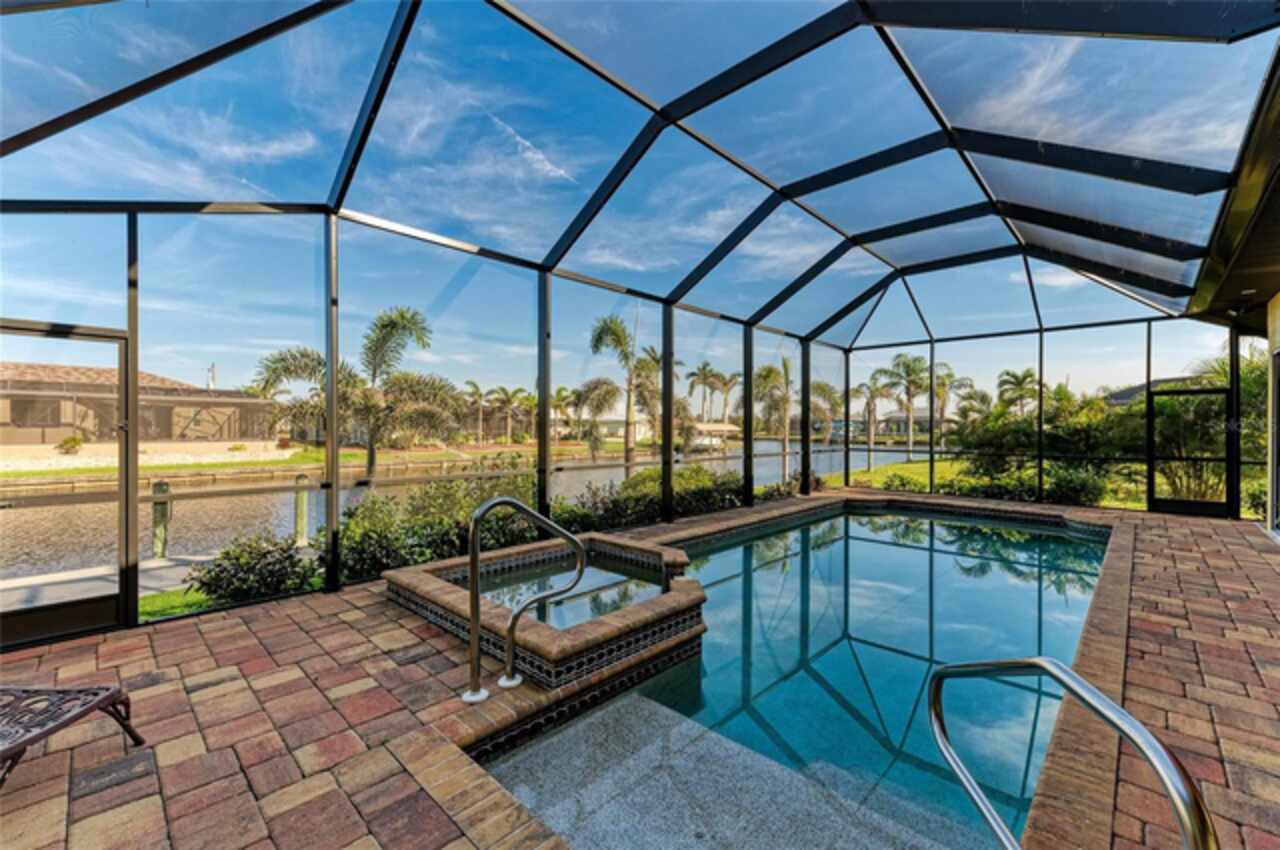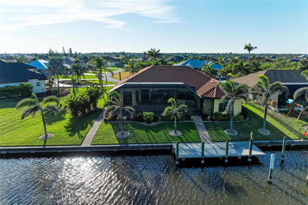 Welcome to an exceptional waterfront property nestled on an expansive, oversized lot. Designed by the seller, this custom, meticulously maintained waterfront home offers the perfect blend of luxury, comfort, and functionality. From the moment you approach, the brick paver driveway and walkway lead you to a single-entry front door, inviting you into the spacious, beautifully designed interior. Step inside and view the open floor plan layout merging the foyer, great room, nook, and kitchen, ideal for entertaining family and friends while offering picturesque views of the waterfront. Every room features stylish diagonal tile flooring, wide door frame moldings with intricate corner rosettes adorning 8 foot doors, and tray ceilings throughout. Crown molding accents add sophistication to the living areas and owners' suite. The heart of the home is the kitchen, offering a breakfast bar, sleek stainless steel appliances, custom wood cabinetry with soft-close doors and pull-out drawers, and granite countertops. Under-cabinet lighting enhances the space, creating a warm, inviting ambiance. Wooden buffet with matching hutch featuring a wine rack, extend cabinetry to nook area creating opportunities for casual dining, while the aquarium window creates a light, airy atmosphere. The owners' suite is a private sanctuary featuring his/her walk-in closets and a spa-like ensuite bathroom featuring wood cabinets with under cabinet lighting, dual vanities with granite countertops, and a double entry walk through tiled Roman shower. Two spare bedrooms offer both functionality and privacy for your guests or family members. Numerous sliding doors open to the lanai, where you'll find beautiful brick pavers, an outdoor shower, oversized sparkling 10, 000-gallon heated saltwater pool complete with a sun shelf, bench space and spa—ideal for relaxing or entertaining. This spacious lanai provides ample room for seating where you can relax while listening to the sounds of nature. Enjoy connecting the indoor and outdoor environments when sliding doors are open meshing indoor and outdoor spaces. The lanai has been mechanically roughed-in with plumbing and electricity for an outdoor kitchen. The large laundry room features numerous upper and lower cabinets, closets and granite counter top. Numerous interior features include but are not limited to grade 5 granite, ceiling lights, verti-glide and plantation shutters as window and door treatments, impact glass windows and doors, niches, granite window sills and more. The oversized 3-car garage is designed with functionality in mind, offering ample storage closets, elevated Air handler, and an epoxy floor for a polished finish. Exterior features include a sprinkler system, tile roof, mature landscaping ensconced by concrete curbing, stemwall construction, and individual garage doors for separate entrances. For boating enthusiasts and waterfront lovers, a 10x30-foot concrete dock with both water and electricity is available for your convenience.. Mature landscaping surrounds the home, showcasing beautiful, lush vegetation thoughtfully ensconced with curbing around the garden beds, providing an inviting and serene atmosphere. Why wait? This exceptional home combines modern comfort with luxurious details—perfect for anyone seeking style, space, and functionality and it could be yours as the property is being sold FURNISHED, TURNKEY minus a few personal items.