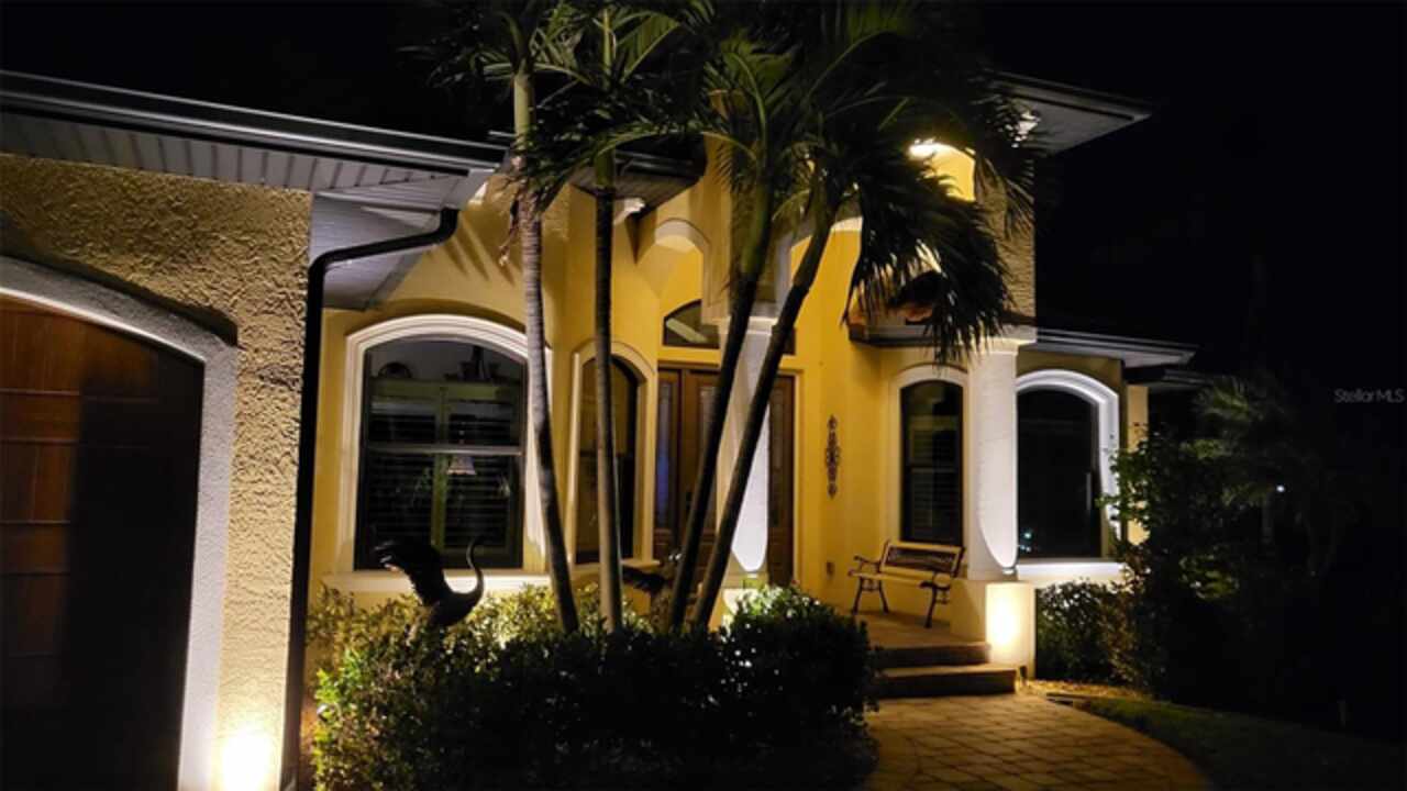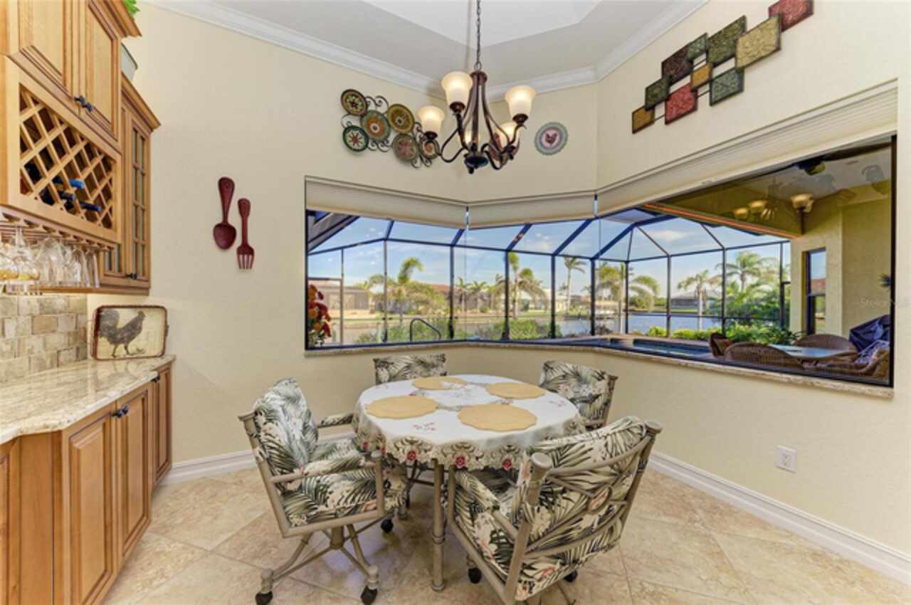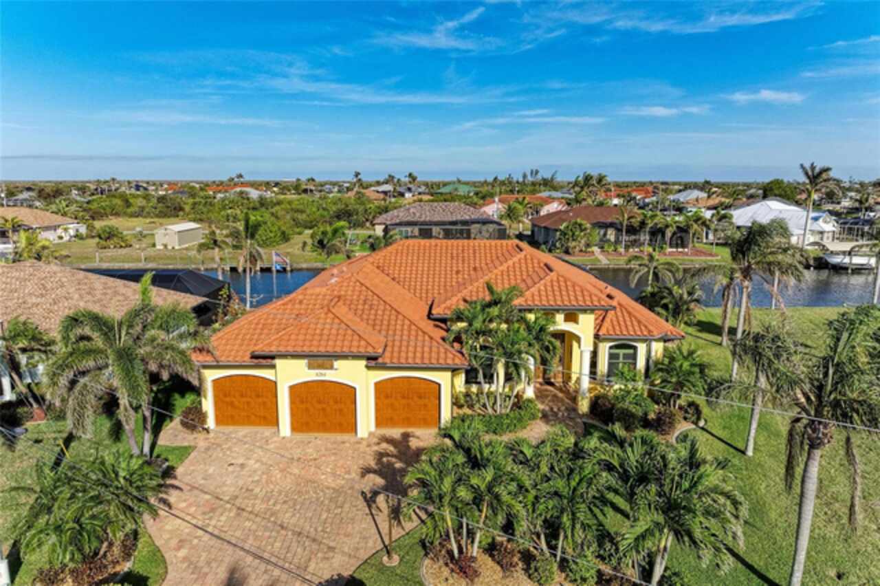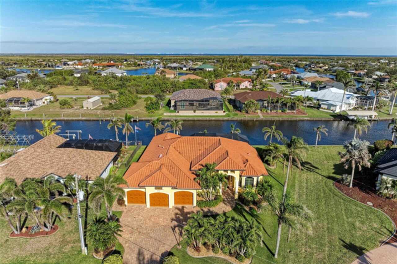 Welcome to an exceptional waterfront property nestled on an expansive, oversized lot. Designed by the seller, this custom, meticulously maintained waterfront home offers the perfect blend of luxury, comfort, and functionality. From the moment you approach, the brick paver driveway and walkway lead you to a single-entry front door, inviting you into the spacious, beautifully designed interior. Step inside and view the open floor plan layout merging the foyer, great room, nook, and kitchen, ideal for entertaining family and friends while offering picturesque views of the waterfront. Every room features stylish diagonal tile flooring, wide door frame moldings with intricate corner rosettes adorning 8 foot doors, and tray ceilings throughout. Crown molding accents add sophistication to the living areas and owners' suite. The heart of the home is the kitchen, offering a breakfast bar, sleek stainless steel appliances, custom wood cabinetry with soft-close doors and pull-out drawers, and granite countertops. Under-cabinet lighting enhances the space, creating a warm, inviting ambiance. Wooden buffet with matching hutch featuring a wine rack, extend cabinetry to nook area creating opportunities for casual dining, while the aquarium window creates a light, airy atmosphere. The owners' suite is a private sanctuary featuring his/her walk-in closets and a spa-like ensuite bathroom featuring wood cabinets with under cabinet lighting, dual vanities with granite countertops, and a double entry walk through tiled Roman shower. Two spare bedrooms offer both functionality and privacy for your guests or family members. Numerous sliding doors open to the lanai, where you'll find beautiful brick pavers, an outdoor shower, oversized sparkling 10, 000-gallon heated saltwater pool complete with a sun shelf, bench space and spa—ideal for relaxing or entertaining. This spacious lanai provides ample room for seating where you can relax while listening to the sounds of nature. Enjoy connecting the indoor and outdoor environments when sliding doors are open meshing indoor and outdoor spaces. The lanai has been mechanically roughed-in with plumbing and electricity for an outdoor kitchen. The large laundry room features numerous upper and lower cabinets, closets and granite counter top. Numerous interior features include but are not limited to grade 5 granite, ceiling lights, verti-glide and plantation shutters as window and door treatments, impact glass windows and doors, niches, granite window sills and more. The oversized 3-car garage is designed with functionality in mind, offering ample storage closets, elevated Air handler, and an epoxy floor for a polished finish. Exterior features include a sprinkler system, tile roof, mature landscaping ensconced by concrete curbing, stemwall construction, and individual garage doors for separate entrances. For boating enthusiasts and waterfront lovers, a 10x30-foot concrete dock with both water and electricity is available for your convenience.. Mature landscaping surrounds the home, showcasing beautiful, lush vegetation thoughtfully ensconced with curbing around the garden beds, providing an inviting and serene atmosphere. Why wait? This exceptional home combines modern comfort with luxurious details—perfect for anyone seeking style, space, and functionality and it could be yours as the property is being sold FURNISHED, TURNKEY minus a few personal items.