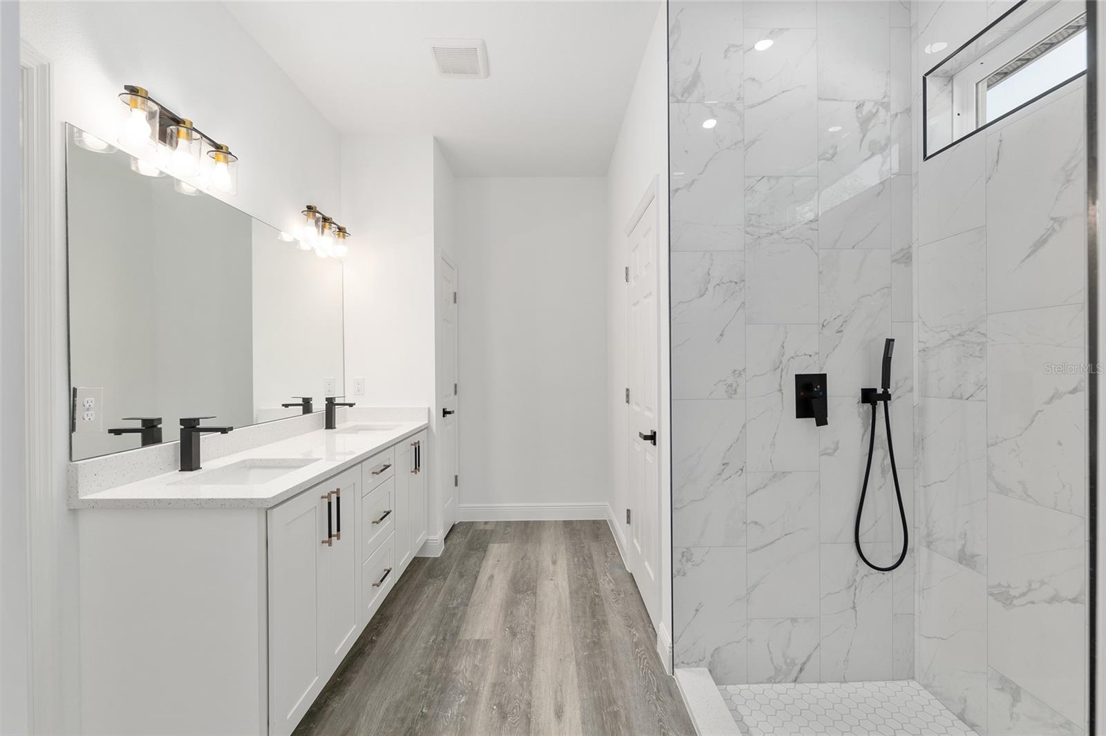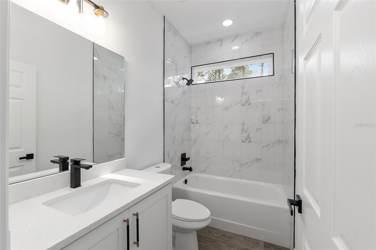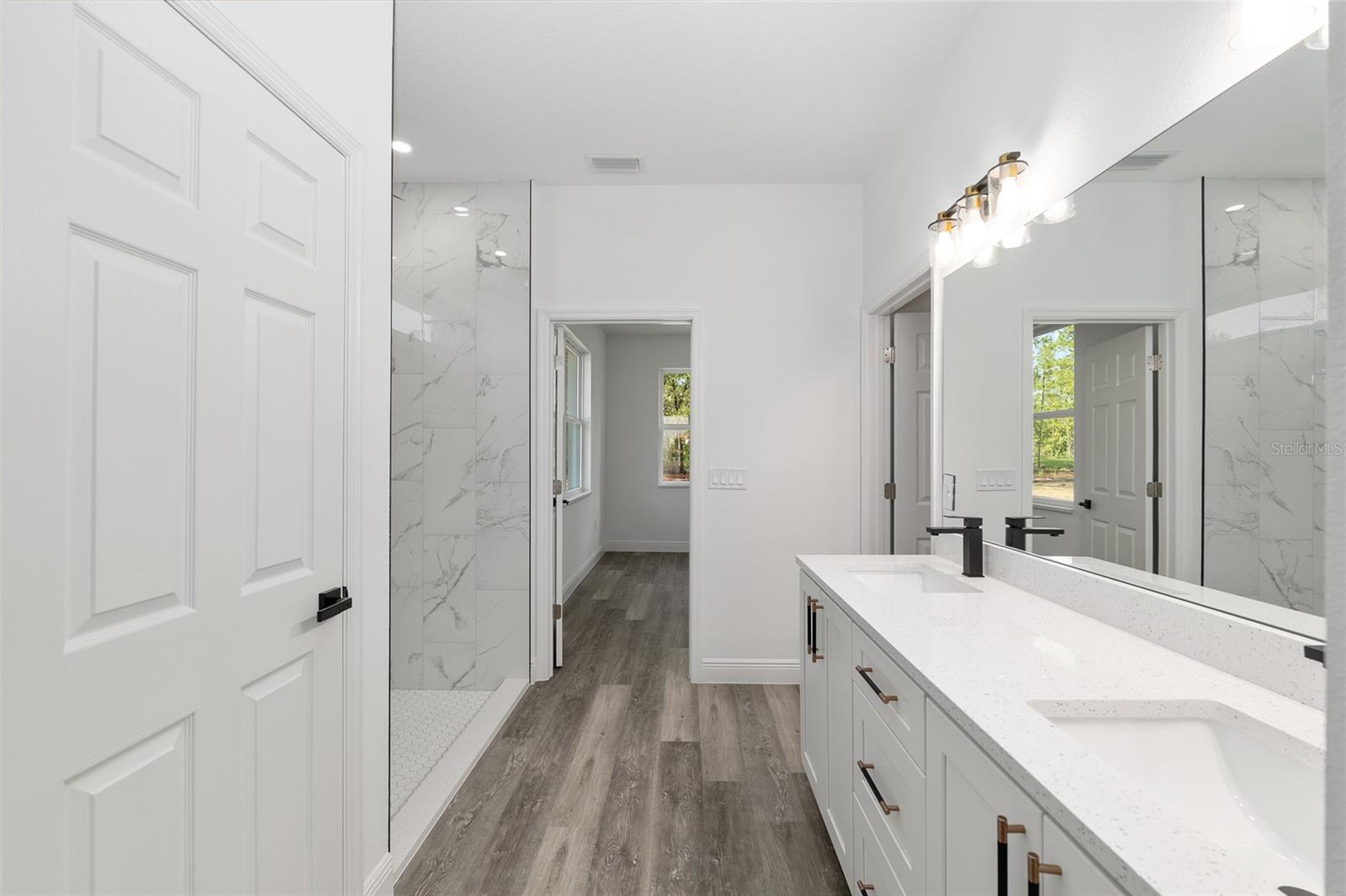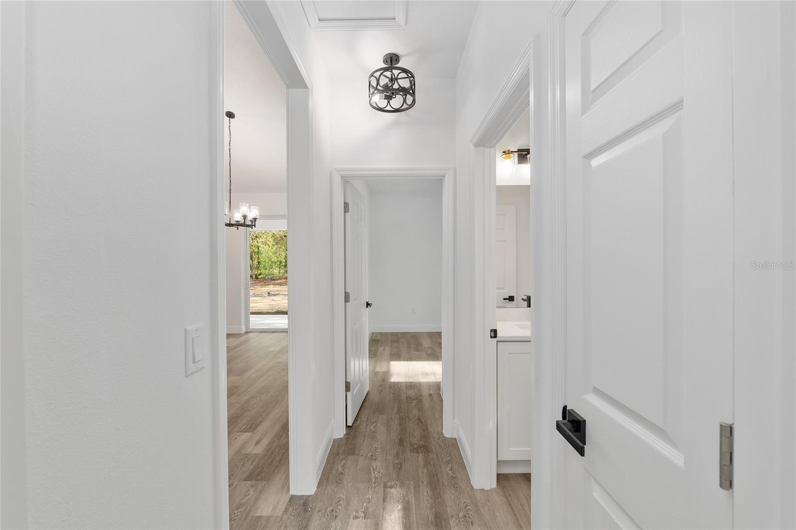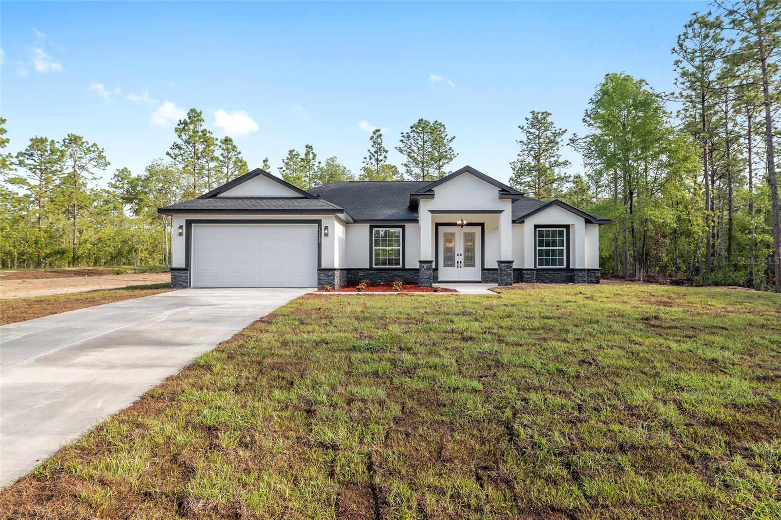 One or more photo(s) has been virtually staged. Under Construction. Brand New Modern Home on 1.16 Acres. A 3 Bed 2 Bath 1840 Sq Ft Living No HOA or CDD This beautifully designed new construction sits on a spacious 1.16 acre lor , giving you the freedom to enjoy your property without restrictions. Inside, the home offers 1840 sq ft of living space with an open concept layout, 3 bedrooms, 2 bathrooms, and clean modern finishes throughout. Enjoy high ceilings, luxury vinyl plank flooring with no carpet, and a bright kitchen with quartz countertops, stainless steel appliances, and a large center island that opens up to the living and dining area. The primary bedroom features a tray ceiling, walk-in closet, and a well-designed bathroom with a step down walk-in shower, double sinks, and matte black fixtures. Two additional bedrooms and a full guest bath provide comfortable space for family or visitors. French doors with decorative glass welcome you at the front entrance. The back patio is covered and ready for outdoor use. The laundry room includes a utility sink, and the two car garage offers plenty of room for parking and everyday needs. The exterior showcases a clean modern look with stone accents and black trim, matched with upgraded lighting and hardware throughout. Located just a short drive to SR 200, you’ll have quick access to restaurants, shops, grocery stores, and more while still enjoying the privacy of your own acre. This move-in-ready home offers a great balance of comfort, style, and space in a peaceful setting. Note: Interior photos are from a previous listing of the same model.