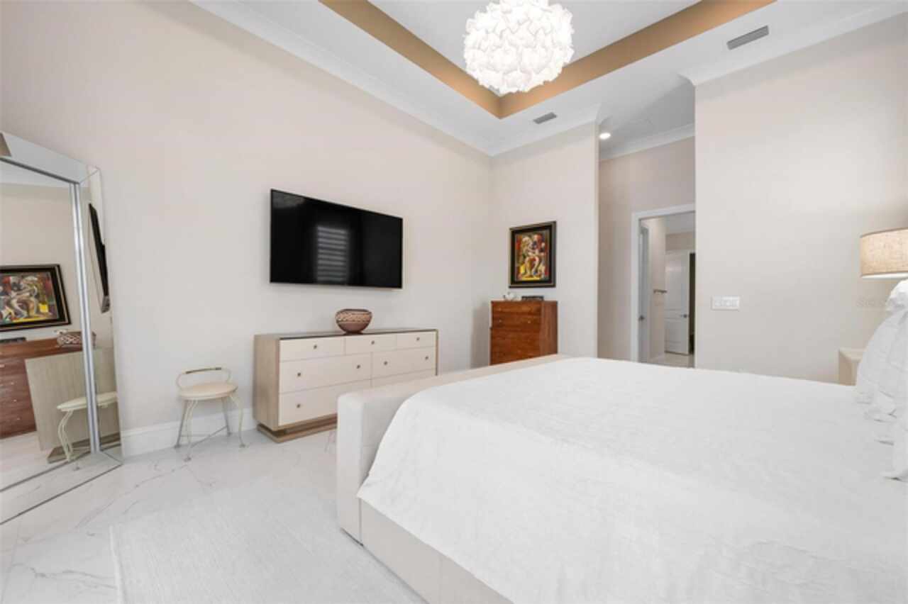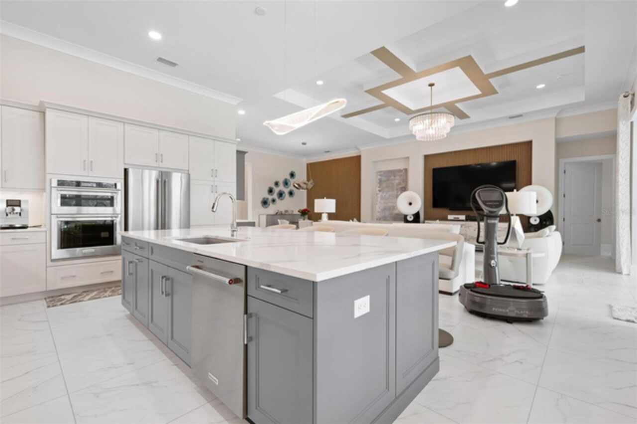 Ceiling Fans(s), Coffered Ceiling(s), Crown Molding, Dry Bar, Eat-in Kitchen, High Ceilings, In Wall Pest System, Kitchen/Family Room Combo, Open Floorplan, Primary Bedroom Main Floor, Solid Wood Cabinets, Split Bedroom, Stone Counters, Thermostat, Tray Ceiling(s), Walk-In Closet(s), Window Treatments