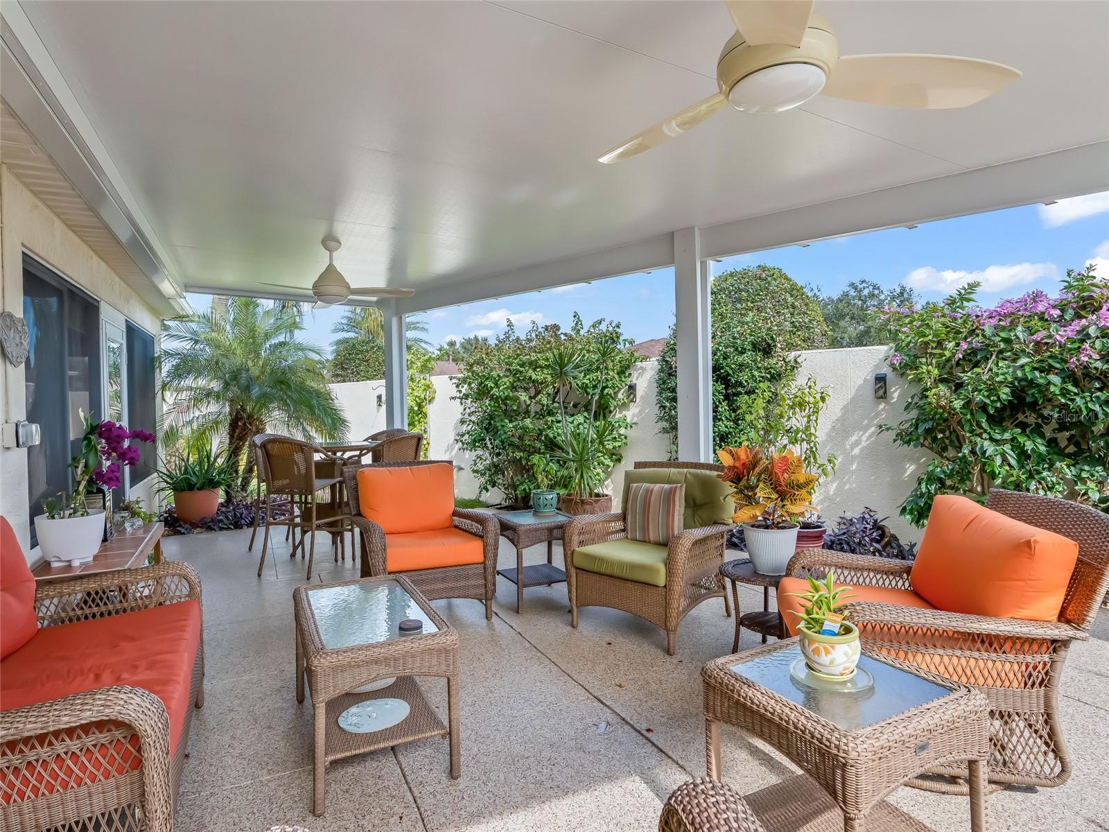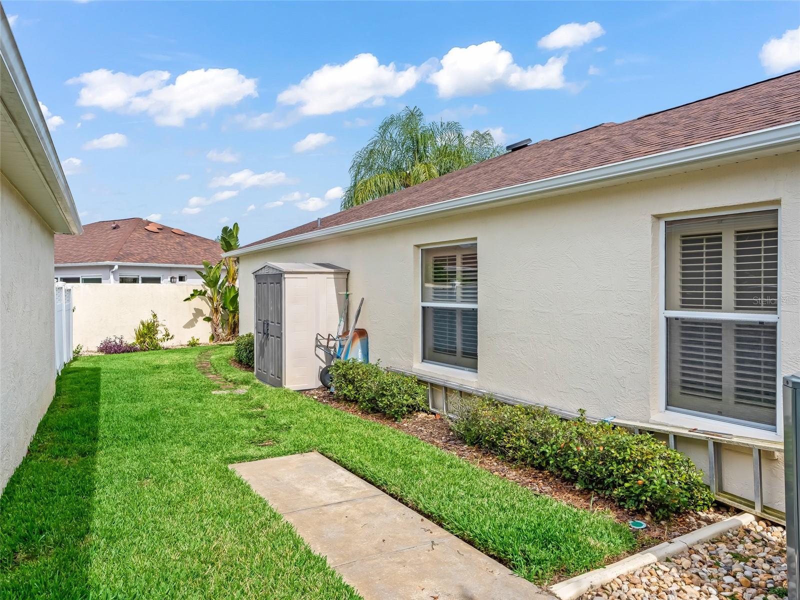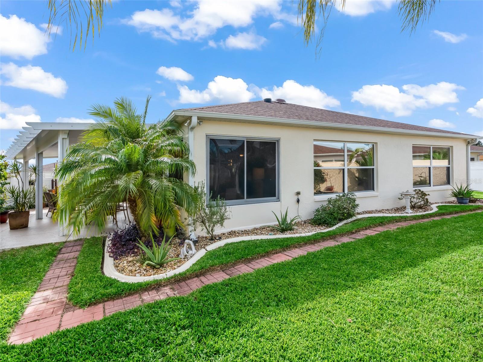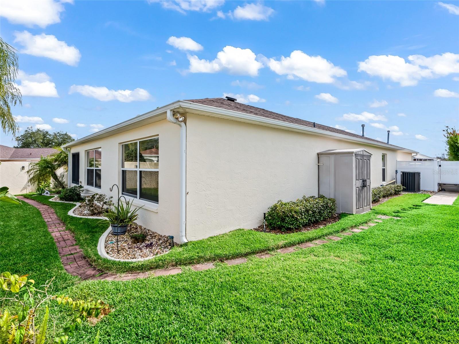 BOND PAID! This is truly an Ultimate Stoneybrook Courtyard Villa! 1580 heated sq ft of living!! New HVAC in 2020 and new roof in 2021!! Natural gas hot water heater, HVAC and stove. New garbage disposal and a built in trash compactor in 2020. New appliances in 2021- dishwasher, microwave, stove and frig. On a corner lot and landscaped to the hilt! A New 'hard topped' Pergola was added to the side yard patio and also has an insulated patio cover. The side patio has 'shark coating sealer' on the concrete, and it also includes 2 outdoor ceiling fans and ample outside outlets. There are 2 sides of glassed windows in 4 season Sunroom which looks out to the beauty of the groomed and plushly landscaped privacy fenced yard. The Florida room has ducted heat and air. Natural gas hook up for a grill at the entertaning side of the patio. The lot is fully fenced on all sides and comes with a garden shed (glass decorative pots and yard ornaments of potted plantings do not stay with the Villa) The bird bath and concrete bench do stay with the landscaped yard. The interior design is a rare one with a breakfast nook off the Kitchen plus a more formal dining area off the living room. The kitchen is delightfully decorated and includes new granite counter tops as does both bathrooms. There are sliding glassed doors to the Florida room. The living area (includes living room furniture except for the lamps and mirror and personal items) has views to the covered patio with pergola, and the back yard that's delightfully colorful with professional landscaping. Inside, the split bedroom arrangement includes a 3rd bedroom set up as an office, the 2nd bedroom is big and roomy and will delight any guest. The primary bedroom has huge walk in closets and ceilings with ceiling fan. Both bathrooms have ceramic tile floors. The ensuite bath includes a Roman shower and water closet plus dual sinks. The garage, with 2 foot expansion, includes a washer dryer (included in the package sale) area with utility sink, and pull down stairs for some attic storage. Plenty of natural light from the oversized window in the garage too. This consideration will be worth your while!