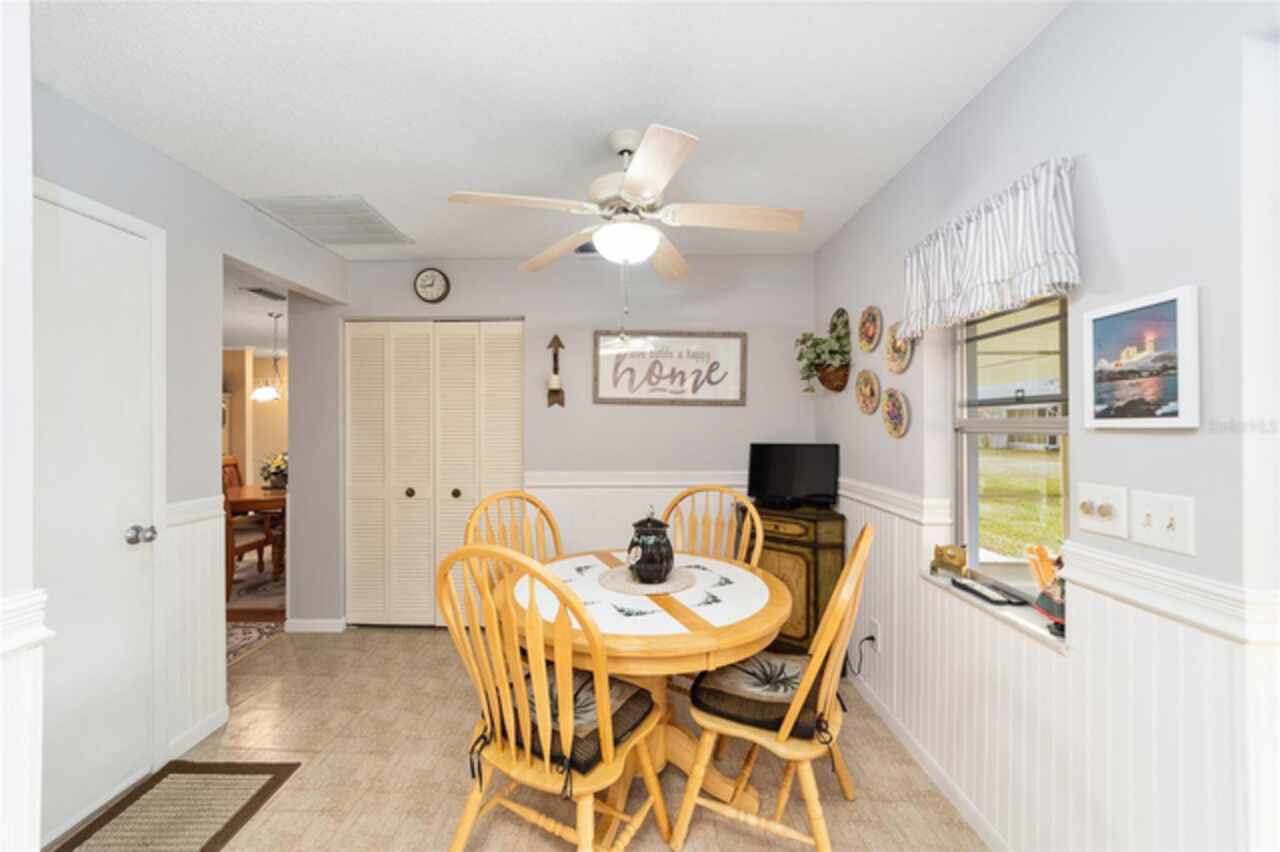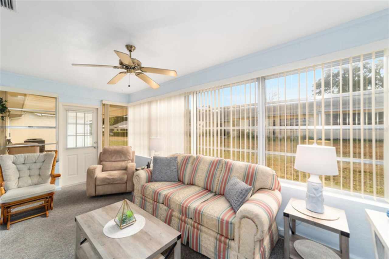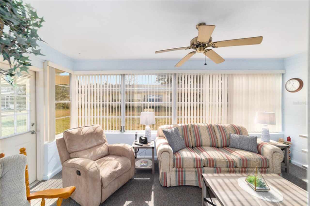 Nicely decorated villa with many extras. This expanded Philadelphian model villa is located in the much sought after 55+ community at On top of the World. A large front porch under roof welcomes you to the home. Room/Formal Dining area lie the Master and Guest Bedrooms joined by a common hallway and Guest Bath. The spacious Master Bedroom features a large walk-in closet and Master Bath with walk-in shower. Crown molding throught the house is an added feature. The glass enclosed Florida Room is under air and heat just beyond the kitchen, on the left side is a covered back patio perfect for cooking and entertaining. Kitchen features Stainless steel appliances The extra wide garage is perfect for parking your vehicle and a golf cart. Roof installed in 2017, Air conditioner replaced in 2021.Home is sold furnished or unfurnished. Enjoy the community's extensive amenities, including golf courses available with golf membership, indoor and outdoor pools, fitness center, racquetball, tennis, pickleball courts, walking trails, gardening areas, a hobby building, and an RC car area. With the convenience of taking your golf cart to nearby grocery stores and shopping centers ,