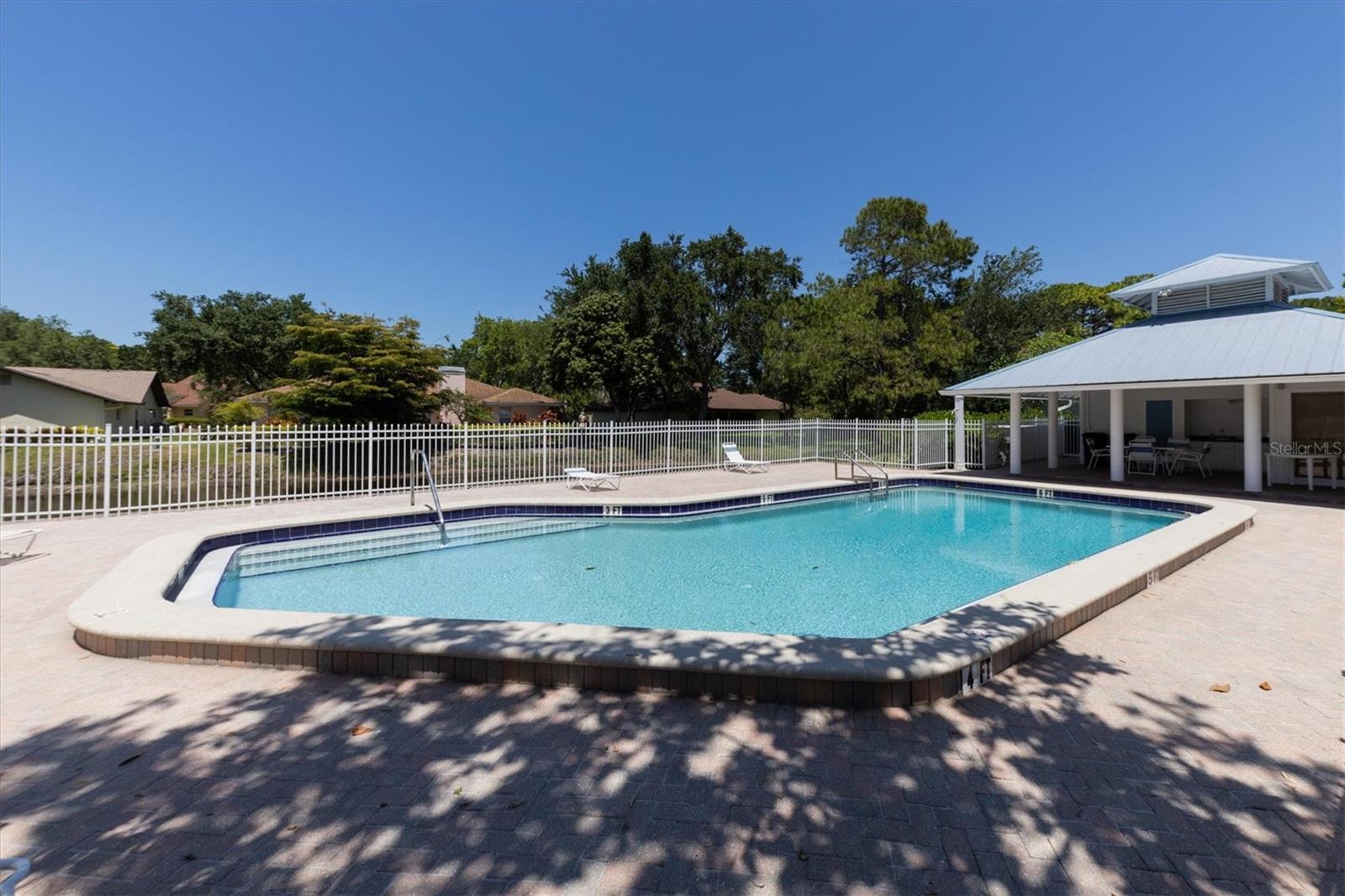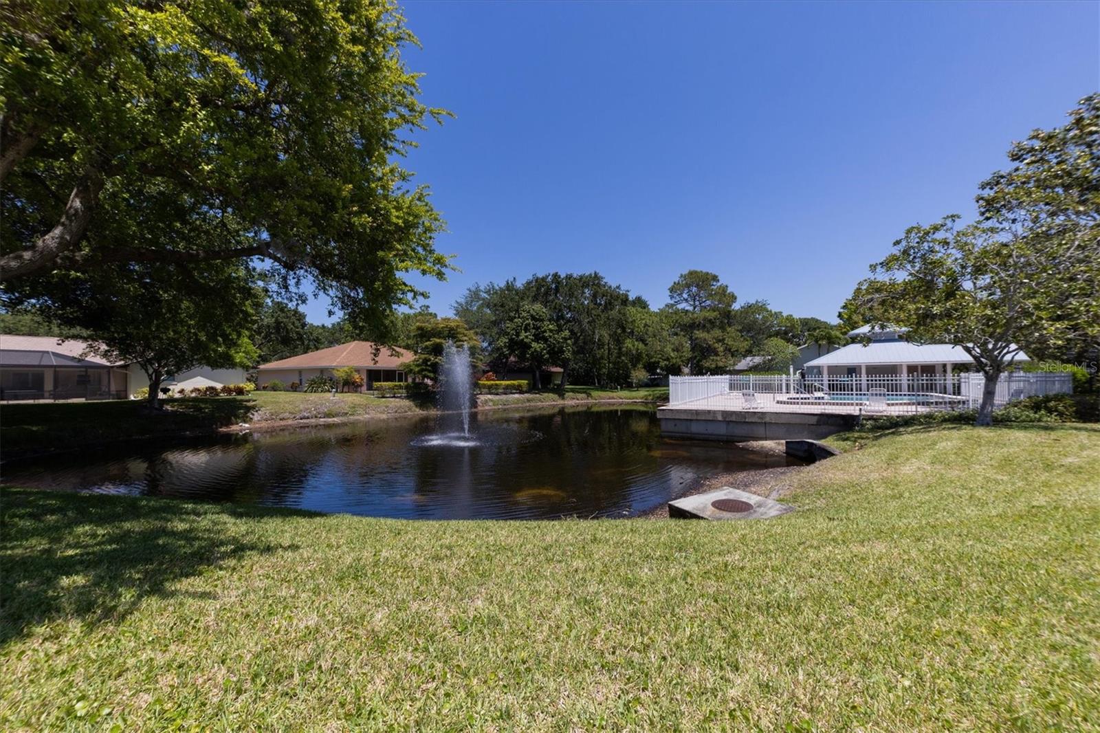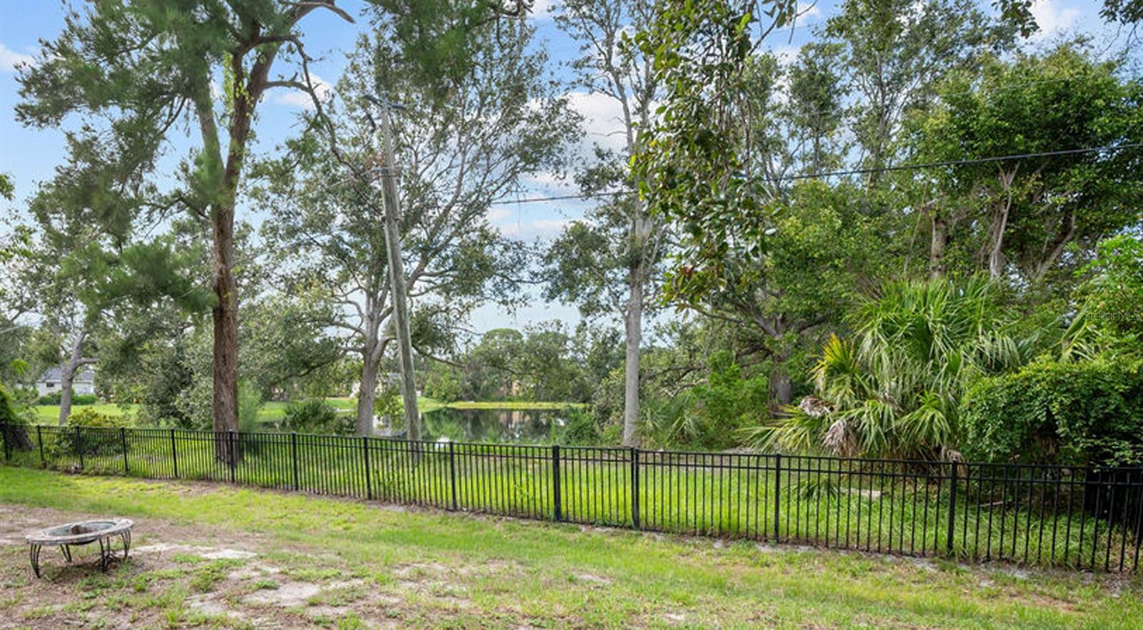 Private views of beautiful pond out back surrounded by mature landscaping with a wrought iron fence at the property line.