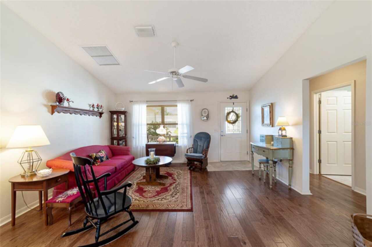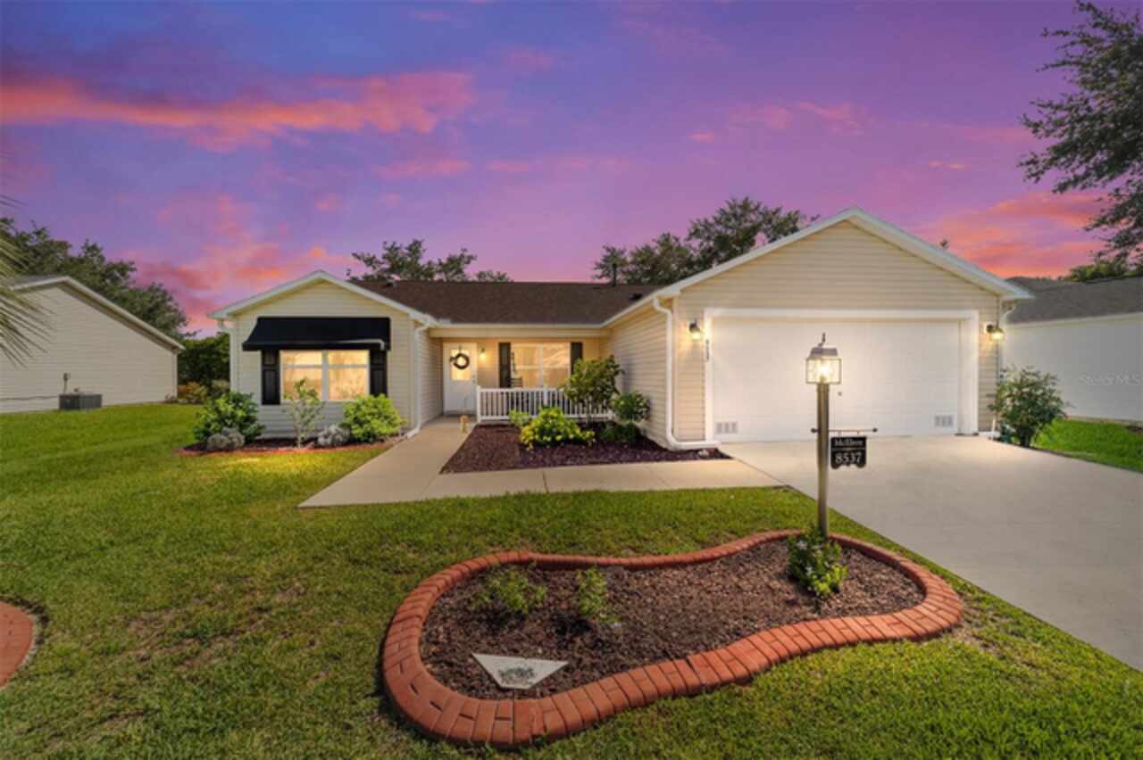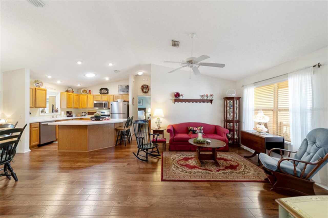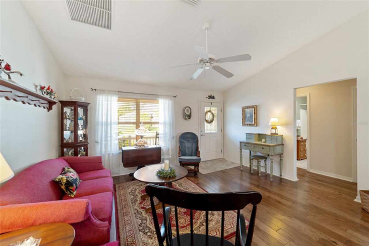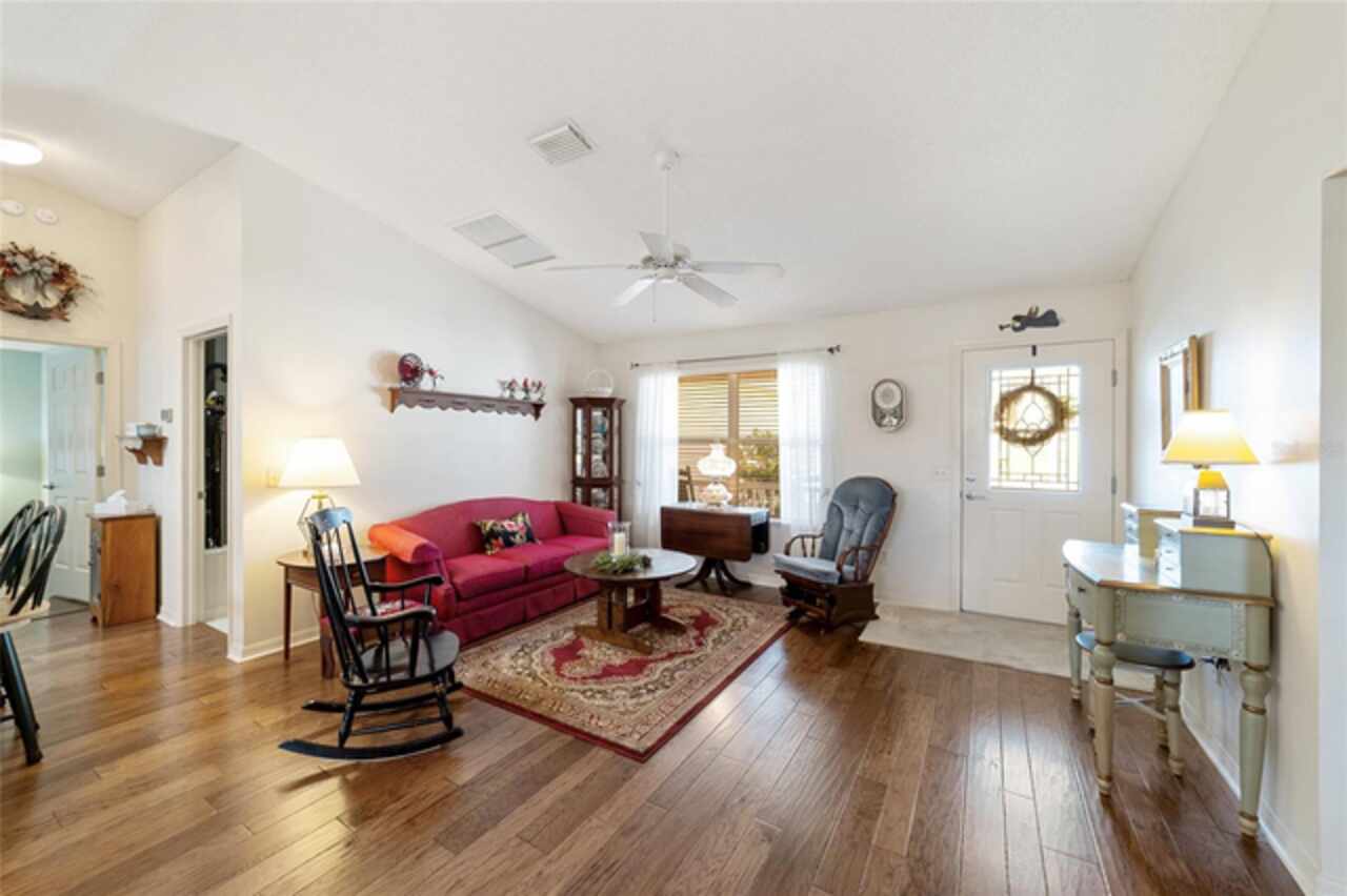 EXPANDED Amarillo Model with a 325 ft² FLORIDA ROOM added in The Villages. BOND IS PAID! No need to worry about ANYTHING because it has IMPRESSIVE upgrades and is METICULOUSLY MAINTAINED! *New ROOF: 2020 *New Trane AC unit: 2018 ***Be sure to WATCH the VIDEO @ https://youtu.be/6bkS_2T3QZk?si=yMq32mxWlxIuDObR *** LOCATED in the highly desired VILLAGE of PIEDMONT; just minutes from championship golf courses: Nancy Lopez Legacy and Glenview, as well as 4 Executive golf courses. Conveniently close to the Mulberry Regional Recreation Center, First Responders Recreation Center, and Calumet’s adult-only pool. Of course, in The Villages, you are close to shopping, restaurants, and squares with nightly live entertainment. The VA hospital and UF Health - The Villages Hospital, are both less than a 10 minute drive away, as well as many surrounding medical offices. BEAUTIFUL curb appeal with a welcoming and cozy front porch. As you enter; the first thing you notice is the STUNNING Hickory Engineered Harwood flooring! This OPEN CONCEPT, split bedroom plan, home has an added 25 x13 family room with plenty of windows. The natural light illuminates the exquisite transition of the natural tones in the ceramic tile floor and the beautifully stained hardwood floor in the main living area. Kitchen has all UPGRADED Stainless Steel appliances including a gas 5 burner stove. Primary bedroom has Engineered Hardwood Floors. Both guest bedrooms have carpet (replaced in 2021.) Guest bathroom has upgraded tile, and a solar tube light. Spacious PRIMARY BEDROOM has a walk-in-closet, and en-suite bathroom: Upgraded diamond patterned tile, counter top and shower with matching cultured marble, and solar tube light. Additional info:* (HVAC has an additional transferable warranty through 9/2028.) *Stainless Steel appliances: 2022 * SS Microwave: 2024 * Primary en-suite bathroom upgrade: 2018 * Termite Bond through 10/2029 (transferable to new owner.) * Tinted double pane windows * New garage door opener, remote, rollers, and springs: 2022 * Garage Floor Repainted: 2024 * Gutters and Downspouts = A MUST with Florida's downpours. ***Video on YouTube: https://youtu.be/6bkS_2T3QZk?si=yMq32mxWlxIuDObR