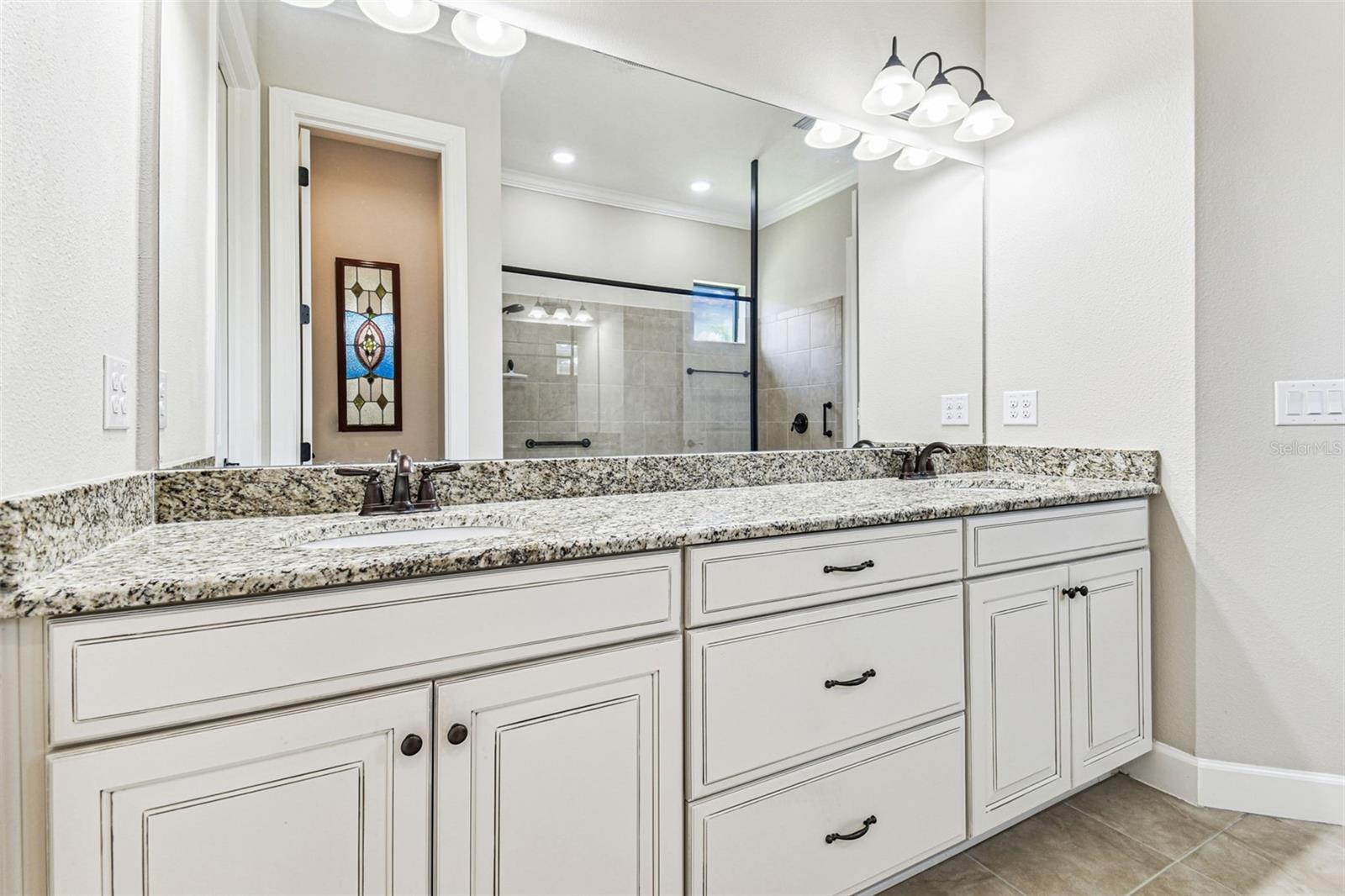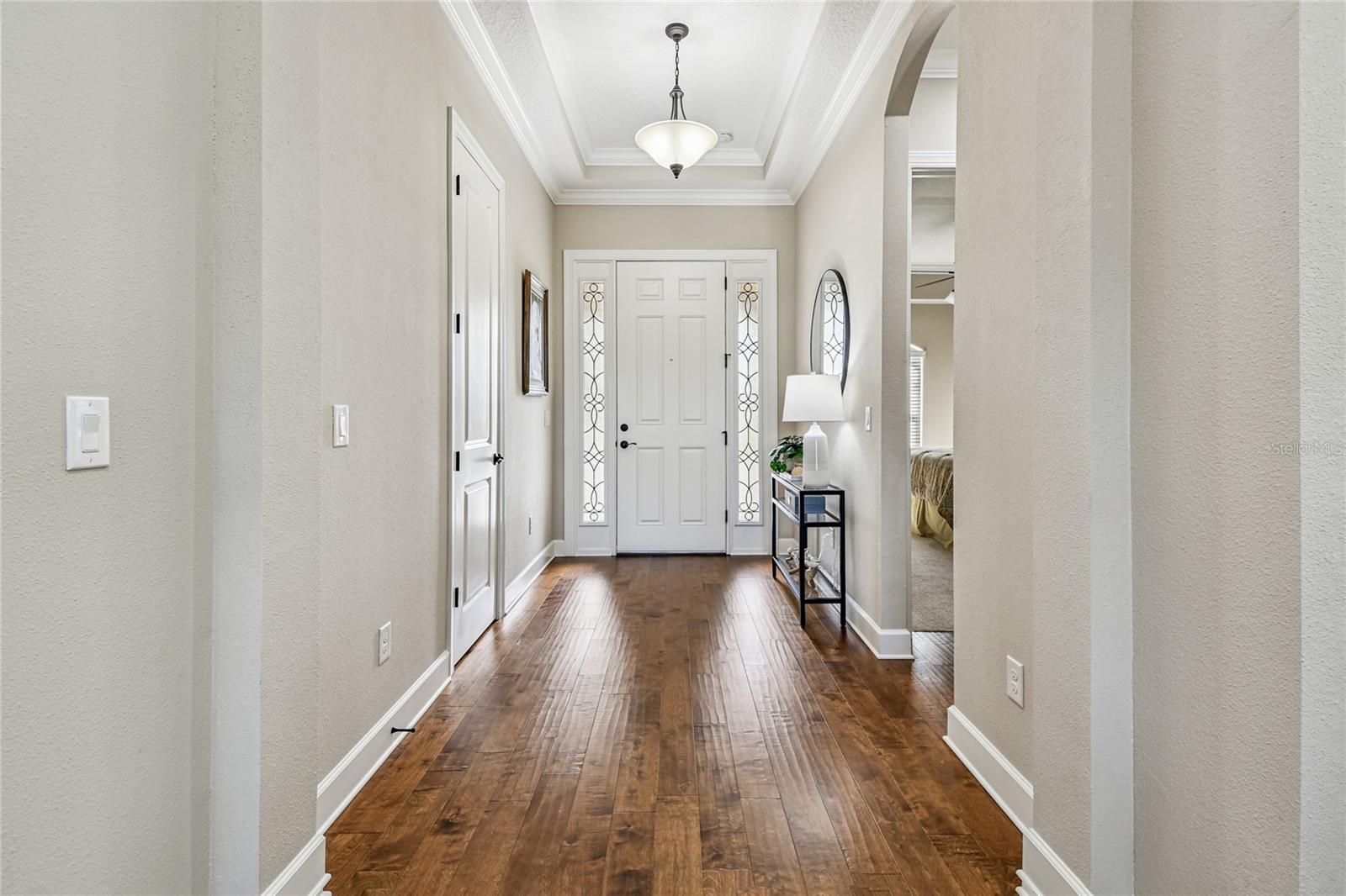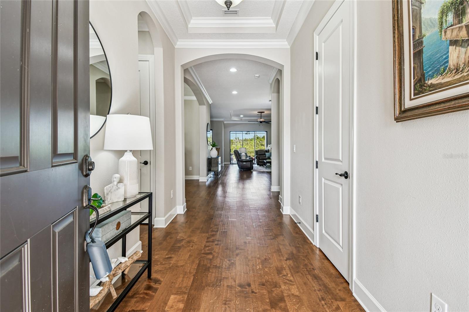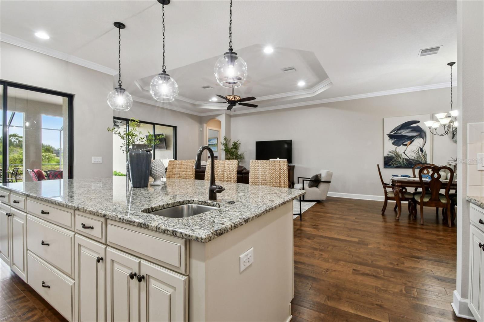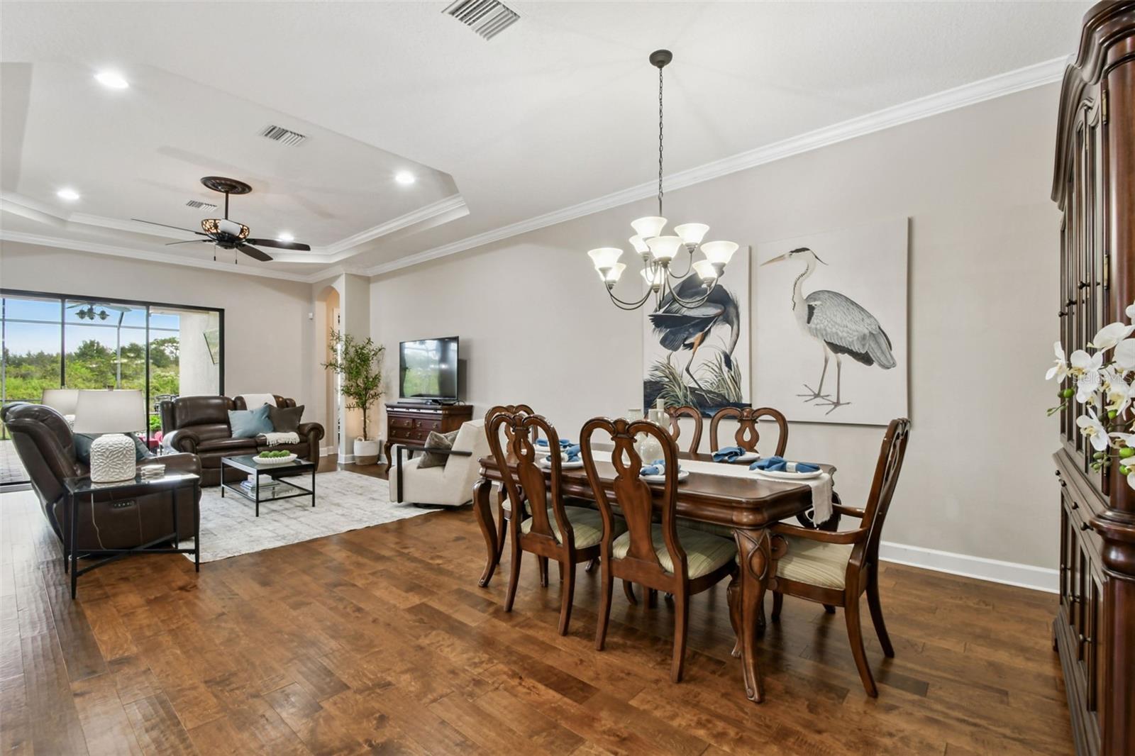 Exquisite home now available in the exclusive GATED resort-style community of Esplanade of Tampa! Built by Taylor Morrison with the finest craftsmanship, this home offers an elegant yet functional layout with countless high-end upgrades! From the moment of arrival, the meticulously maintained landscaping and brick paver driveway welcome you to this immaculately maintained home. Enjoy the ease of INCLUDED LAWN MAINTENANCE in this highly desired community with NO CDD fee! Inside, you’ll find stunning real hardwood floors throughout, crown molding, and upgraded cabinetry that elevate every space. The open concept floor plan features 3 spacious bedrooms, an office/den, 3 full bathrooms, and a 2-car garage with a 4 FOOT EXTENSION and ceiling rack shelving. These large garages are hard to come by! The upscale kitchen is a true standout with upgraded cabinetry, thick granite countertops, a natural gas range, stainless steel appliances, and a UNIQUE DOUBLE SINK DESIGN with an additional sink in the center island; perfect for food prep and entertaining. The expansive master suite offers a luxurious retreat with a massive walk-in closet offering CUSTOM BUILT-INS, double sink vanities, and a large walk-in shower. A spacious laundry room with more custom cabinetry and a utility sink adds everyday convenience. It doesn’t end there! Step outside to an EXTENDED COVERED AND SCREENED LANAI featuring a BRAND NEW FULL OUTDOOR KITCHEN with gas grill, refrigerator, and storage drawers. With plenty of space for both lounging and dining, this outdoor oasis is perfect for year-round Florida living. This home was built to the highest standards with a TANKLESS GAS WATER HEATER, HURRICANE SHUTTERS, in-wall pest control, energy efficiency, and a long-lasting TILE ROOF. Living in Esplanade of Tampa means endless amenities including tennis and pickleball courts, two dog parks, a fitness center, fire pit, pool with cabanas, clubhouse, social events, and more. Conveniently located near I-75, I-275, best hospitals, Wiregrass Mall, Tampa Premium Outlets, and more! And unlike most Esplanade communities, this one is NOT age-restricted and has NO CDD! This immaculate home is truly move-in ready and waiting for you to call it your own.