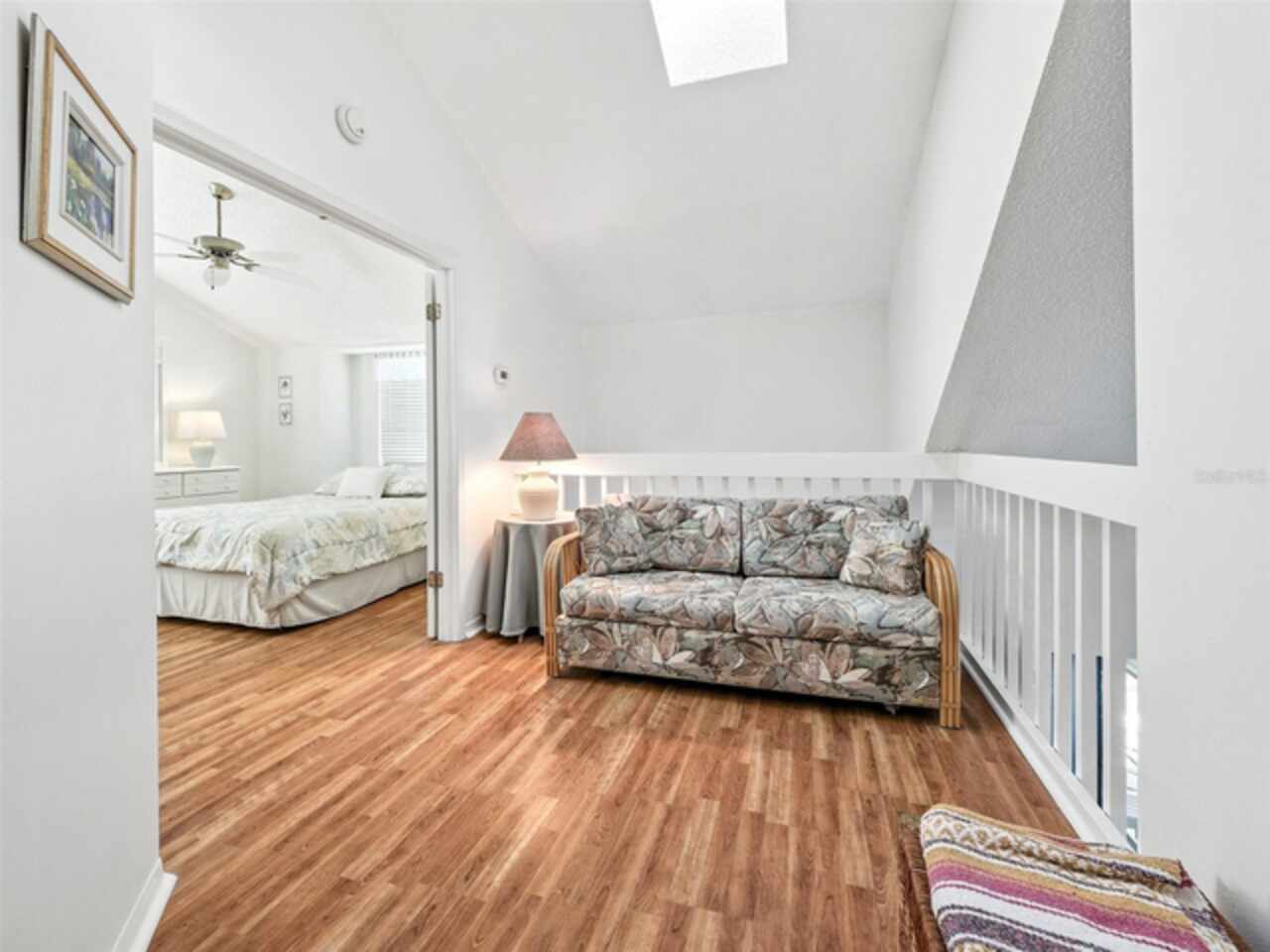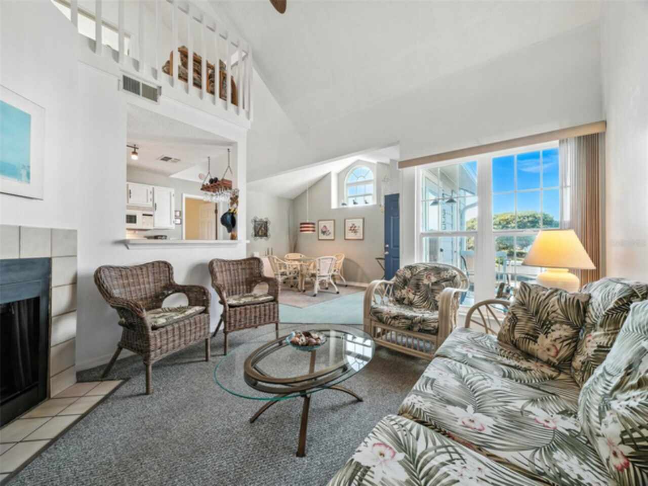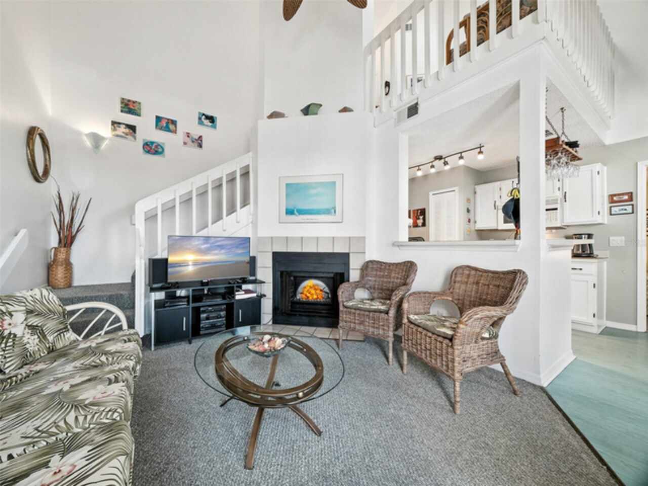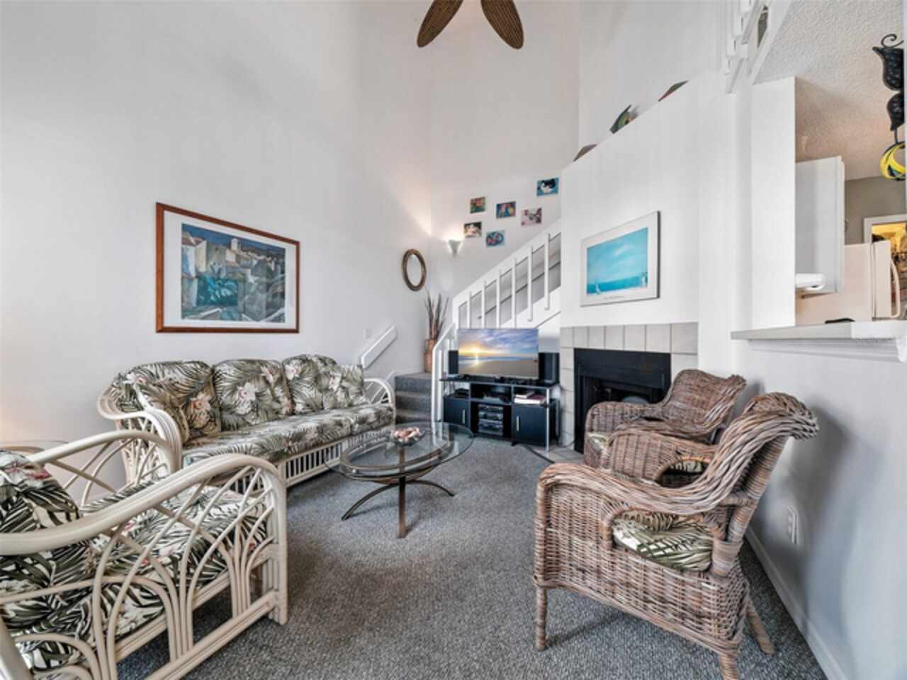 Just steps to the no-drive beach, this spacious 2 bedroom, 2 bath condominium includes a den that could double as extra sleeping or play space. There are newer double pane impact windows throughout. The vaulted ceilings add to the spacious feel. Primary suites on both levels offer privacy. In unit washer/dryer and walk-in closets. Electric fireplace adds ambience. HVAC installed Sept 2023. The complex completed major renovations and updates in 2024. Private storage closet for your beach chairs and umbrellas. One assigned parking spot (#68) plus plenty of guest parking. There’s a sparkling pool and peaceful tree-shaded paths throughout the grounds and an on-site manager, too.