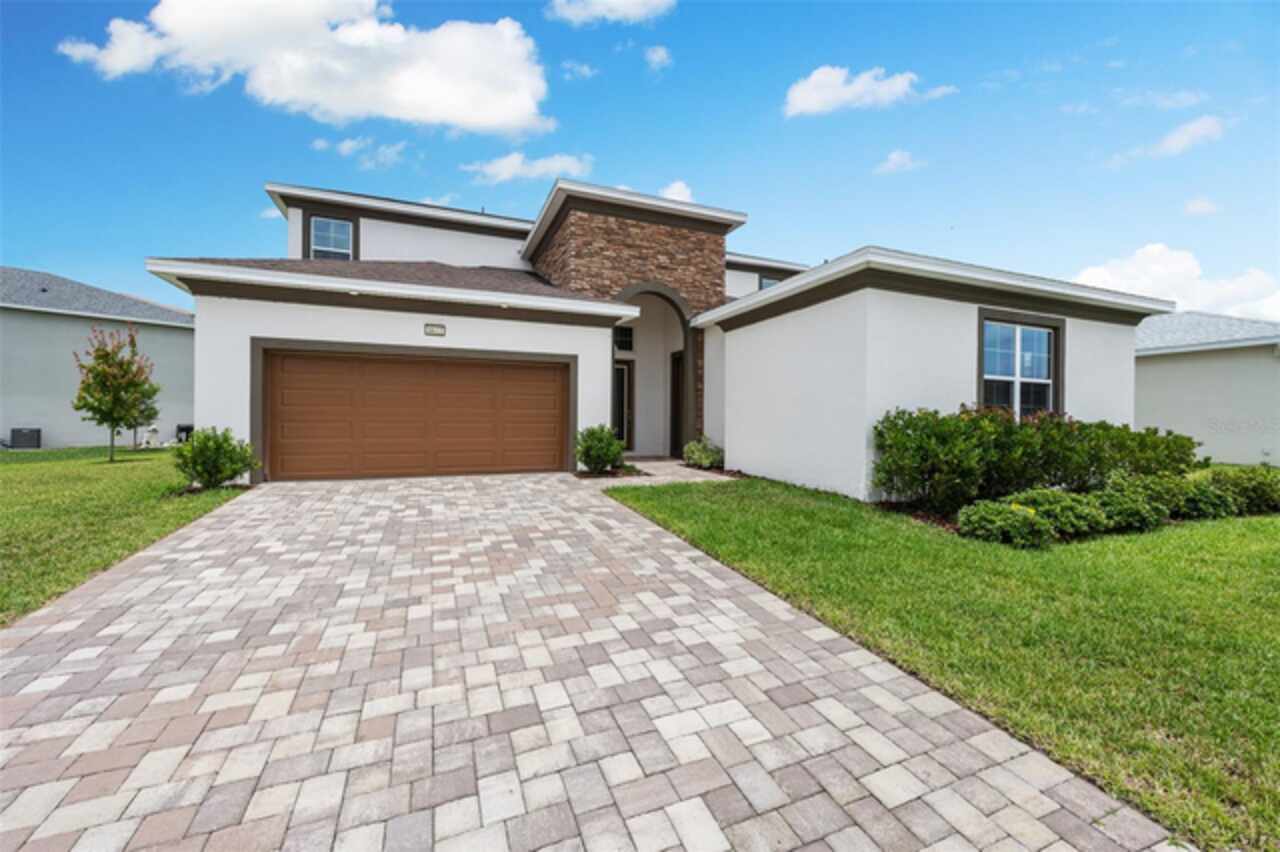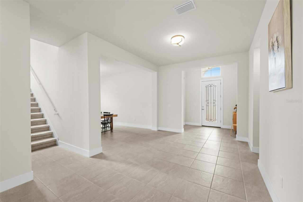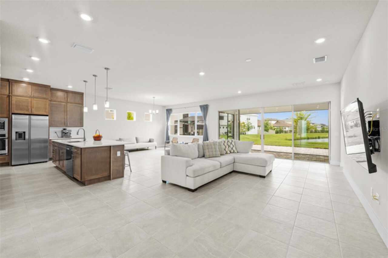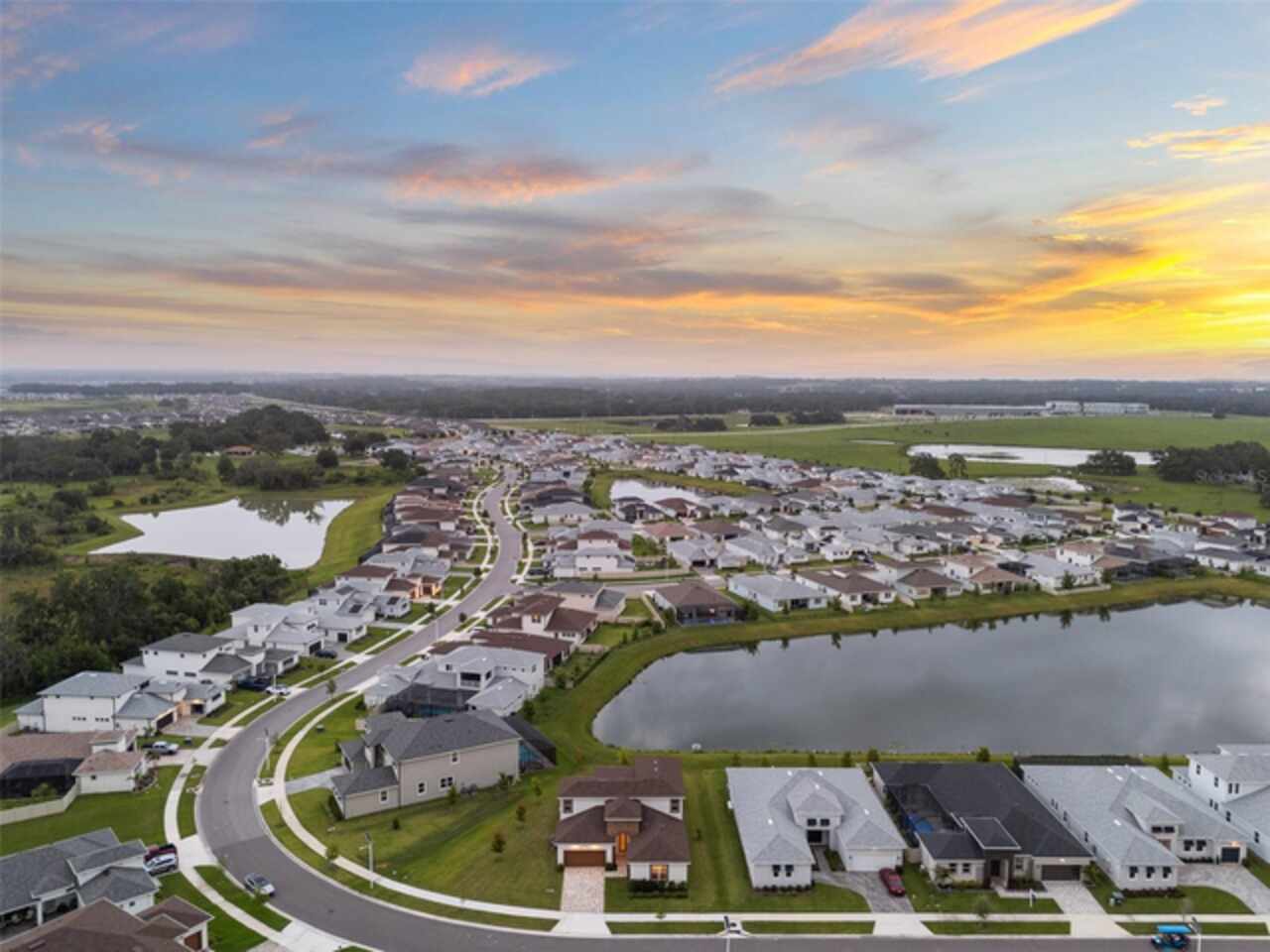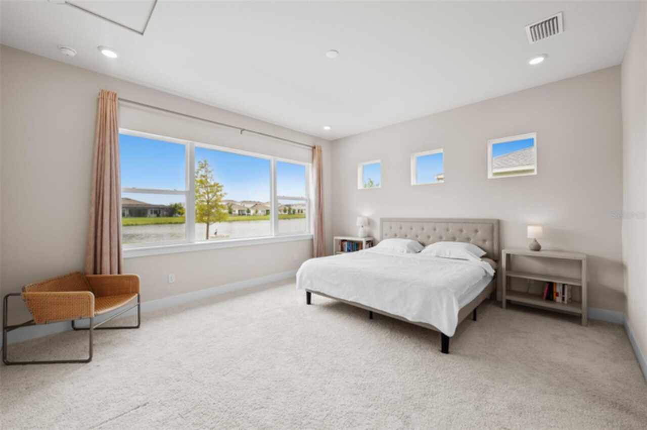 Experience exceptional waterfront living in this stunning four-bedroom, three-and-a-half-bath residence with a dedicated in-law suite with private entrance, all in the amenity-rich community of Epperson Ranch. A stylish frosted glass and wrought iron front door welcomes you into a home defined by sophisticated finishes and a thoughtful layout. The expansive living space is adorned with durable ceramic tile floors, creating a seamless flow from room to room. The heart of the home is the gourmet kitchen, which boasts attractive quartz countertops, a classic white subway tile backsplash, and sleek stainless steel Samsung appliances including oven, microwave, refrigerator freezer combo and a ceramic cooktop with modern range hood. Ample dining options are provided with a large, sunny breakfast nook for casual meals and a separate formal dining room ideal for entertaining. The luxurious primary suite is a private retreat, featuring an upgraded oversized window package that fills the room with natural light and pond views. The en-suite bath is appointed with quartz counters, dual vanity, a separate water closet and a large, frameless glass walk-in shower. A unique and desirable feature of this home is the private in-law suite, complete with its separate entrance, a bedroom, an en-suite bath, living room and plumbing ready for a kitchenette. Upstairs, a spacious loft area offers flexible living space, ideal for a media room, home office or play area. The well-equipped laundry room includes built-in cabinetry and a utility sink for added convenience. Go outside to the screened and covered lanai, which features a panoramic screen to maximize the tranquil pond views. This outdoor living space is pre-plumbed and wired for an outdoor kitchen, making it an entertainer's dream. An additional paver lanai extends the outdoor space, offering even more room for relaxation and enjoyment. This home provides an unparalleled lifestyle in a premier location, and a prime oversized lot. Epperson’s famous crystal lagoon comprises 7.5 acres of clear blue water including sandy beaches, a swim-up bar, food trucks and various water activities. Epperson also showcases UltraFi, a community-wide internet and cable experience, Streetleaf solar streetlights, golf cart paths and miles of trails. In the Robin's Cove neighborhood is Eagle Park, which includes a community clubhouse, recreational trails, exercise stations, dog parks, playground and a dock for King Lake. This growing area is across the street from The Kirkland Ranch Academy of Innovation and new Kirkland Ranch K-8 School. Enjoy golf cart access to Publix and Starbucks while also conveniently less than five minutes from Interstate 75, providing ample shopping and dining options at the Tampa Premium Outlets, Shops at Wiregrass and Krate at the Grove.