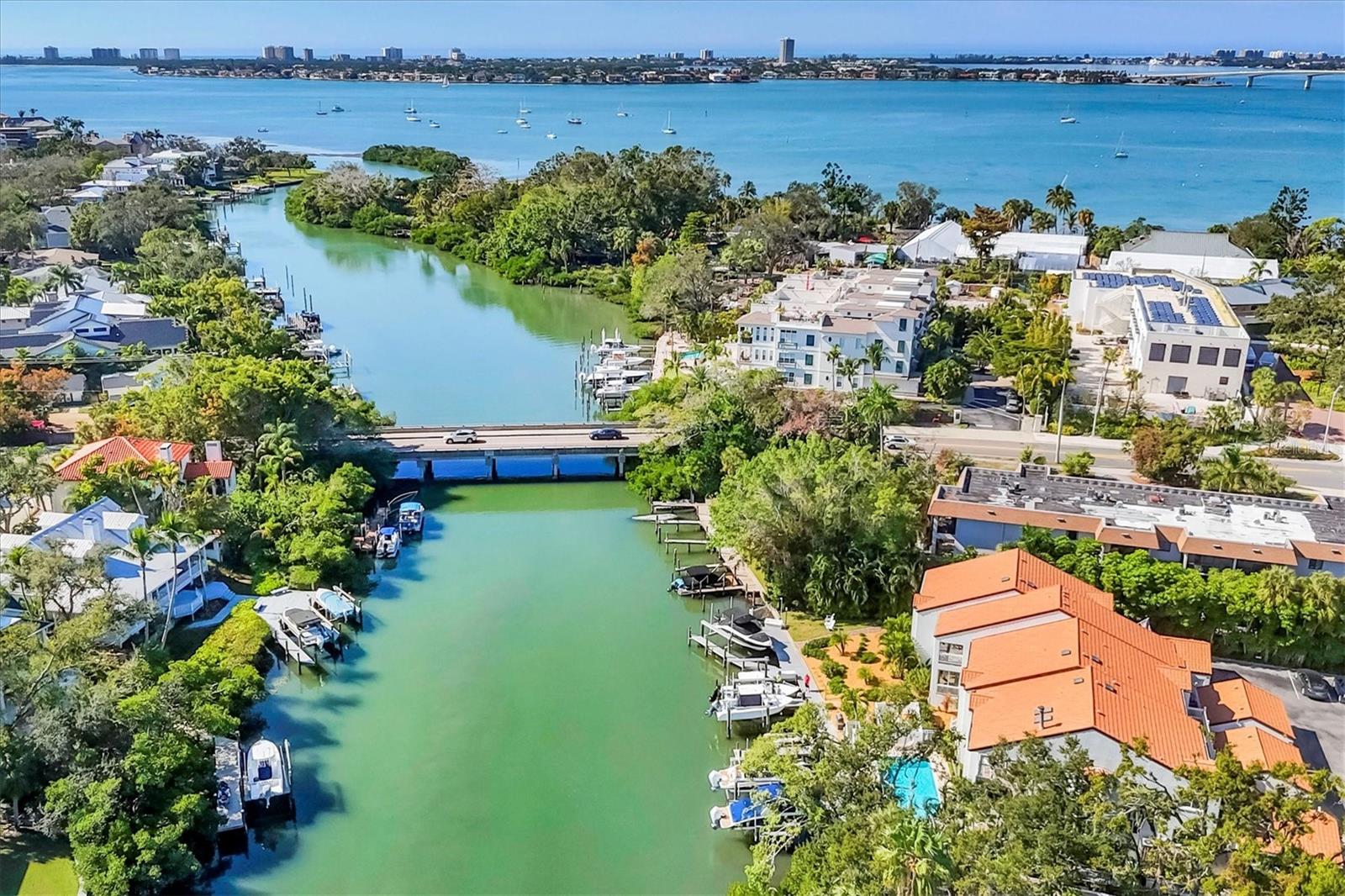 Located in Sarasota's coveted west-of-the-trail, canal-front enclave of Hudson Landings, this property offers a rare ground-floor residence with a deeded dock and direct bay access. Built in 1989 and spanning 1, 362 square feet, this thoughtfully updated home features three bedrooms and two full baths, ideal for year-round living or a seasonal coastal retreat. An open layout connects the kitchen; featuring stainless steel appliances, granite countertops with seating opening to a spacious living and dining area highlighted by high ceilings and abundant natural light. The primary suite overlooks the bayou and pool area, creating a peaceful waterfront backdrop. Two additional bedrooms provide flexibility for guests, a home office, or a den. A screened patio captures soft southern light and frames a direct view of the water perfect for morning coffee or winding down in the evenings. Hudson Landings, an intimate community of just 12 residences, offers a heated pool, lush landscaping, and unbeatable proximity to downtown Sarasota, the marina, Marie Selby Botanical Gardens, and Southside Village. Notable upgrades include hurricane-rated windows and sliders, updated kitchen and bathrooms, a detached garage and boat-friendly amenities. This residence delivers the best of Sarasota living: downtown convenience in a quiet residential neighborhood paired with effortless waterfront access. Book your showing today.