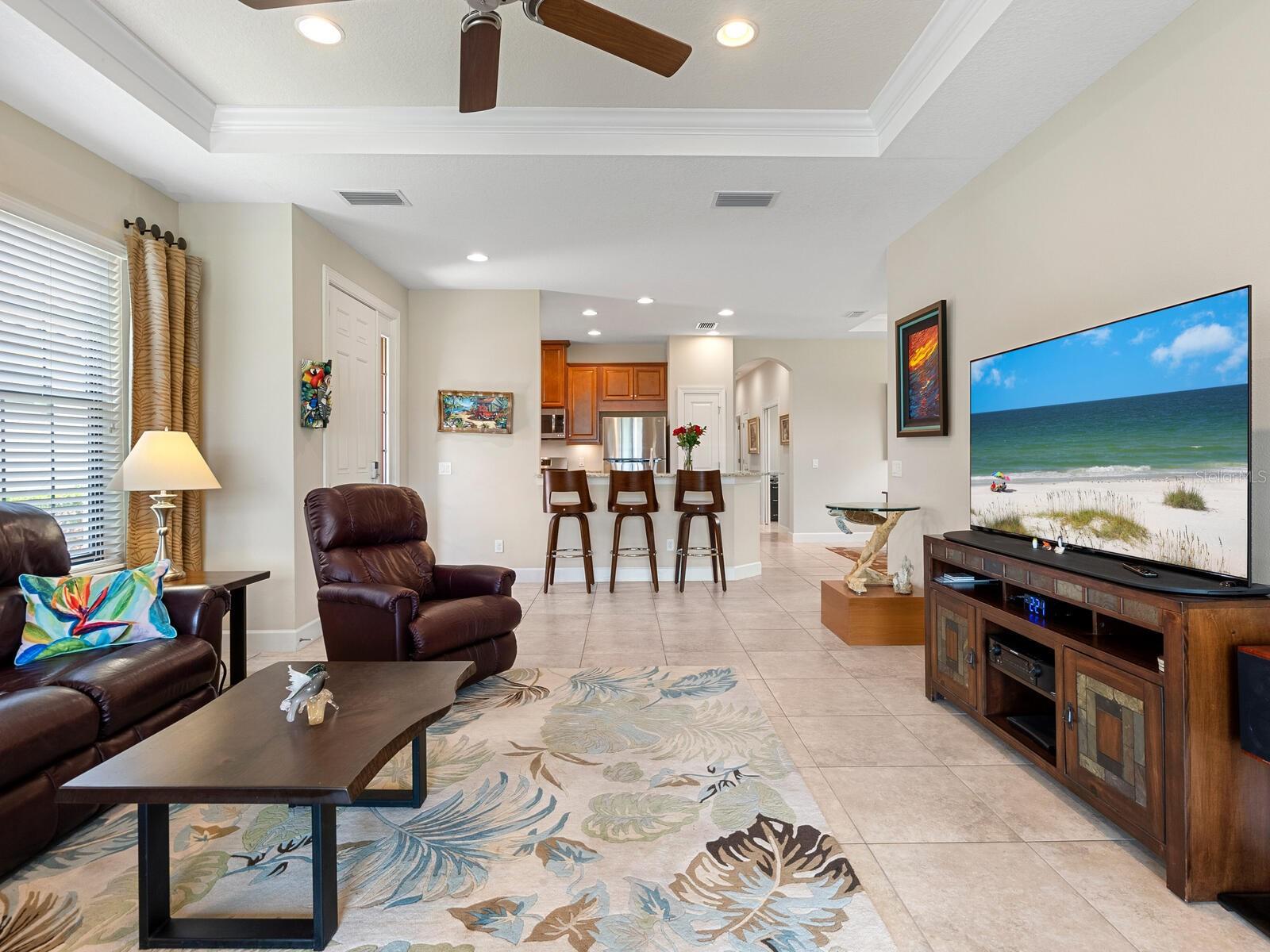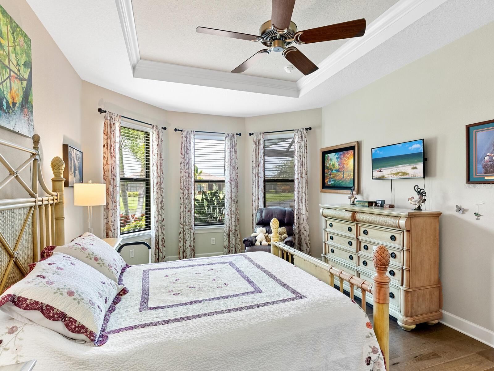Accessibility Features, Ceiling Fans(s), High Ceilings, Kitchen/Family Room Combo, Open Floorplan, Pest Guard System, Solid Wood Cabinets, Split Bedroom, Stone Counters, Tray Ceiling(s), Walk-In Closet(s), Window Treatments