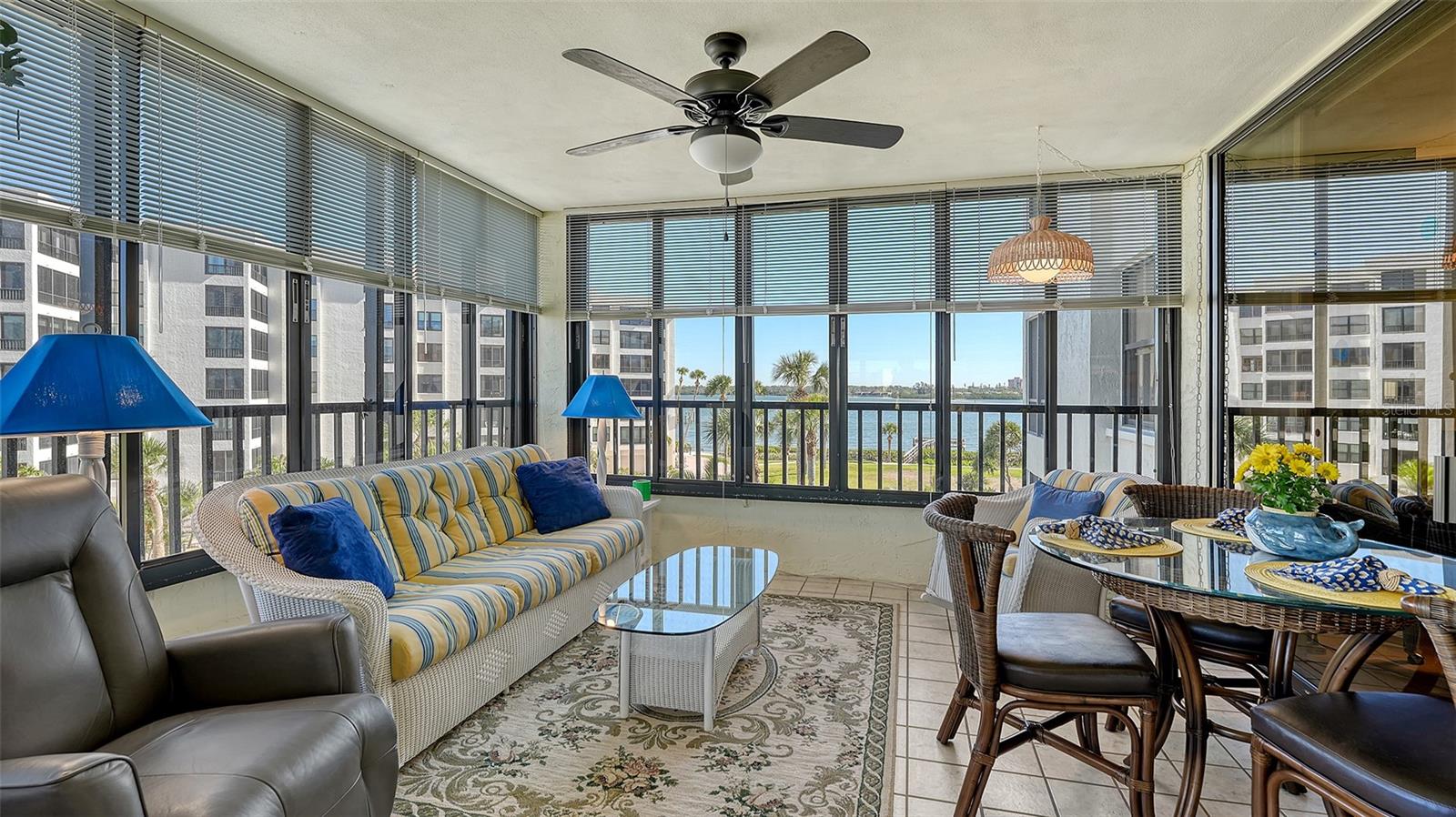 Natural light and full water views are captured from this spacious three-bedroom and three-bath end-unit condominium in the Bayside community of Turtle Bay on Siesta Key. Watch the sunrise from the glassed-in lanai as the boats are passing by along the Intracoastal Waterway or catch the sun going down from the front lanai in the evening. The kitchen and all three baths have been remodeled. The kitchen was enhanced by a raised ceiling and recessed lighting, updated cabinets, granite countertops and Samsung appliances, while the baths were stylishly renovated with beautiful glass showers/tubs, wood cabinets and nice flooring. The comfortably large primary bedroom enjoys its ensuite bath and one of the oversized guest rooms is also en-suite, too, and has a lovely view of the grounds to the west. Other condominium features include a new AC in 2023 and 40-gallon Rheem hot water heater in 2020, and as a convenient bonus, its indoor laundry room and under-building parking. On south Siesta, Turtle Bay offers lush landscaping, an updated fishing pier, a boat dock with slips available on a first-come first-served basis, kayak launch, clubhouse, heated pool and spa, grill area, lighted tennis courts and pickleball courts. And for residents, just across the street, is deeded beach access to the sparkling Gulf and its gorgeous sunsets.