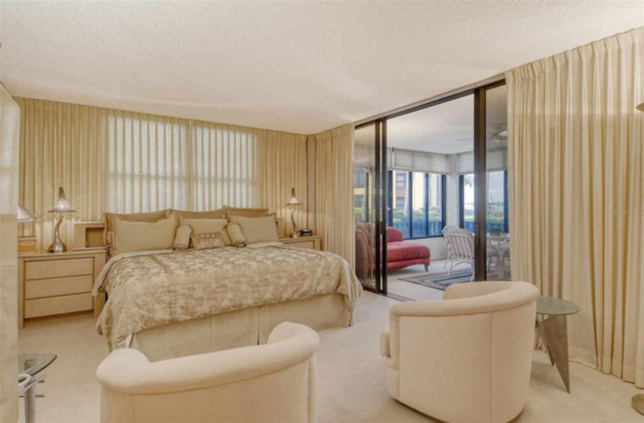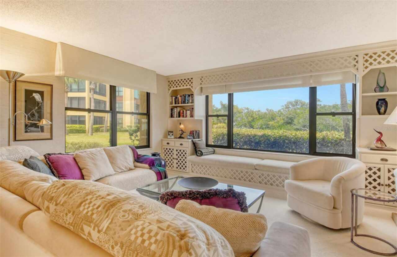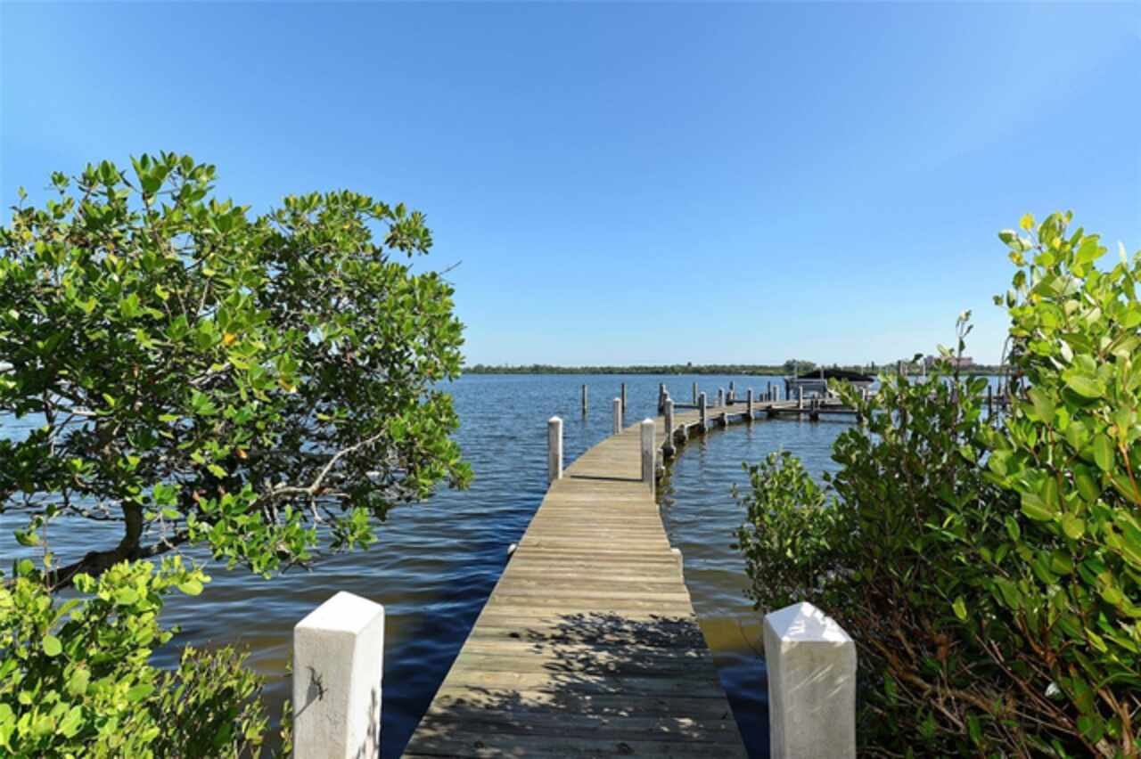 This residence is being sold furnished (some items excluded). Open floor plan. (2070 Sq feet; builders floor plan), two spacious bedrooms, 2 ½ baths, office area, laundry, large enclosed Lanai. Upgrades include new flooring and newer air conditioner. Enjoy picturesque Bay views to watch the sunrise and across the street you can watch sunsets on the Gulf of Mexico. This larger floor plan has full Bay views. Residents of Island Reef enjoy boat docks (lifts allowed), beach, two heated pools, tennis, pickleball, two fitness rooms, saunas, shuffleboard courts, billiards, library, clubhouse, social room, gas grills, bicycle and kayak storage. The carport is just a few steps from the front door. Guest Parking. Close to two of Siesta Key’s popular restaurants. Free trolley to Siesta Village. Monthly Rentals (8 leases a year), pet friendly (30 lbs.), on-site management and rental program.