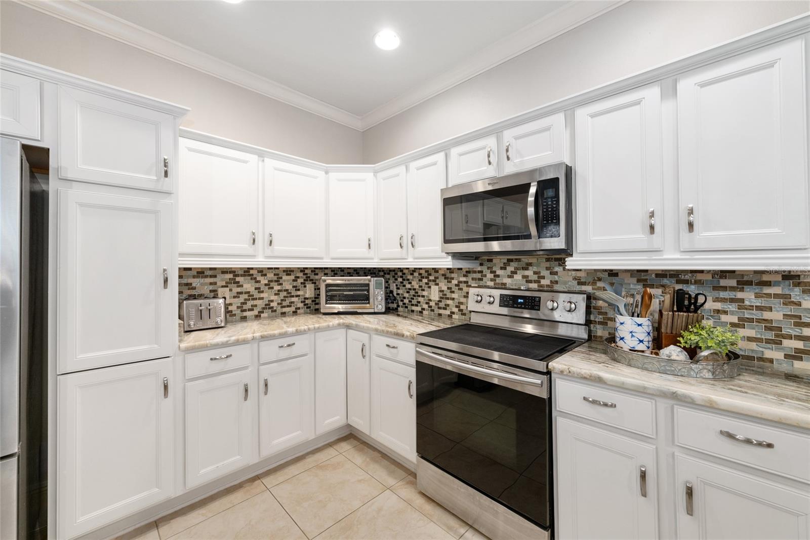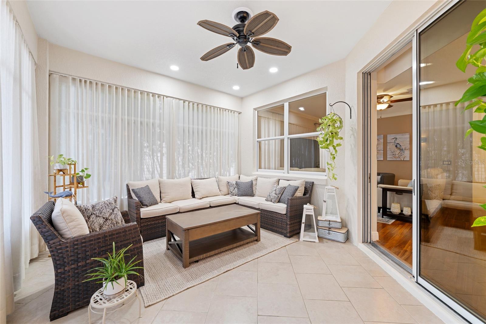 Beautifully maintained 3/2 Camden in the Village of Hemingway, ideally located between LAKE SUMTER LANDING and BROWNWOOD PADDOCK. This home features an OPEN FLOOR PLAN with HIGH CEILINGS, CUSTOME DRAPES, and abundant NATURAL LIGHT throughout. The kitchen offers WHITE CABINETRY with PULL-OUTS, GRANITE COUNTERS, STAINLESS STEEL APPLIANCES, a GLASS-TILE BACKSPLASH, UNDER-CABINET LIGHTING, and an EAT-IN BREAKFAST BAR. The main living area opens to an ENCLOSED UNDER-AIR LANAI with TILE FLOORING and SLIDING WINDOWS, creating a comfortable year-round gathering space. Step outside to the EXTENDED REAR DECK surrounded by TROPICAL LANDSCAPING and PRIVACY FENCING, perfect for relaxing or entertaining. The PRIMARY SUITE includes a LARGE WALK-IN CLOSET and an EN-SUITE BATH with DOUBLE VANITIES, GRANITE COUNTERS, a ROMAN WALK-IN SHOWER, and a PRIVATE WATER CLOSET. Two additional bedrooms near the front of the home provide a PRIVATE GUEST WING or ideal HOME OFFICE setup. Additional highlights include LAMINATE FLOORING in main living areas, BRAND-NEW CARPET in all bedrooms, a 2022 HVAC, INTERIOR LAUNDRY ROOM, and a TWO-CAR GARAGE with BUILT-IN STORAGE and ATTIC ACCESS. Convenient to GOLF, POOLS, RECREATION CENTERS, SHOPPING, DINING, and all the amenities along 466A.