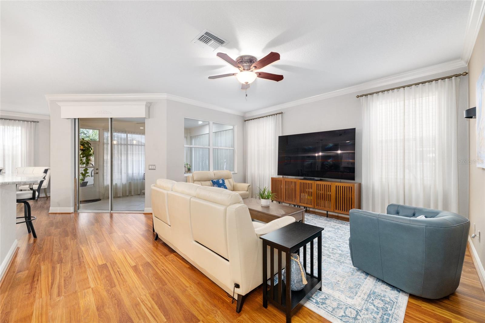 Ceiling Fans(s), Crown Molding, High Ceilings, Kitchen/Family Room Combo, Living Room/Dining Room Combo, Open Floorplan, Primary Bedroom Main Floor, Stone Counters, Walk-In Closet(s), Window Treatments