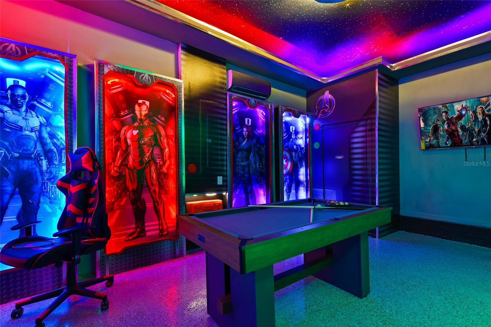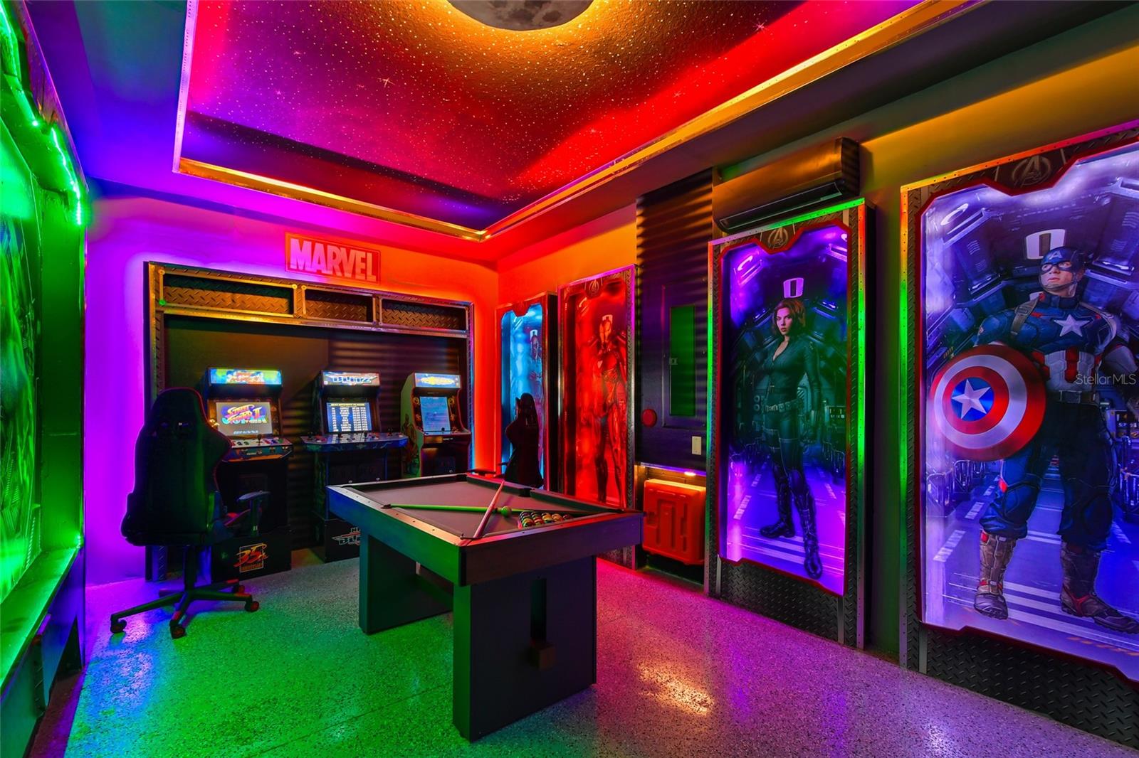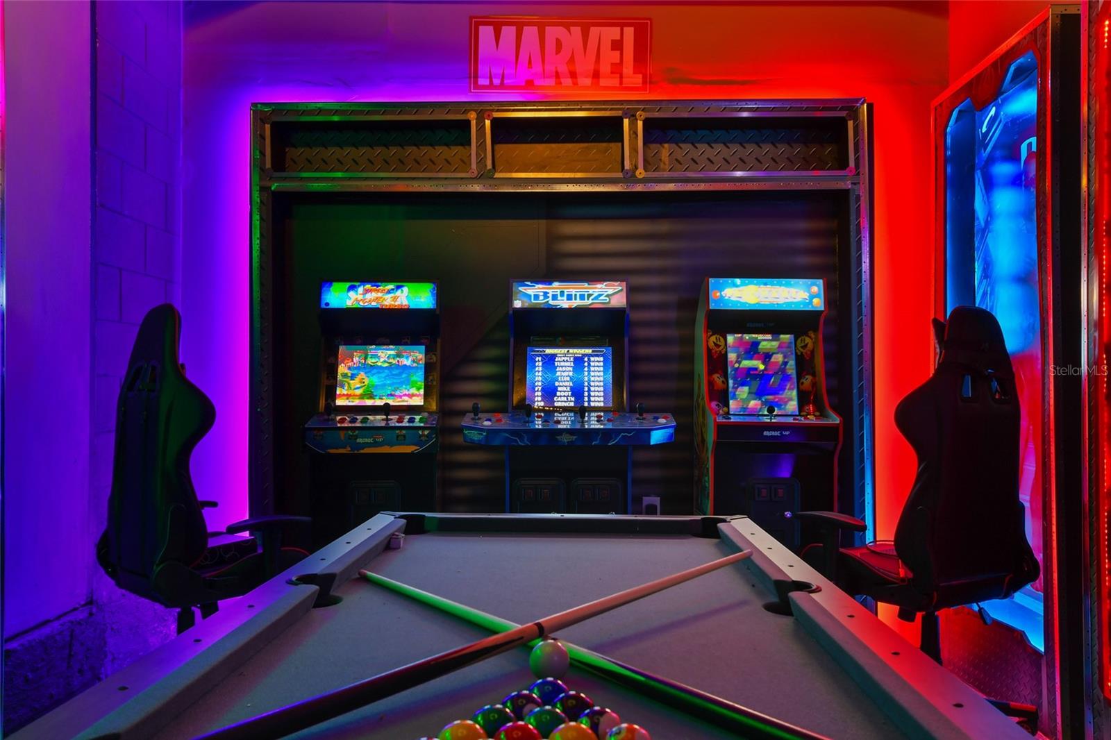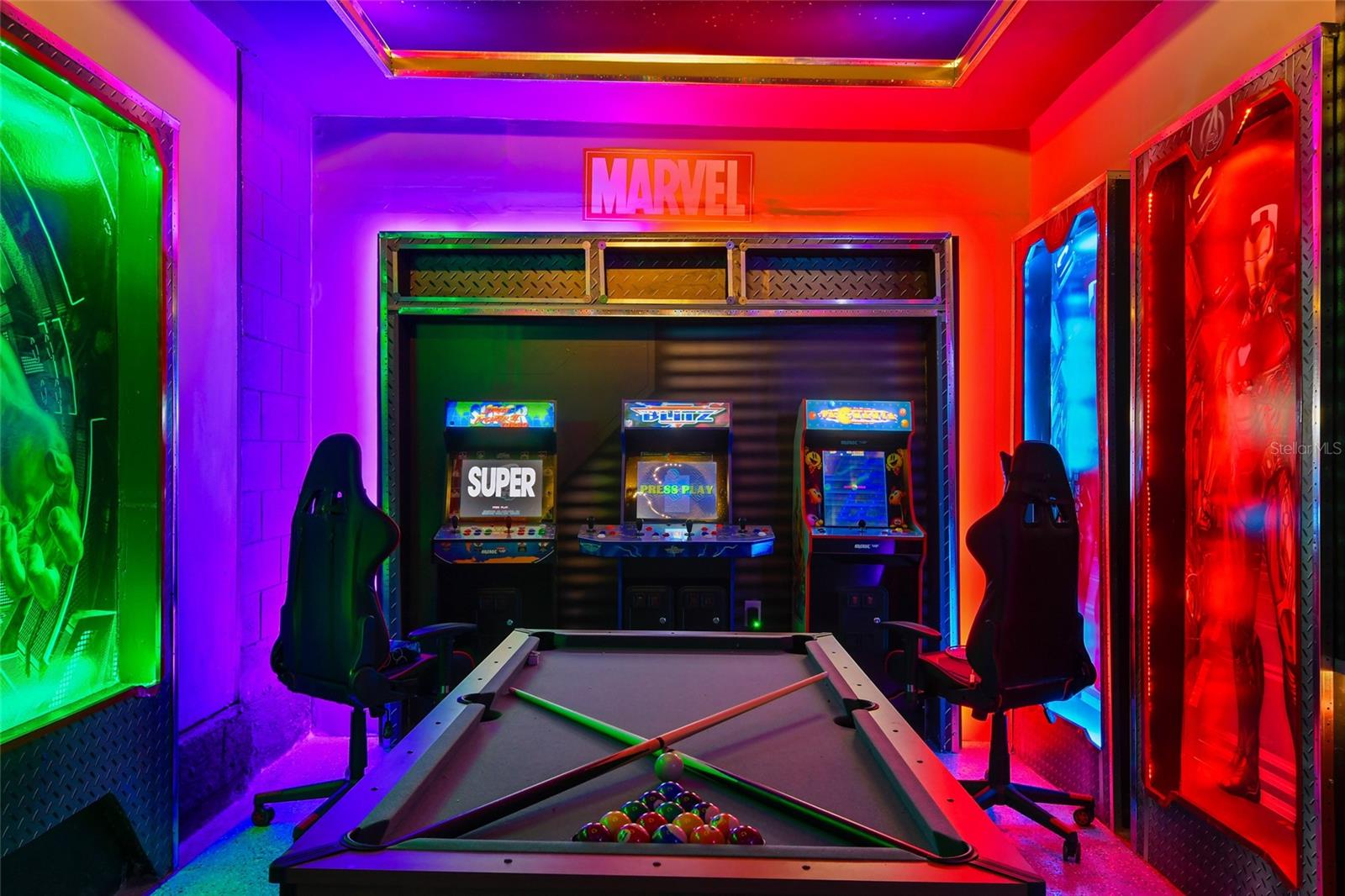Turnkey Short-Term Rental Investment in Solara Resort! Experience the perfect blend of style, comfort, and strong rental potential with this beautifully furnished 7-bedroom vacation home in the sought-after Solara Resort. Built in 2023, this modern property features elegant tile flooring, professionally designed décor, and two primary suites—one upstairs and one downstairs—plus an additional main-floor guest suite ideal for multi-family stays. Three beautifully themed bedrooms add exceptional guest appeal, while the loft has been fully transformed into a spacious game room/movie room with new vinyl flooring. The garage is upgraded into a custom Avengers-themed arcade with split AC, maximizing entertainment value and rental performance. The open-concept kitchen showcases stainless steel appliances, granite countertops, and generous prep space, flowing seamlessly into the dining and living areas for easy entertaining. Outside, enjoy a private screened oasis with a heated pool, spa, and covered lanai—perfect for unwinding after days at the parks. Solara Resort offers world-class amenities, including a full-service restaurant, ice cream shop, coffee bar, fitness center, basketball and soccer courts, beach volleyball, a resort-style pool with cabanas, tiki bar, and splash zone. HOA fees include cable, internet, landscaping, valet trash, and common-area maintenance. Located just 8 miles from Walt Disney World and close to Universal, SeaWorld, and Orlando’s top attractions, this gated resort community delivers both a luxurious personal getaway and a high-performing rental asset. Whether you're seeking a premium investment or your own vacation retreat, this home checks all the boxes.