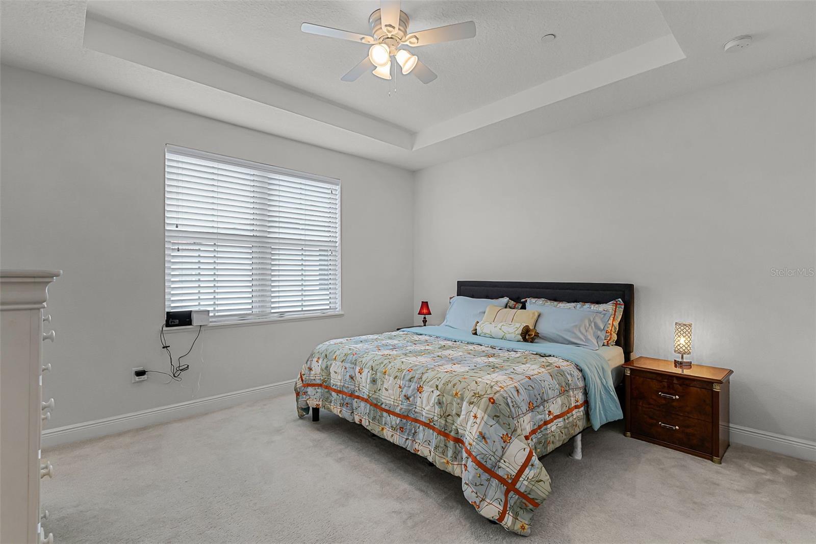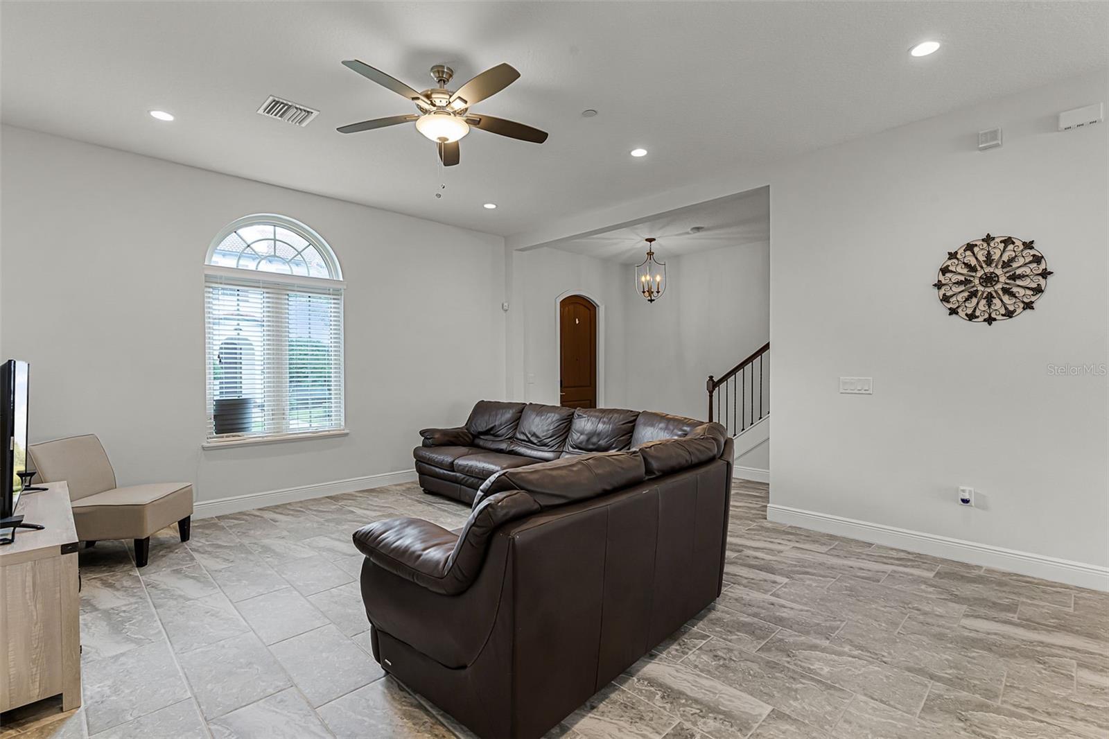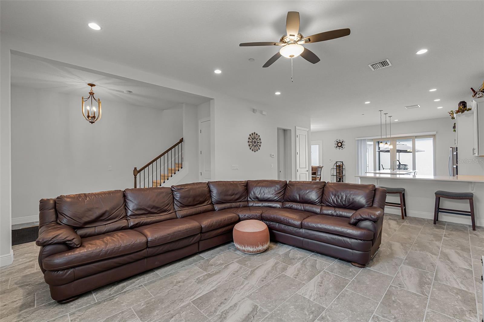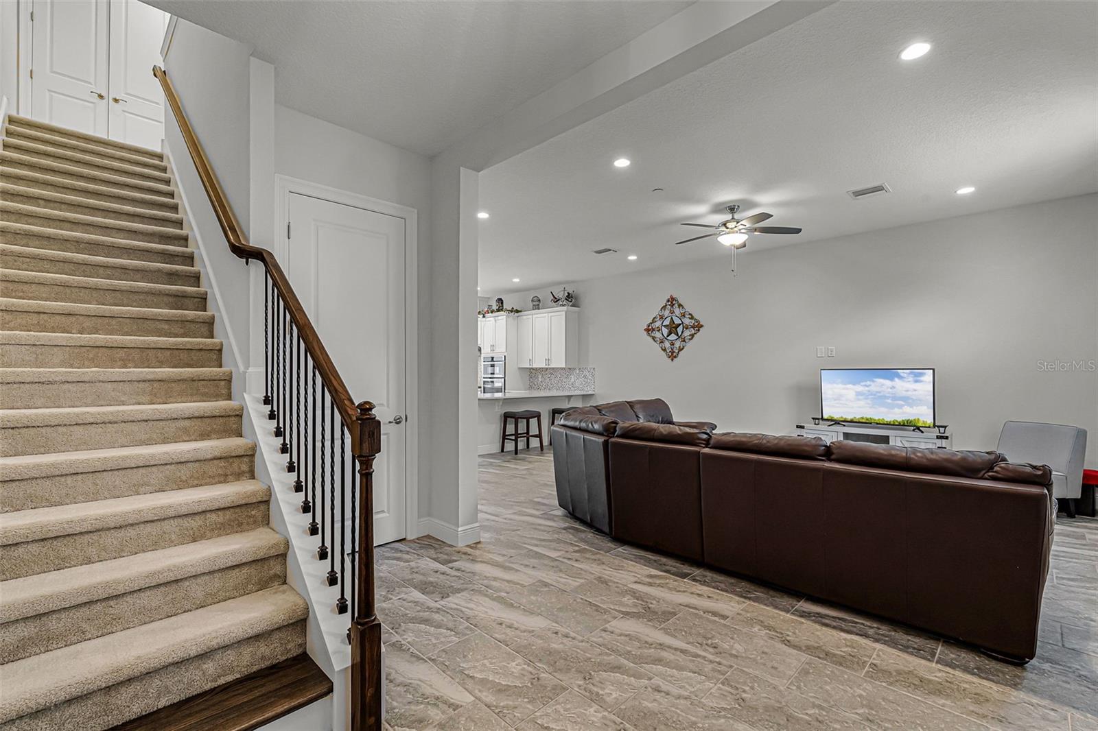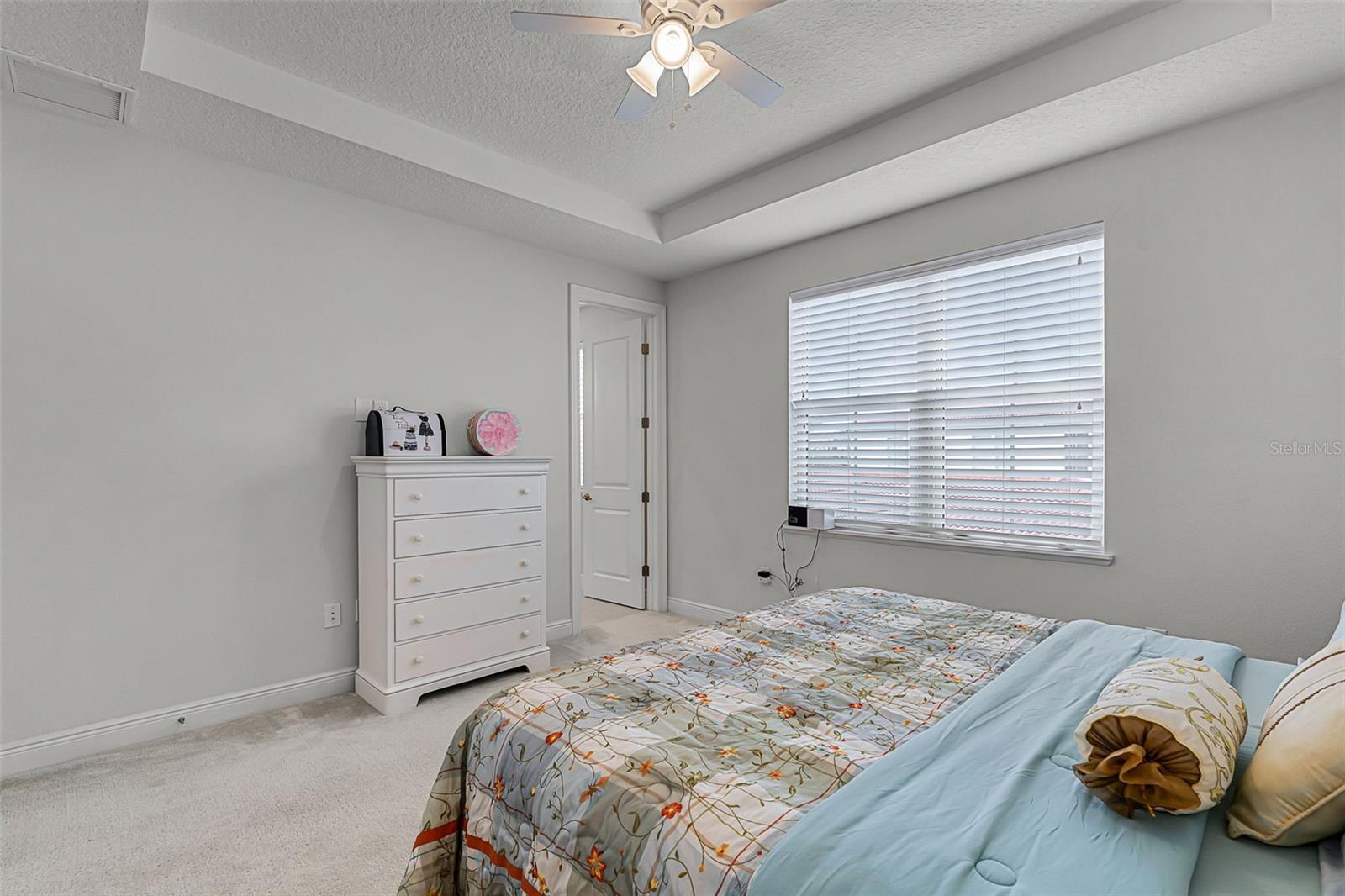 Ceiling Fans(s), Coffered Ceiling(s), Eat-in Kitchen, High Ceilings, Kitchen/Family Room Combo, Open Floorplan, Pest Guard System, PrimaryBedroom Upstairs, Solid Surface Counters, Split Bedroom, Stone Counters, Thermostat, Walk-In Closet(s), Window Treatments
