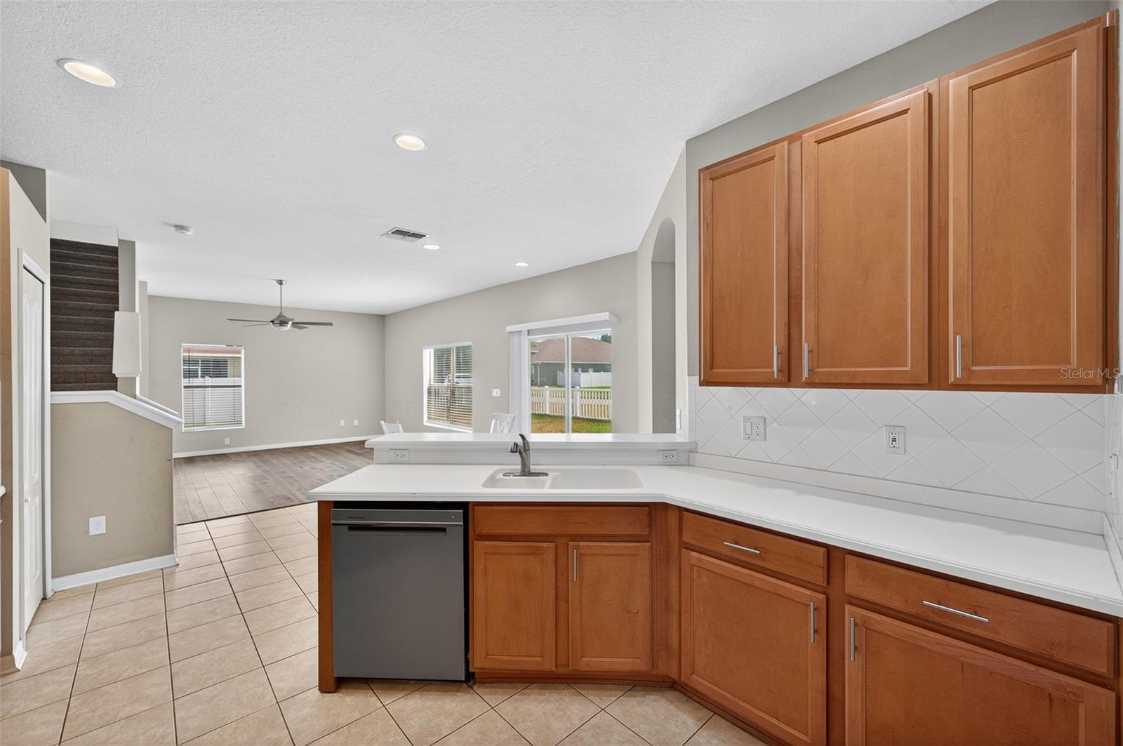 Accessibility Features, Built-in Features, Ceiling Fans(s), High Ceilings, Kitchen/Family Room Combo, Living Room/Dining Room Combo, Open Floorplan, Primary Bedroom Main Floor, Solid Surface Counters, Solid Wood Cabinets, Split Bedroom, Thermostat, Walk-In Closet(s), Window Treatments