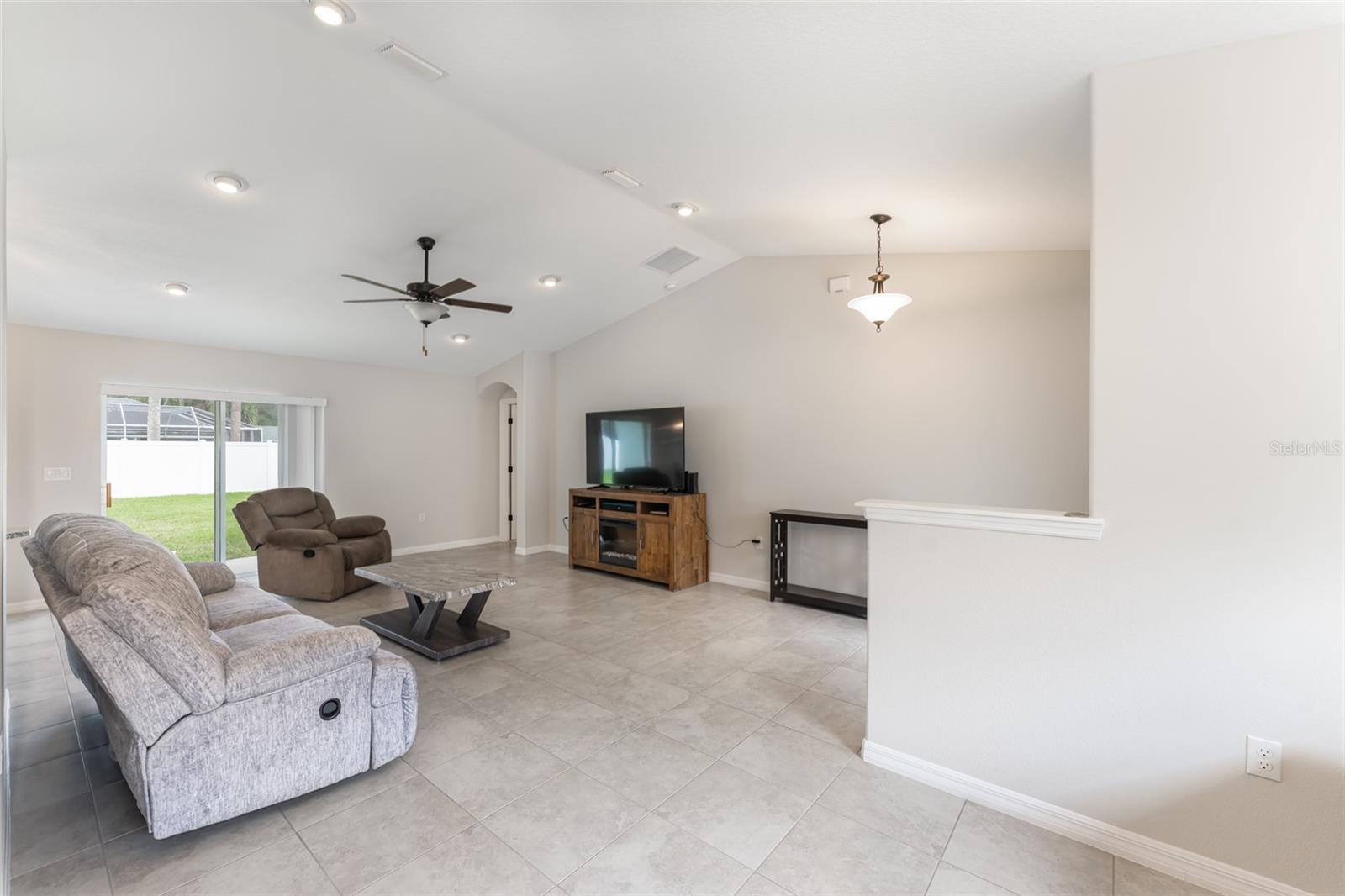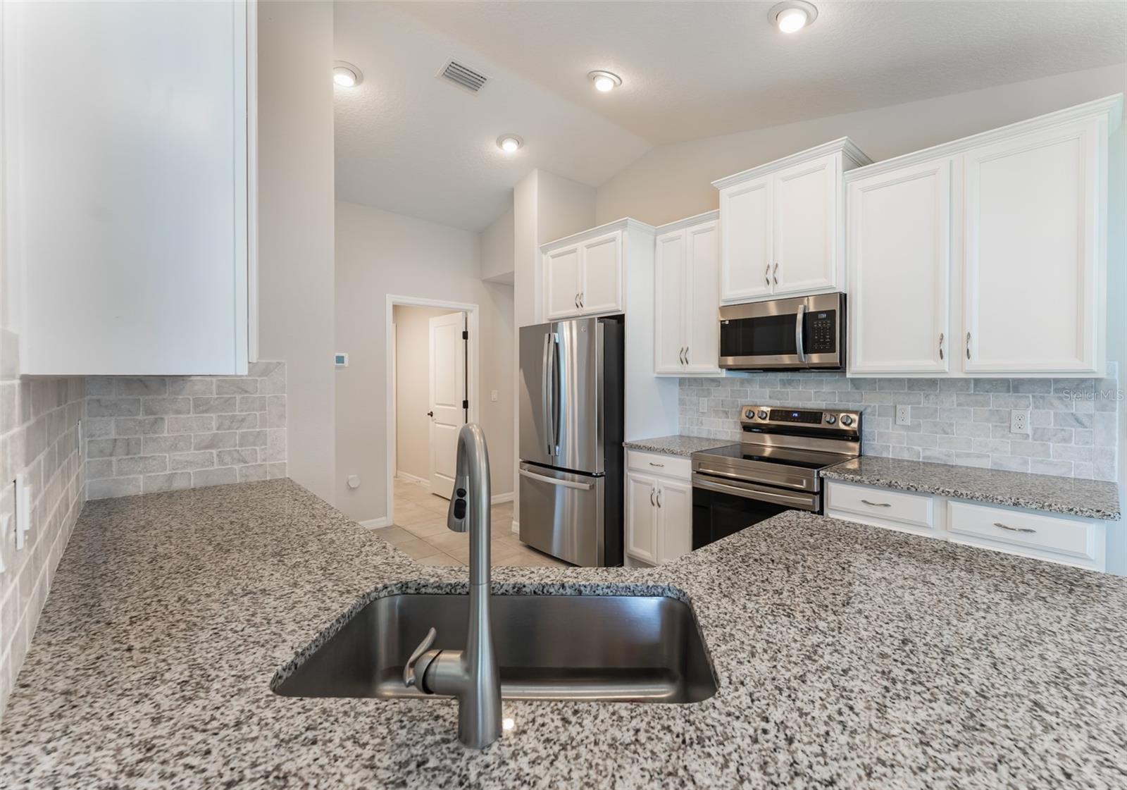 Beautiful Like New, 2024 year built Seagate Bryce floor plan located in the heart of Palm Coast. This nicely appointed concrete block home offers a popular open floor plan with a pleasing color palette, vaulted ceilings and tile in the main areas. The kitchen is nicely appointed with 42 inch cabinets with crown molding, granite countertops, tiled backsplash and stainless steel appliances. Large owners suite with tray ceiling and large bathroom with tiled shower, granite counters and double sinks. Fully fenced yard with irrigation system on a well make this home a must see!