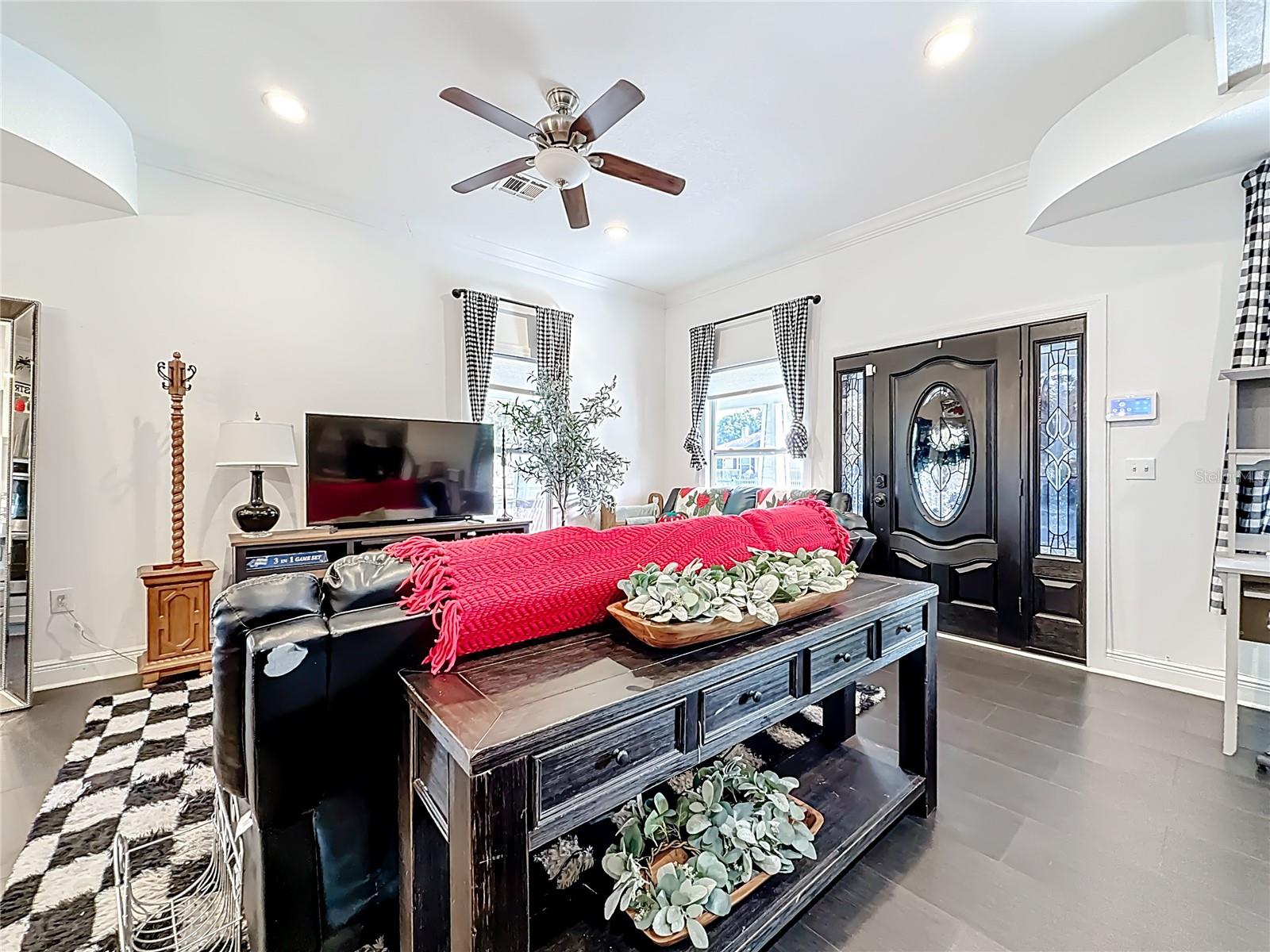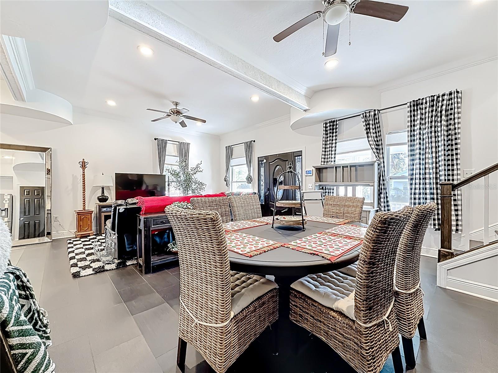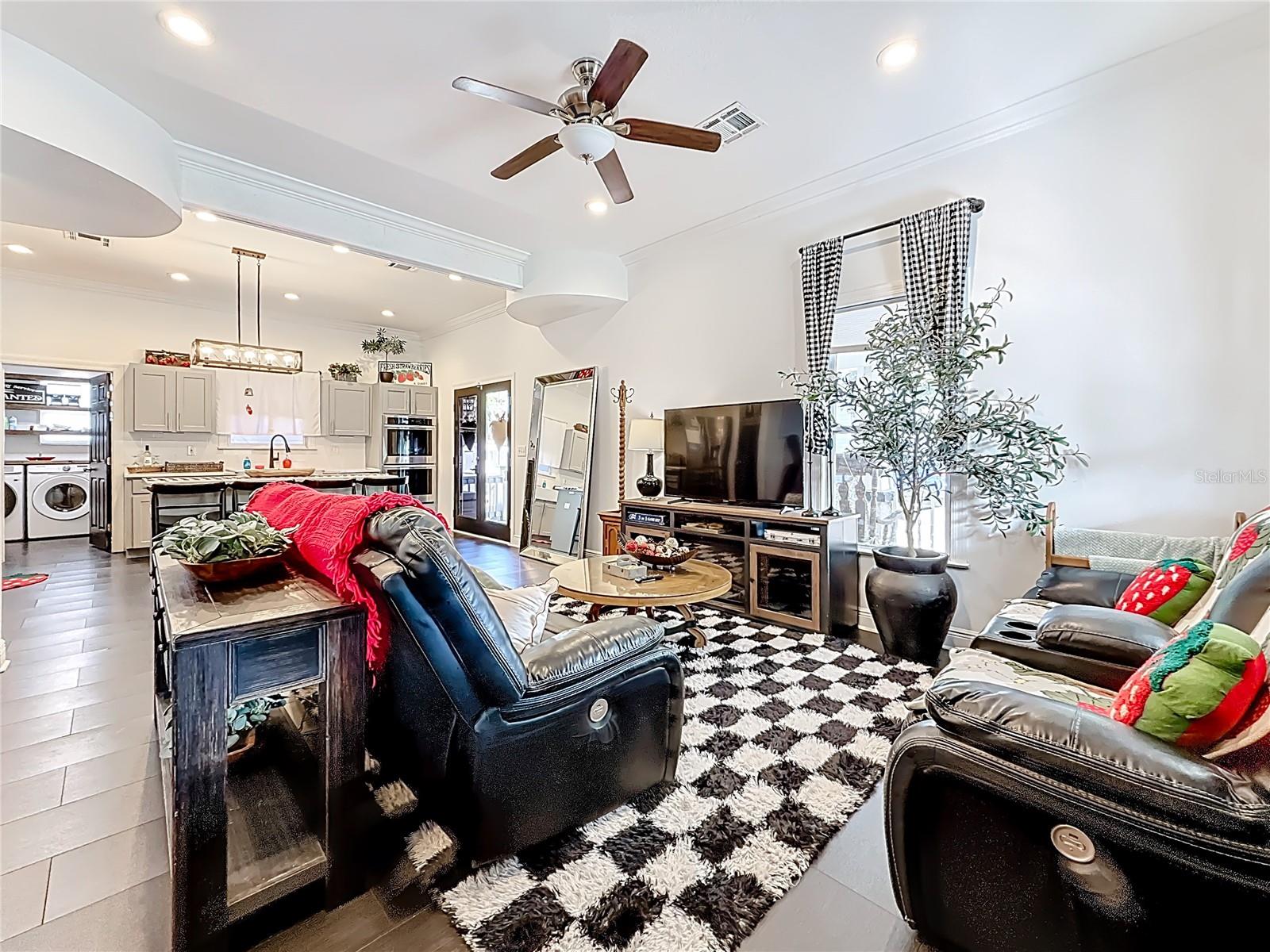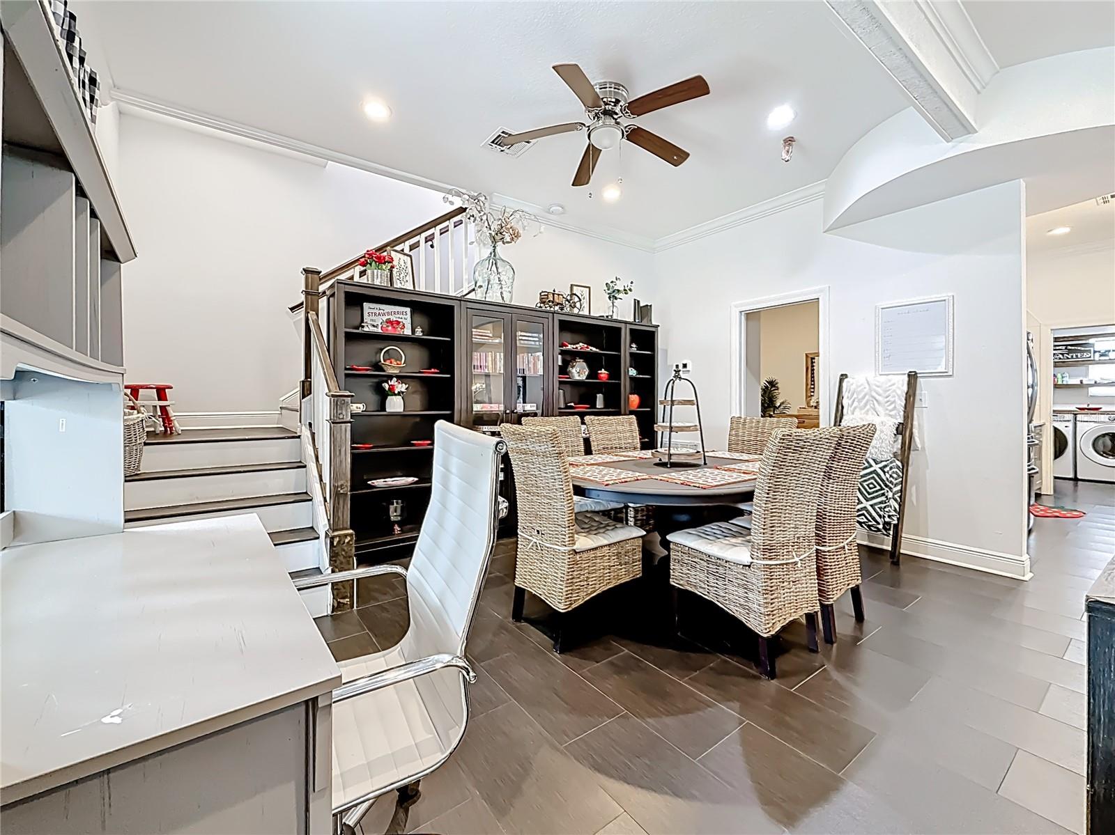 Ceiling Fans(s), Crown Molding, Eat-in Kitchen, High Ceilings, Kitchen/Family Room Combo, PrimaryBedroom Upstairs, Solid Surface Counters, Thermostat, Walk-In Closet(s)