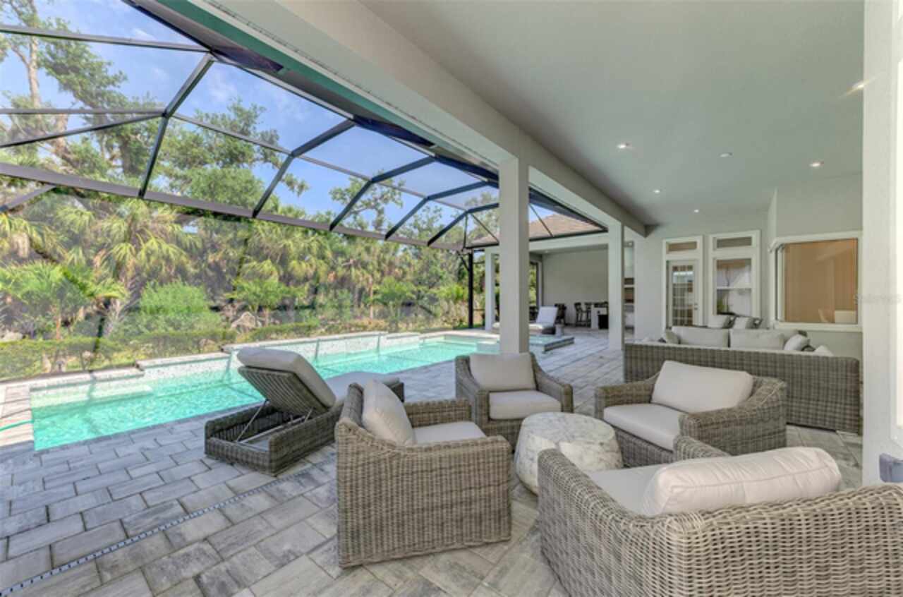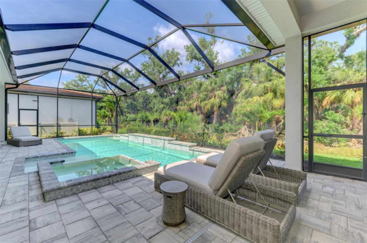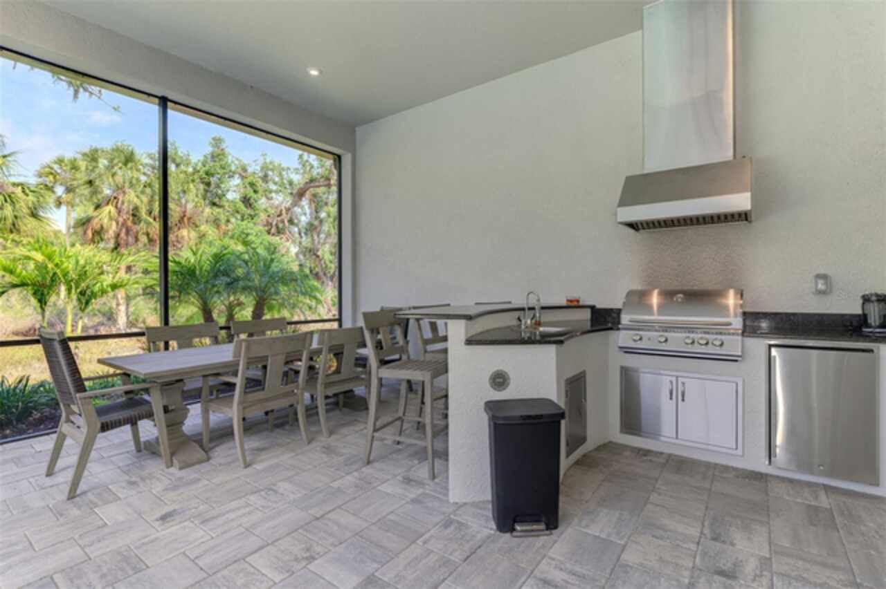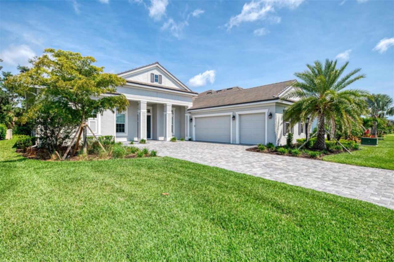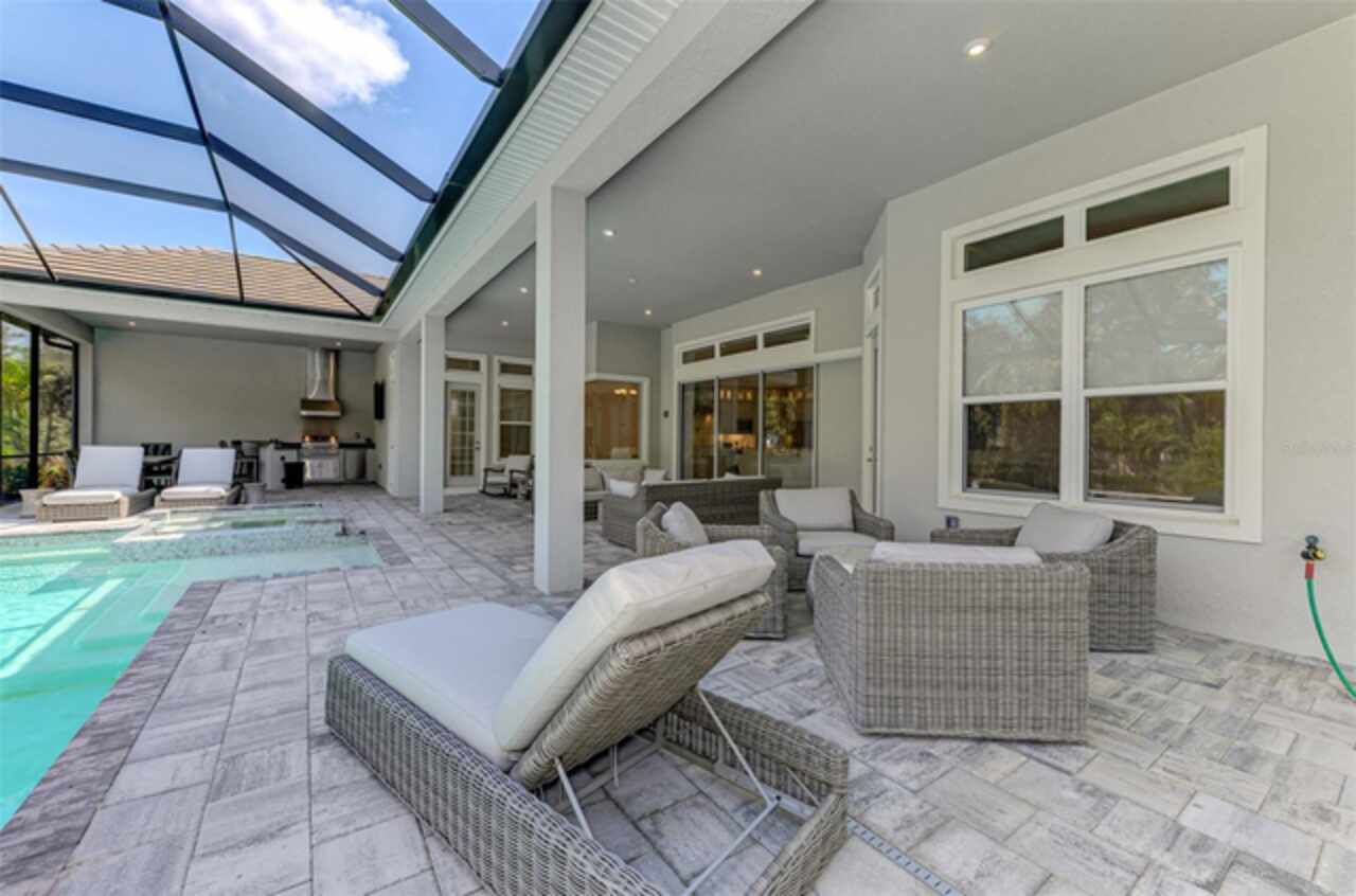 Beacon West Indies meticulously designed luxury home, custom pool & spa with an outdoor kitchen / entertainment area. Located in Sarasota’s exclusive Skye Ranch community. Nestled against serene preserve views, this residence seamlessly blends indoor and outdoor living with triple pocket sliding glass doors in the expansive great room to create a truly seamless connection to the outdoors. The luxurious owner’s suite, situated along the left side of the home, is a private sanctuary with direct access to the pool area, two expansive walk-in closets with custom built-ins, and a spa-like en-suite bathroom boasting dual vanities, an oversized shower with a rain shower heads, and a private water closet. Remote- controlled shades allow effortless adjustment for light and privacy. A dedicated home office or den provides a functional, yet stylish workspace. Luxury oversized floor tile throughout the home, recessed lighting, tray ceilings, and crown moldings elevate the interior’s modern elegance. The chef’s kitchen is a masterpiece, complete with upgraded quartz countertops, large stainless steel sink, under cabinet lighting and in cabinet upper lighting, Profile appliances, pot filler at the range, two dishwashers, water filtration, tiled backsplash with accents and a generously sized pantry. Enjoy an open-concept floor plan and high ceilings. Large windows allow natural light to flood the living spaces, creating a bright and airy atmosphere. Triple sliding glass doors in the great room area that pocket to create a truly seamless connection to the outdoors. The outdoor oasis is completed by an oversized gas heated saltwater pool, an infinity-edge spa, landscape lighting and upgraded landscaping. This property offers unmatched privacy and tranquility. Custom outdoor kitchen with curved granite high top counter, built in stainless steel grille, sink with hot and cold water, beverage refrigerator and a large TV mounted on the wall is perfect for entertaining with family and friends. The location is just moments from scenic walking trails and the newly completed amenity center. The paver driveway leads to a spacious three car side entry garage. Residents of Skye Ranch enjoy access to The Hub, a 25, 000-square foot resort style community center featuring state of the art fitness facilities, resort pool and a separate lap pool, a rock climbing wall, basketball court, splash pad, café, test kitchen, meeting spaces, and an expansive event lawn. Located just 23 minutes from Siesta Key Beach, 30 minutes from the airport, and close to top rated schools, shopping, and dining, this home offers an unparalleled Sarasota lifestyle. Showings by appointment only. Schedule your private tour today and experience coastal luxury at its finest!