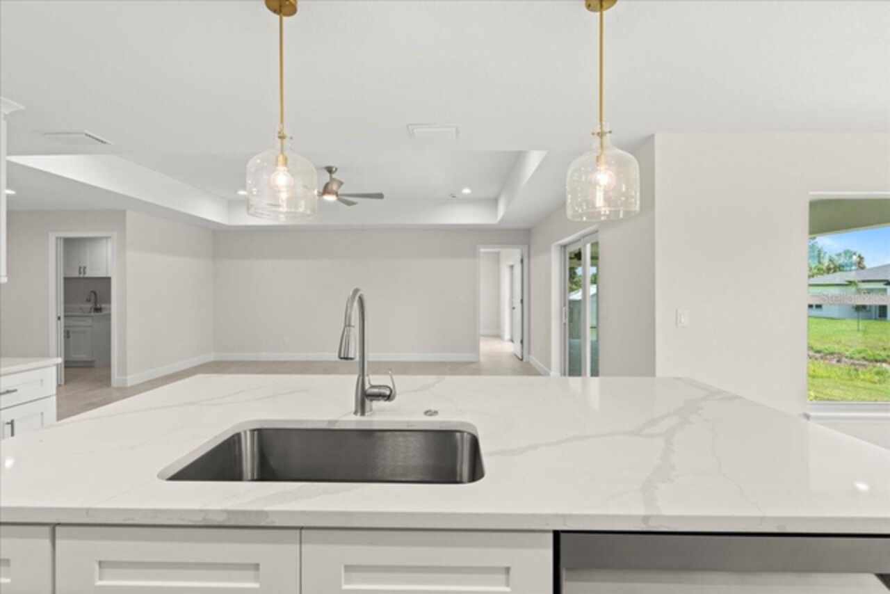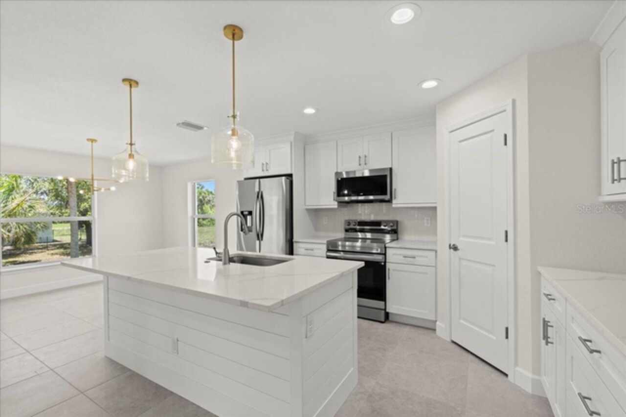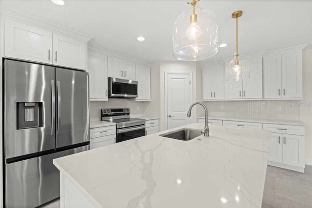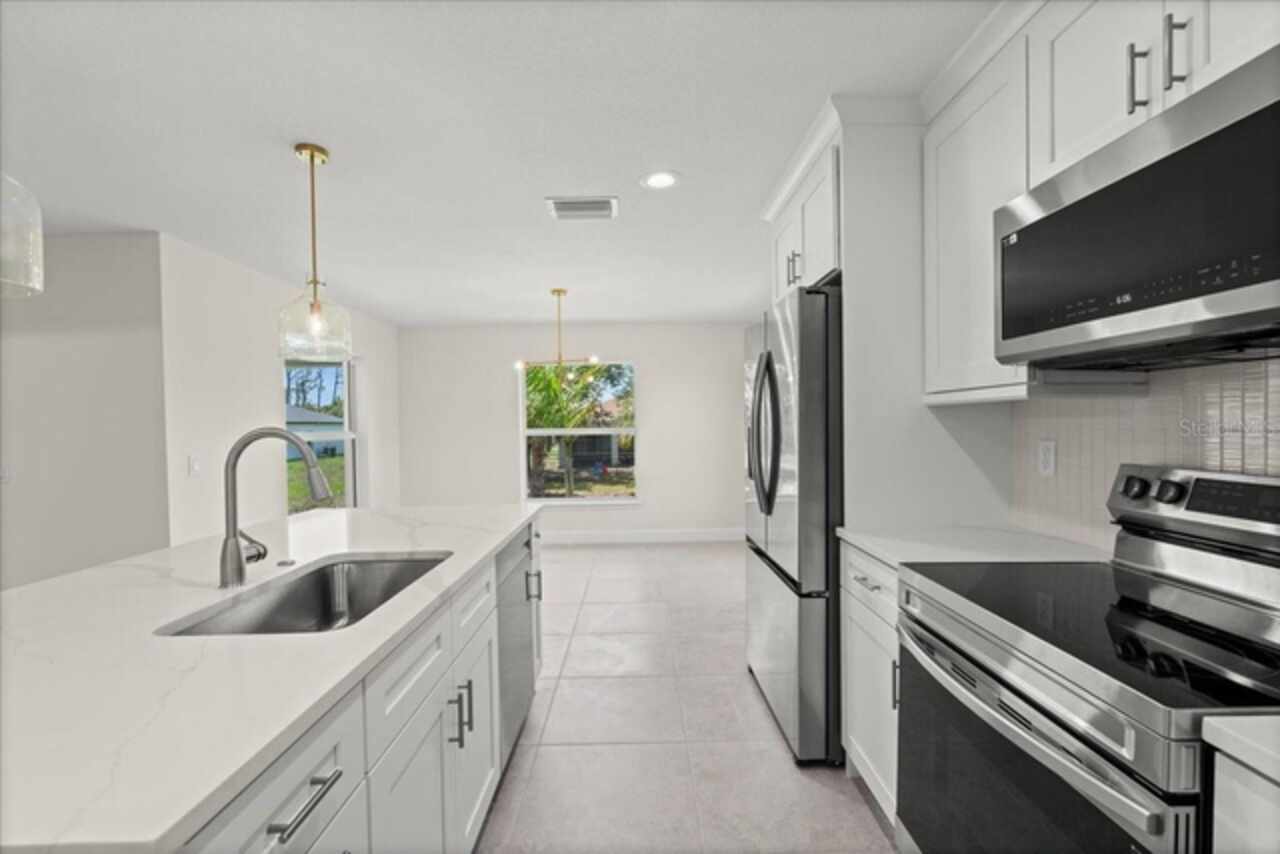 Brand-New 3-Bedroom Home in X Flood Zone Move right into this beautifully built 3-bed, 2-bath concrete block home combining modern style with thoughtful features. Enjoy a 2-car garage with epoxy chip floors, a Rain Bird irrigation system, architectural shingle roof, full gutter system, and attractive Boston hip roof design. PGT impact windows and sliders offer storm protection and energy efficiency. Inside, you’ll find quartz countertops, shaker cabinets, Samsung appliances, and a sleek tile backsplash in the kitchen. Porcelain tile runs throughout, with tray ceilings adding style and space. The primary suite features a walk-in closet and dual vanity bath. Front and back porches with spraycrete flooring extend your living outdoors. Low-maintenance, high-quality, and ready for you—schedule your showing today!
