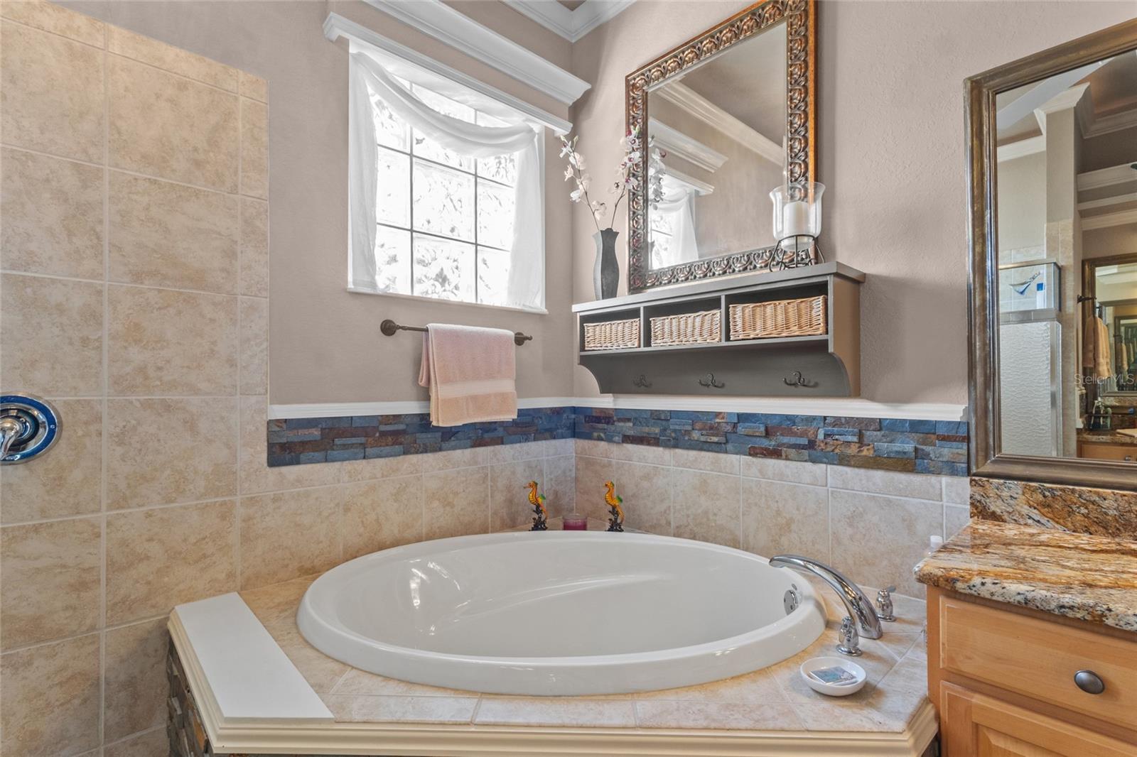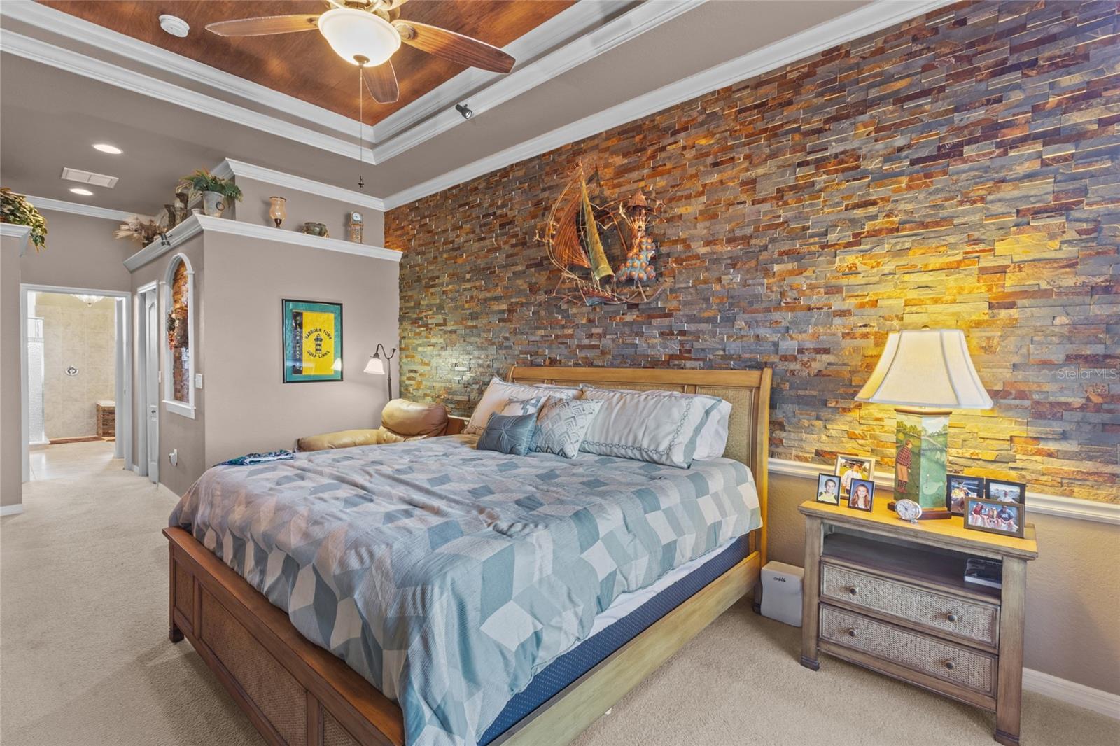 Built-in Features, Ceiling Fans(s), Crown Molding, Dry Bar, High Ceilings, Kitchen/Family Room Combo, Open Floorplan, Primary Bedroom Main Floor, Solid Wood Cabinets, Split Bedroom, Stone Counters, Tray Ceiling(s), Window Treatments