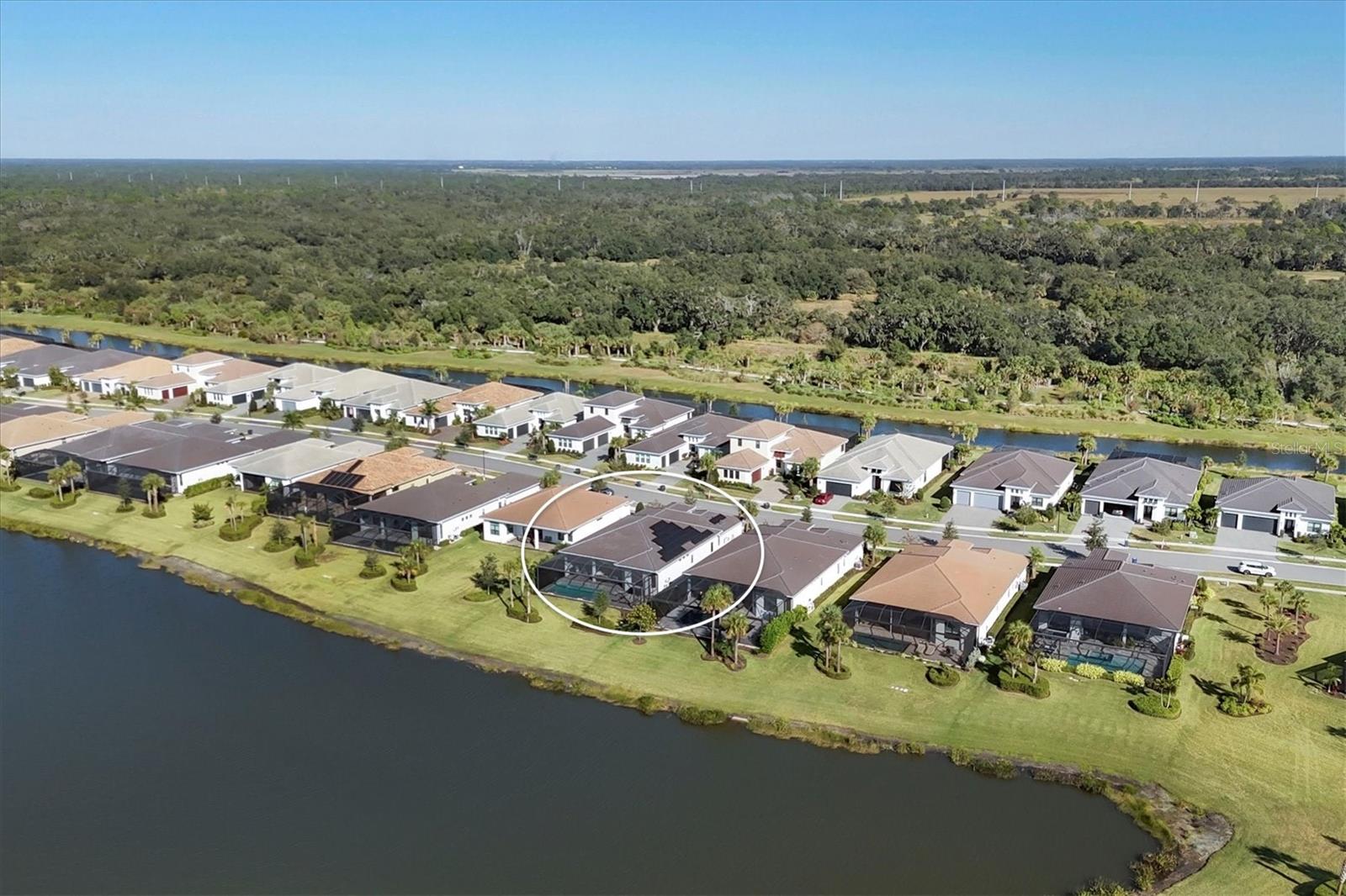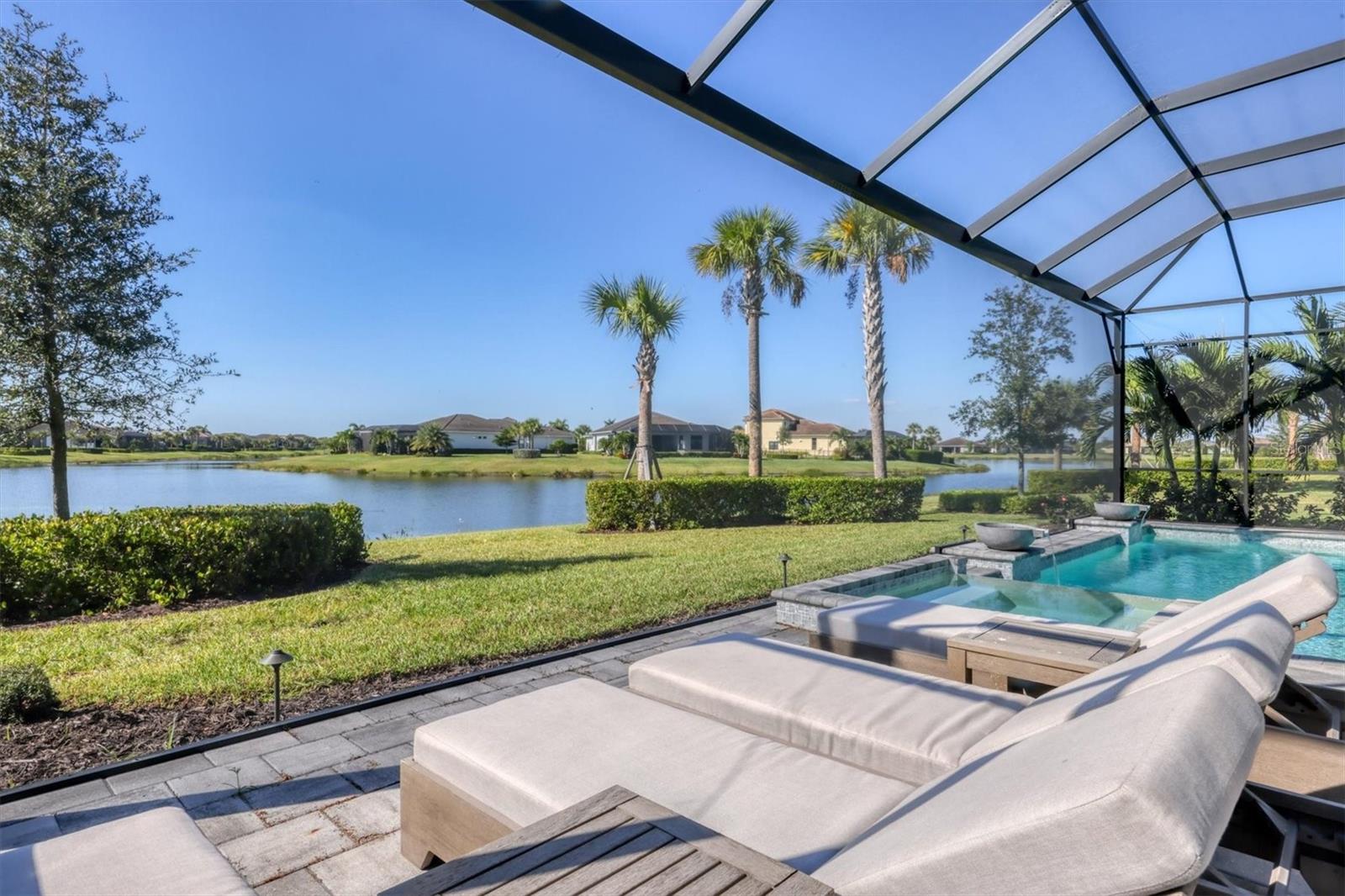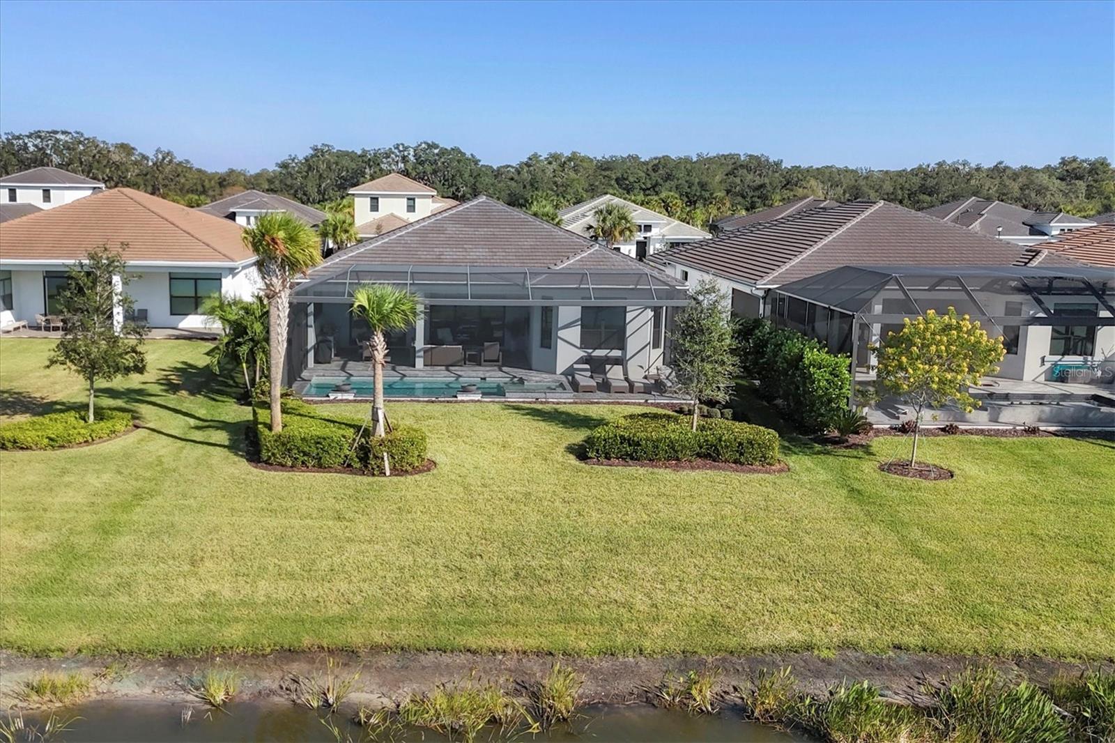 Welcome to 9088 Bernini Place a move-in-ready, open-concept home that truly has it all, offering three bedrooms, a den/office, three full bathrooms, and a heated pool/spa with tranquil water views. Located in the gated Artistry community, the home was built in 2022 and comes complete with Impact Windows and Doors, a Tesla Solar System to reduce your electric costs, a Whole-House Generac Generator for peace of mind, a Panoramic Lanai Screen and Summer Kitchen for enhanced outdoor living, Built-in Speakers in the Living Room and Covered Lanai, a Water Softener, Central Vacuum, Alarm System with Cameras, and Natural Gas. As you arrive, you will notice the paver driveway/walkway leading to the covered front porch & custom-built front door. This unique one-piece door not only elevates the home’s curb appeal but also offers privacy or transparency at the click of a button. Upon entering, you are greeted by Luxury Vinyl Flooring that runs throughout the home, with tile in the bathrooms. A tray ceiling in the foyer and crown molding throughout the main living areas and primary bedroom add a touch of elegance. Recessed lighting is found in every area of the home, providing ample lighting in addition to designer-selected light fixtures throughout, with large windows and exterior doors inviting plenty of natural light inside. The stunning kitchen features an expansive waterfall island with quartz countertops that continue seamlessly into the backsplash. An abundance of soft-close cabinetry in two-tone colors ensures ample storage with thoughtful design touches, complemented by over-cabinet and under-cabinet lighting. For the chef in the home, there is a built-in gas cooktop with a stainless steel hood & double ovens. All three bedrooms are thoughtfully separated for privacy, each appointed with designer ceiling fans. The spacious primary suite includes a tray ceiling, bay windows, motorize blinds, a luxurious bathroom featuring floor-to-ceiling tile, a free-standing soaking tub, and a walk-in shower. A lengthy quartz vanity incorporates a dressing table between the two sinks, and a large walk-in closet completes the suite. The two additional bathrooms (one an ensuite) also feature quartz countertops and walk-in showers. The den/office is finished with a beautiful coffered panel accent wall with built-in shelving & storage. For added convenience, the home includes a full-size laundry room with storage cabinets, quartz countertop, and a sink. Additional storage is located near the entry to the two-car garage. A true highlight of this home is the spacious paved outdoor living area, offering both covered and open sun-exposed spaces within the screened lanai overlooking a peaceful water view. This is where you’ll find yourself enjoying the Florida lifestyle, whether preparing dinner at the outdoor kitchen, dining al fresco, watching the big sports game, entertaining family and friends, lounging in the sun, cooling off in the pool, relaxing in the spa, or enjoying your morning coffee while watching the birds. The HOA fee of $1, 315 quarterly covers exterior landscaping & mulching, as well as home internet. Residents also have access to a resort-style pool, fully equipped fitness center, yoga studio, clubroom, pickleball/basketball court, playground, and a scenic walking trail. NO CDD FEE. Grocery stores, retail options, and I-75 are minutes away, with Downtown Sarasota, Gulf Beaches, UTC Mall, numerous Golf Courses, and Parks all a short drive away.