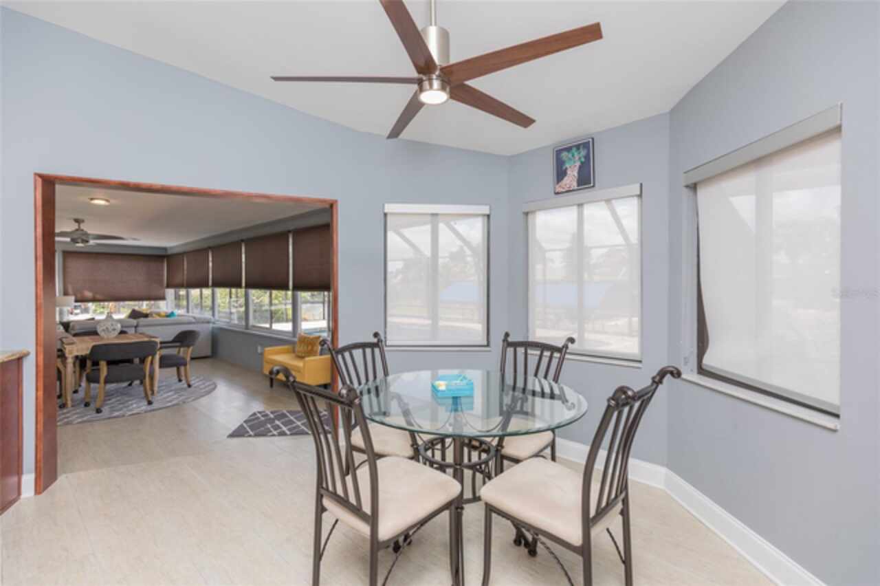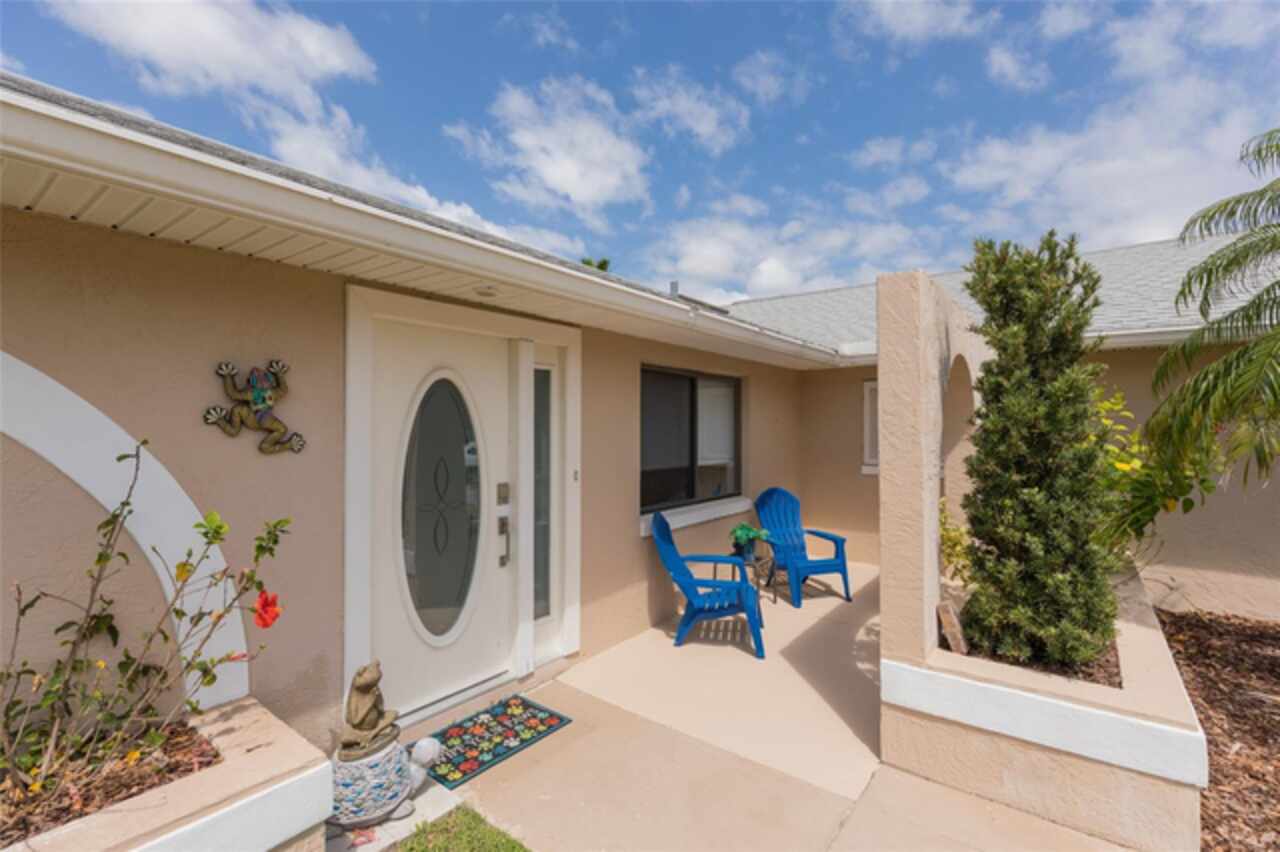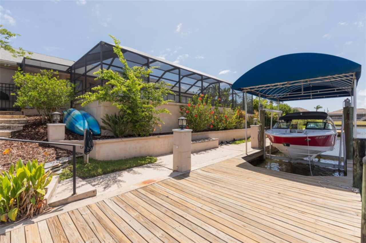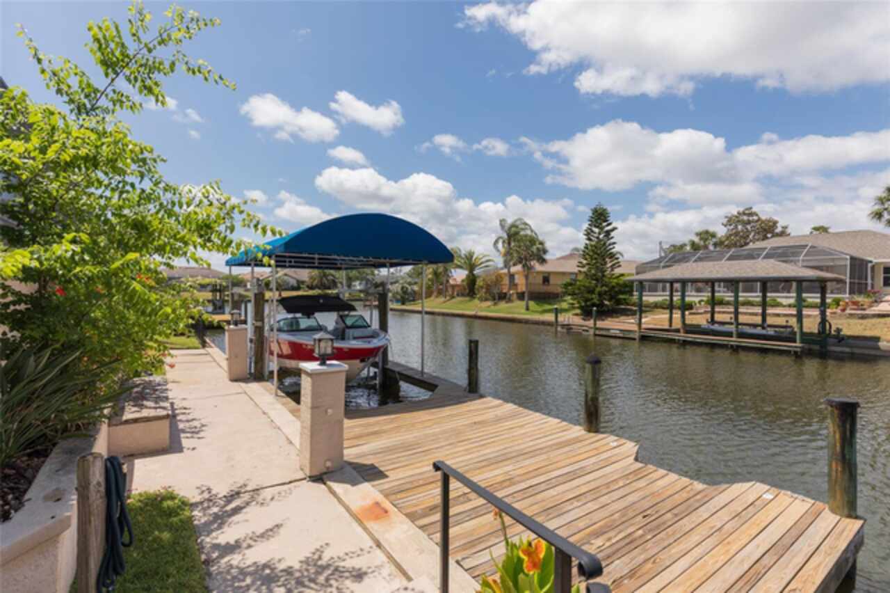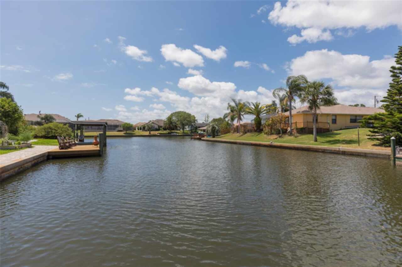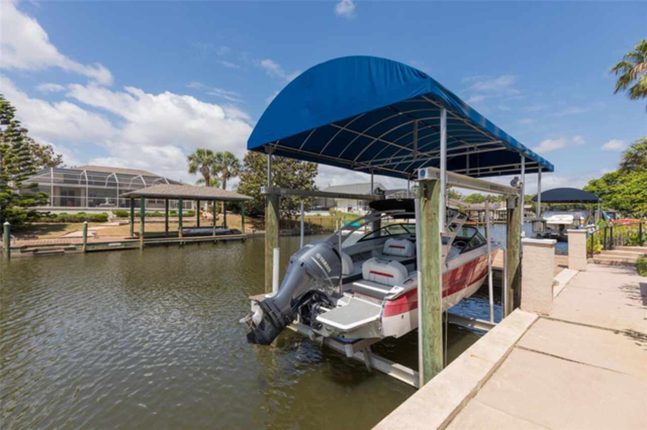 Under contract-accepting backup offers. Bring your boat and relax by the pool in this beautiful canal home. This home has been updated and lovingly cared for. It features 3 bedrooms, 2 baths, large family room, living room, eat in kitchen, separate laundry room and chef’s kitchen. Large primary suite with office room attached, large walk in closet and bath. Sit out at the pool and watch the dolphins swim by in the canal. New AC in 2024, new hot water heater. Pool equipment installed in 2019, fenced in area (dog run). Best of all there has been added a new boat lift with a capacity for 8000 lb boat and new canopy to protect your boat.This home is ready for your full time living or winter get away from the cold. Come see this home priced to sell. Holiday price reduction - Motivated Seller’s! Ceiling fans in living room and family room do not convey but will be replaced or given a credit. Refrigerator does not convey but a stainless steel one will replace it.