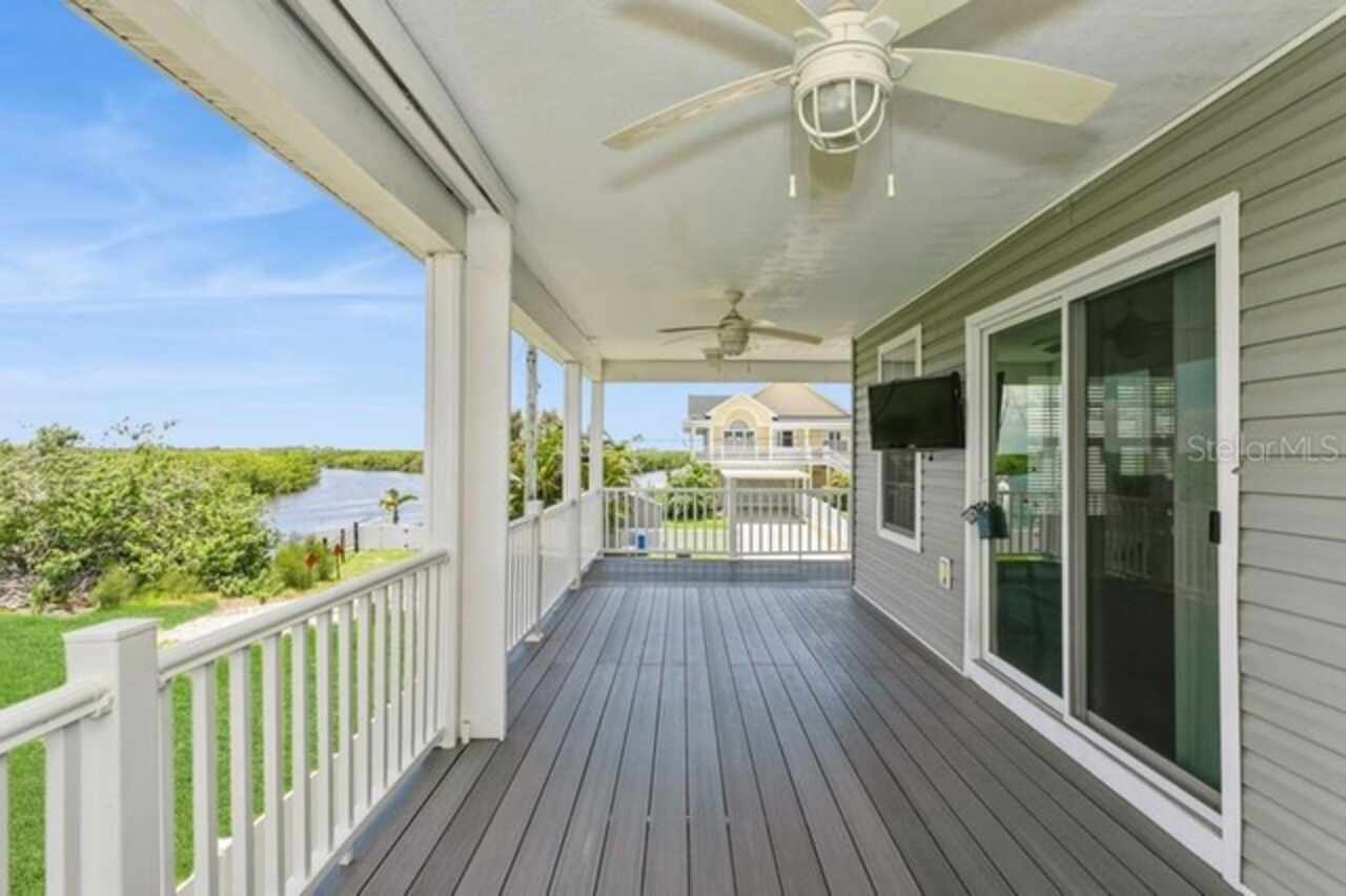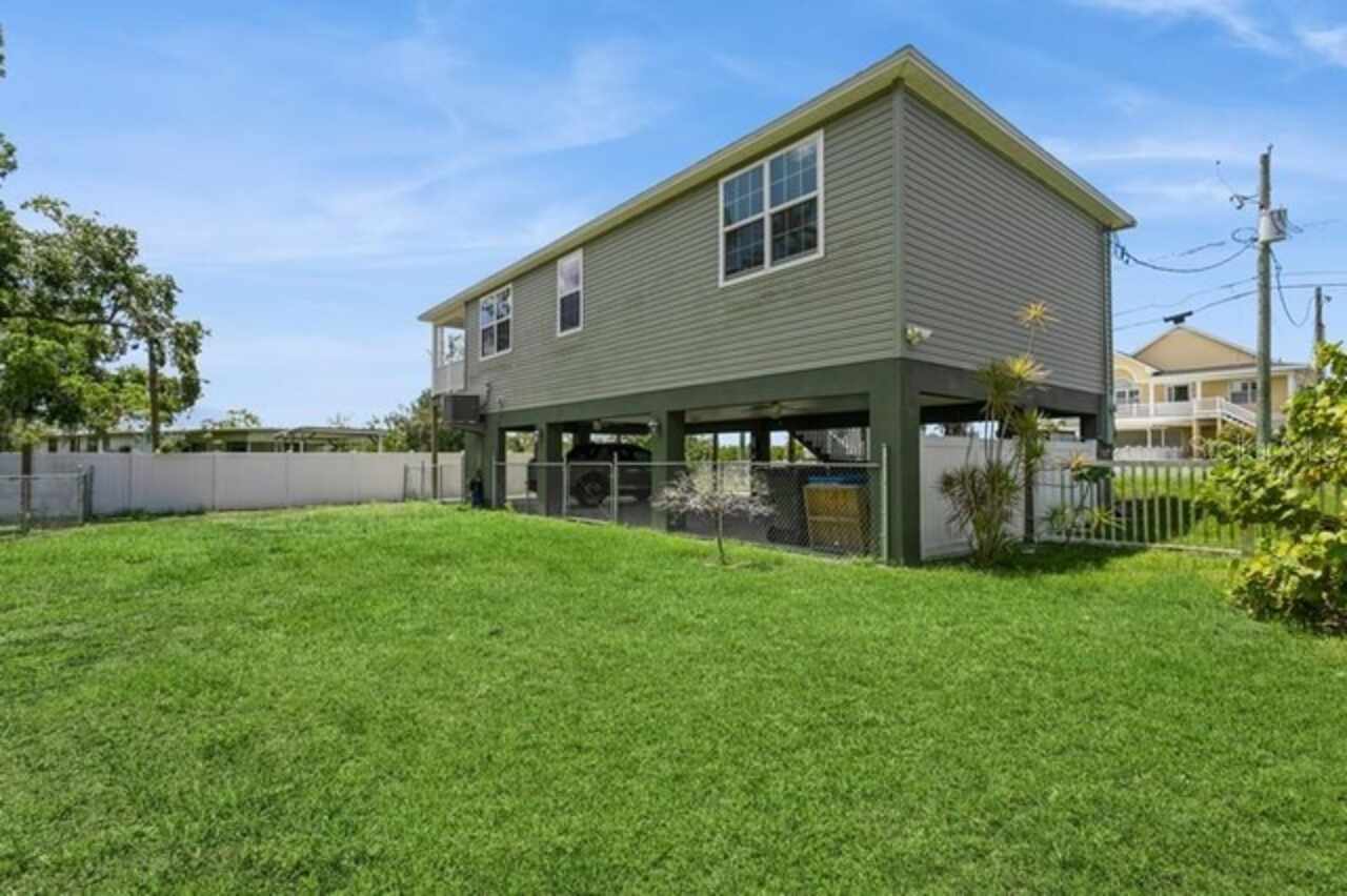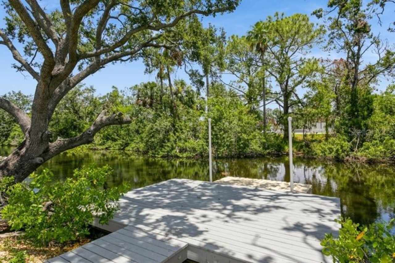 Welcome Home to Your Waterfront Living! Discover this exceptional three-bedroom, two-bathroom stilt home, perfectly nestled on a quiet dead-end street. This fully fenced property features an entrance gate, providing both privacy and peace of mind. Built on an elevated foundation, this home has had no flood issues, allowing you to enjoy the wraparound deck, where you can take in beautiful sunsets while relaxing outdoors. The spacious covered carport offers ample parking and is ideal for entertaining. Brand new Telsa charger for electrical vehicles. Inside, you'll find a newly painted interior and exterior complemented by stunning wood floors, ceiling fans in family room and bedrooms. Spacious primary bedroom, tiled walk-in shower in Ensuite The kitchen is a chef's delight, boasting 42” wood cabinets, a decorative backsplash, stainless steel appliances, stainless steel farm sink, and plenty of counter space for meal prep. New washer/dryer, also BRAND NEW AC CONDENSING UNIT JUNE 2025. Abundant windows throughout flood the home with natural light, The family room looks out onto conservation and water views. Step outside to your fenced backyard haven, which features canal waters with wood deck and a brand new floating dock, the canal leads you out to Old Tampa Bay waterways—perfect for waterfront dining and recreation. NO HOA FEES Conveniently located near shopping, dining, entertainment, Rocky Point Golf Course, Tampa International Airport, Tampa International Mall, and just a quick drive to top-rated Gulf Beaches, this home truly embodies Florida living at its best. Don’t miss out on this incredible opportunity! Schedule your private showing today.
