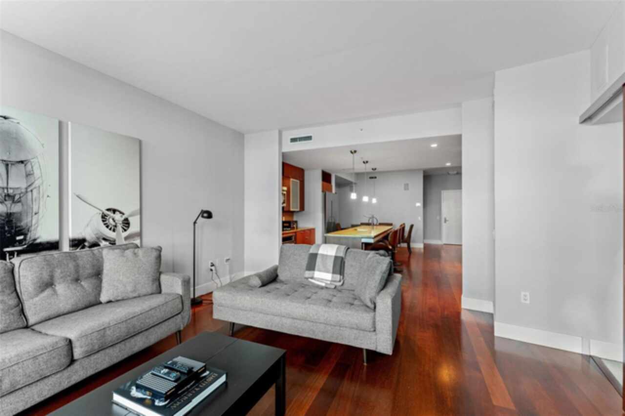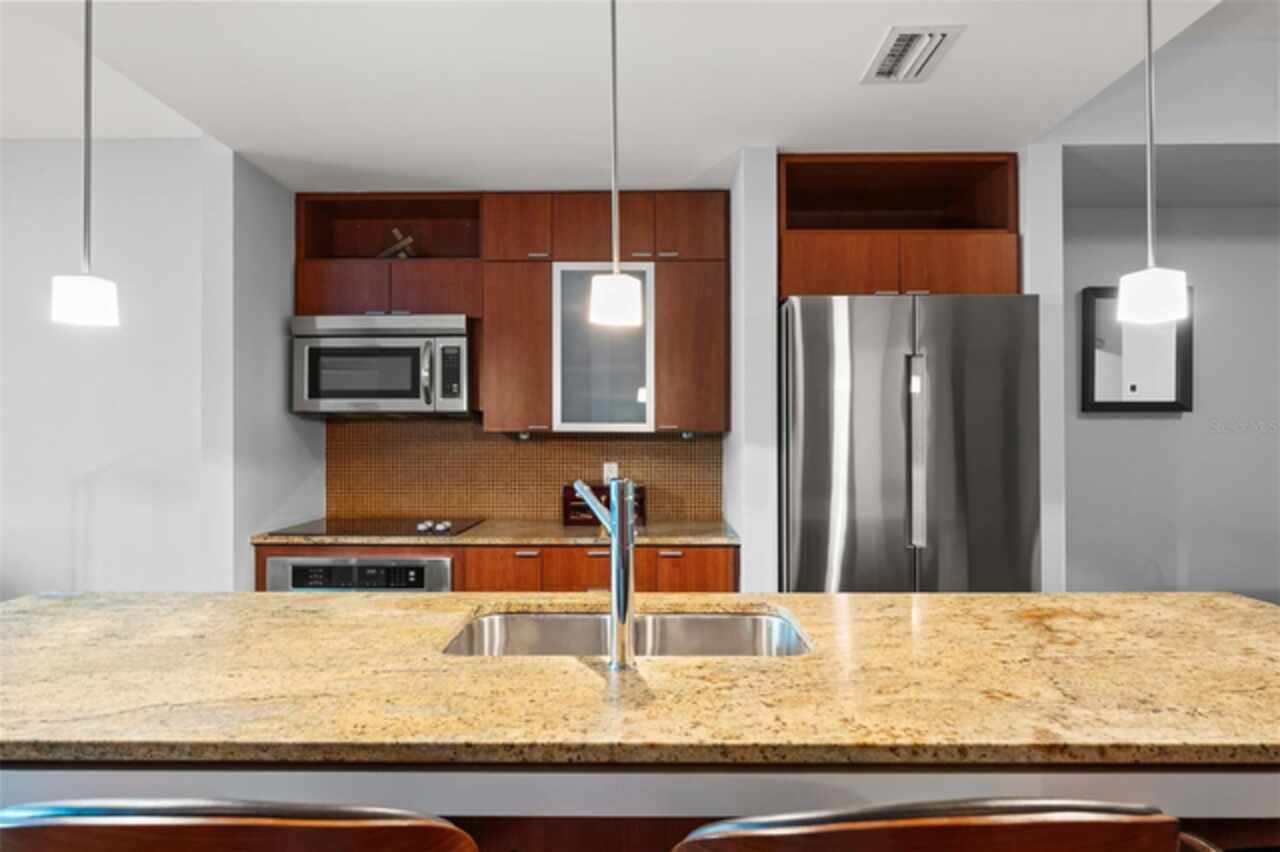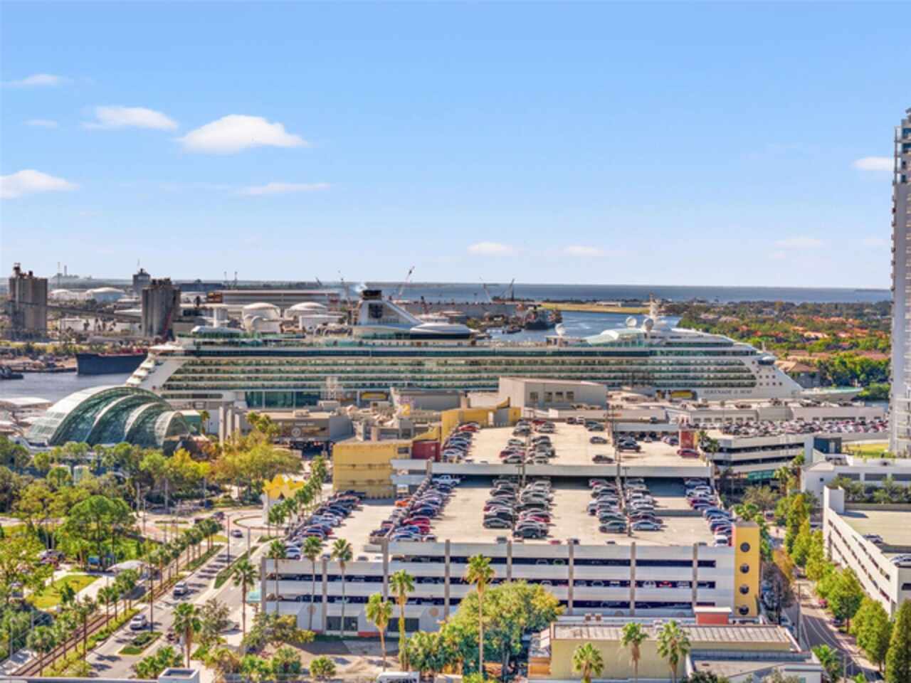 One or more photo(s) has been virtually staged. RECENT PRICE IMPROVEMENT. Beautiful, open and spacious split 2 bedroom/2 bathroom with extra large balcony comes with one reserved parking space. Enjoy your gourmet kitchen with large center-island granite countertops, sleek wood cabinetry, and stainless steel appliances. Brand new Bosch Refrigerator and brand new Samsung Washer. The home is light and bright with over-sized sliding glass doors that lead to your glass walled balcony. This corner end-unit is very convenient accessing the elevators and parking garage. The master bedroom boasts huge windows as well as a spacious walk-in closet. The en-suite bath has granite-top vanity, double-sinks, separate tub, and shower. Guest bedroom is also en-suite to 2nd bathroom. Neutral grey paint with white trim throughout, this home is truly move-in ready. Indulge in your resort-like amenities; luxurious pool/spa and surround, with lush landscaping, lounges, umbrella tables bar area and sauna with newly renovated fitness center. In the heart of the thriving Channel District with many shops, restaurants, and parks. Adjacent to Water Street Tampa with USF Morsani College of Medicine, Sparkman's Wharf and Greenwise Publix. HOA fee provides great value and includes: Basic Cable/Wireless Internet, Building/Flood Insurance, Roof/Pool/Grounds Maintenance, Building Maintenance, 7 days/week Concierge/Security and On-Site Manager and Management Office.